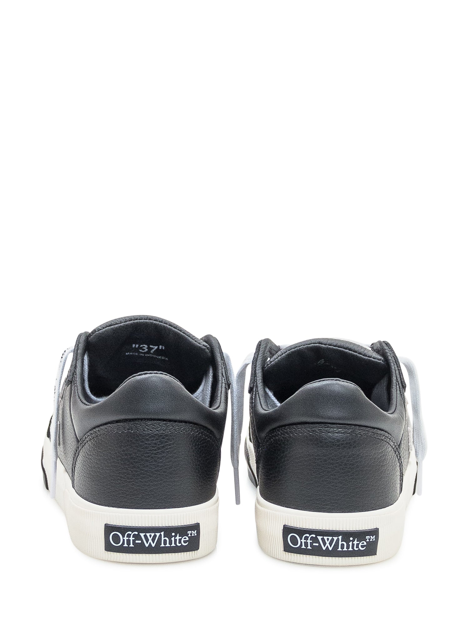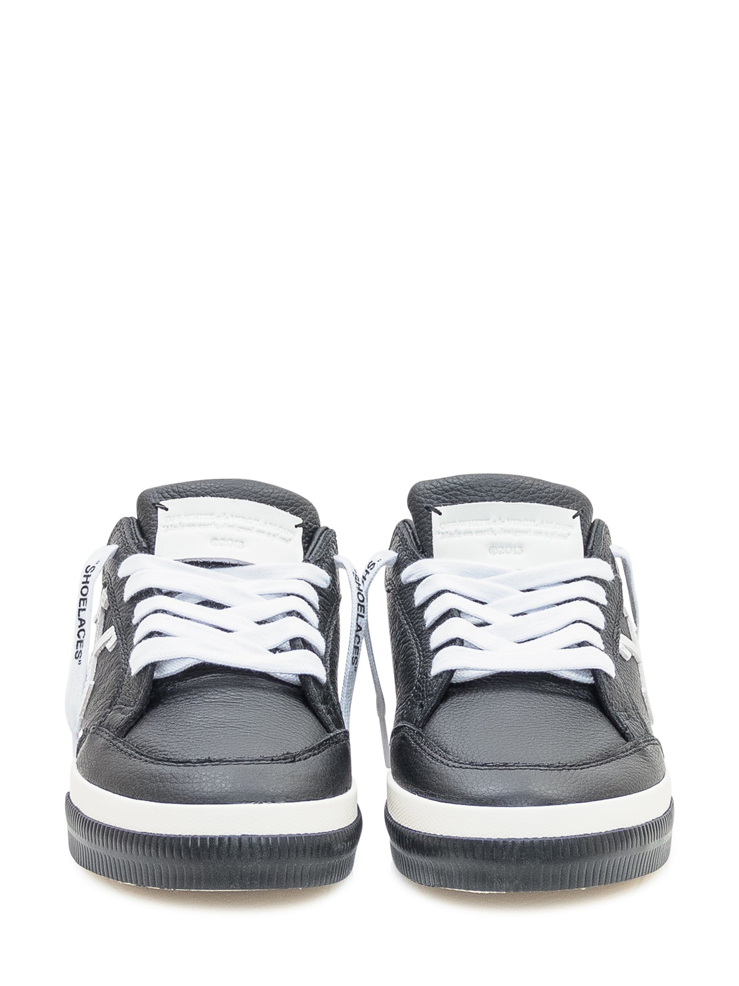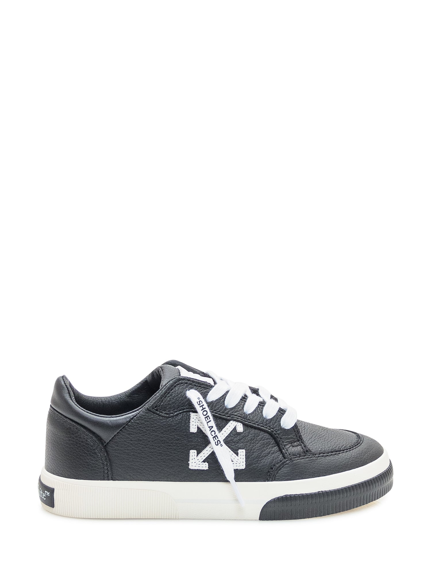 Off-White black leather sneakers with white embroidered side arrow and printed lace details.