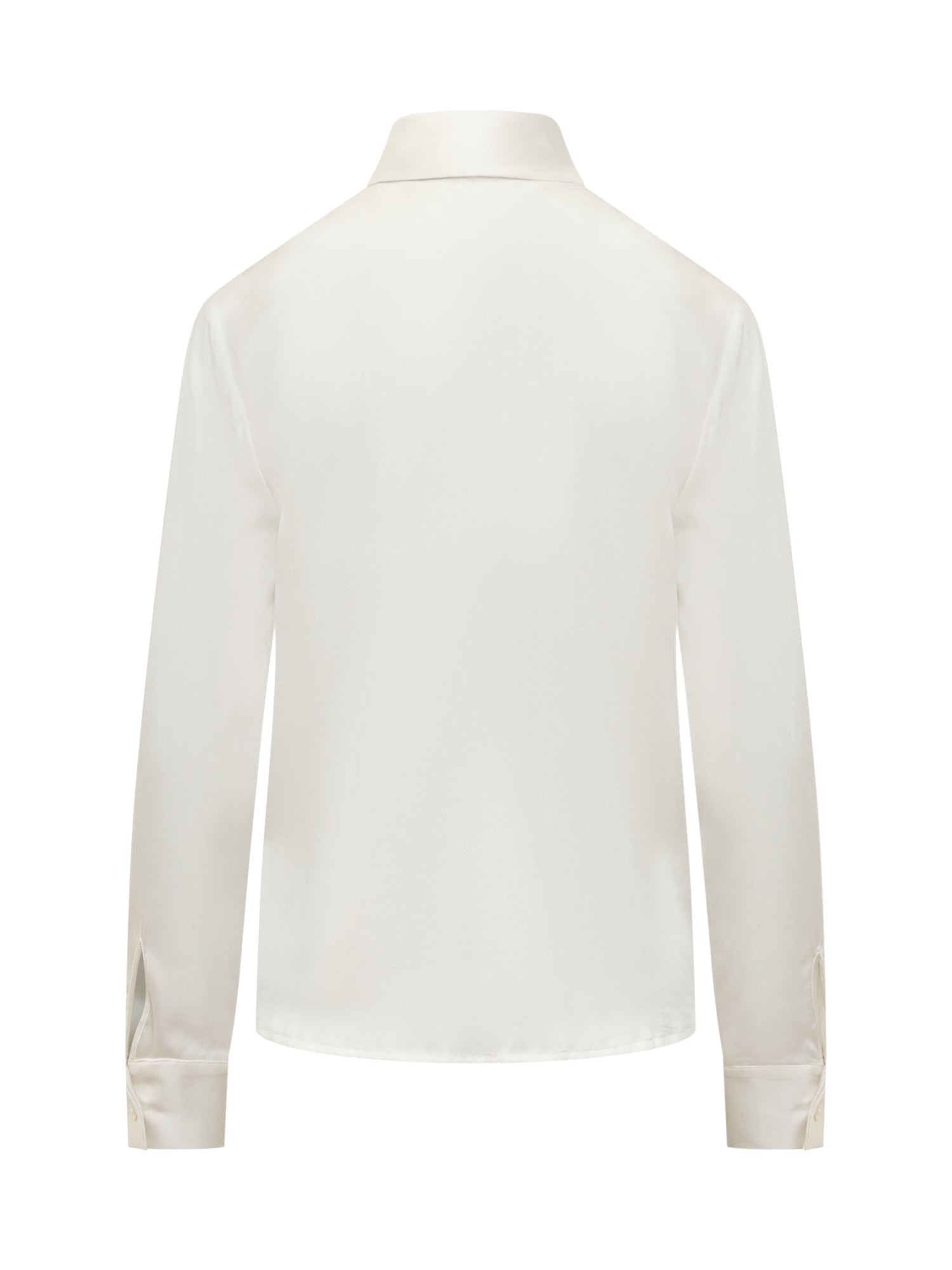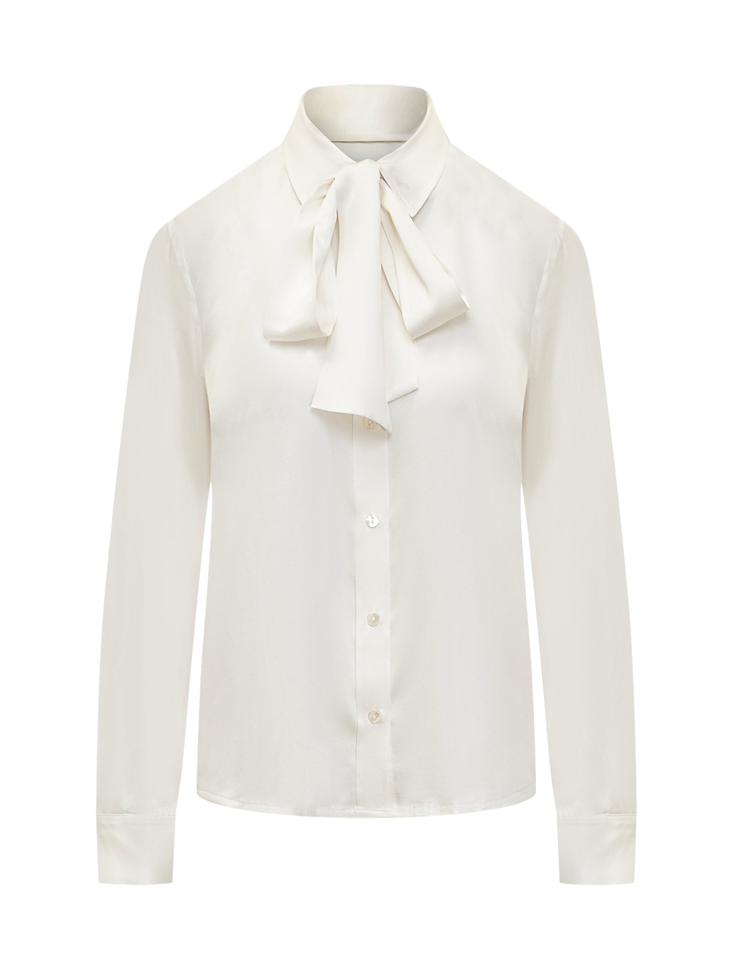 White silk shirt. High neck with bow. Cuffs with button. Closure with buttons.