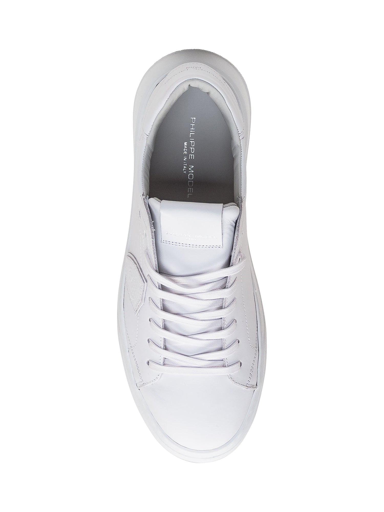 White leather sneaker. Closure with laces. Logo on tongue and heel. Side leather shield.
