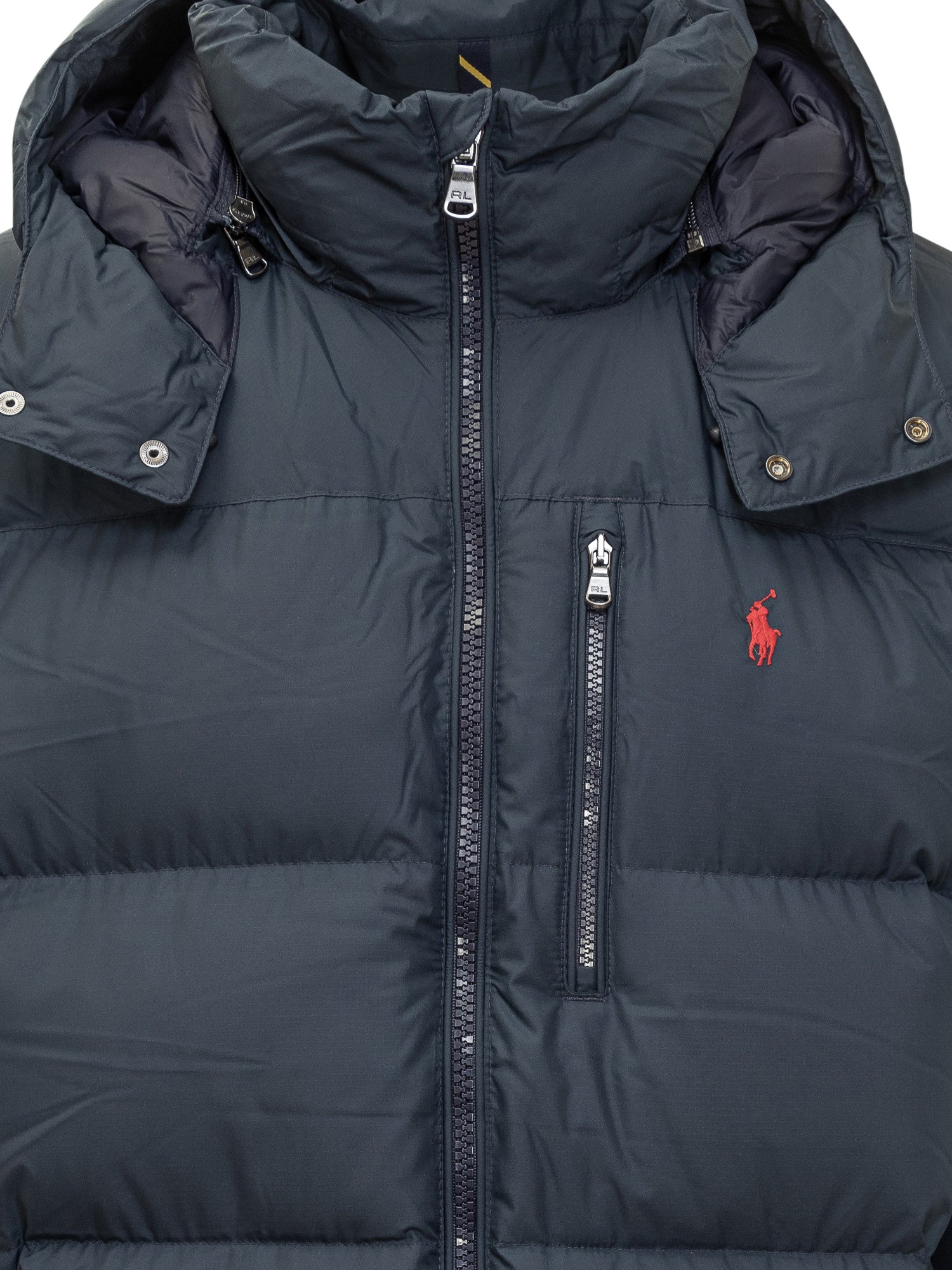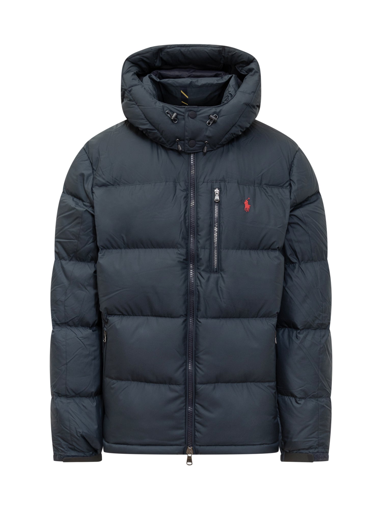 Men s blue down jacket by Polo Ralph Lauren with adjustable hood, zip closure, side pockets and embroidered logo. Ideal for cold days in style. The perfect blend of comfort and iconic design.