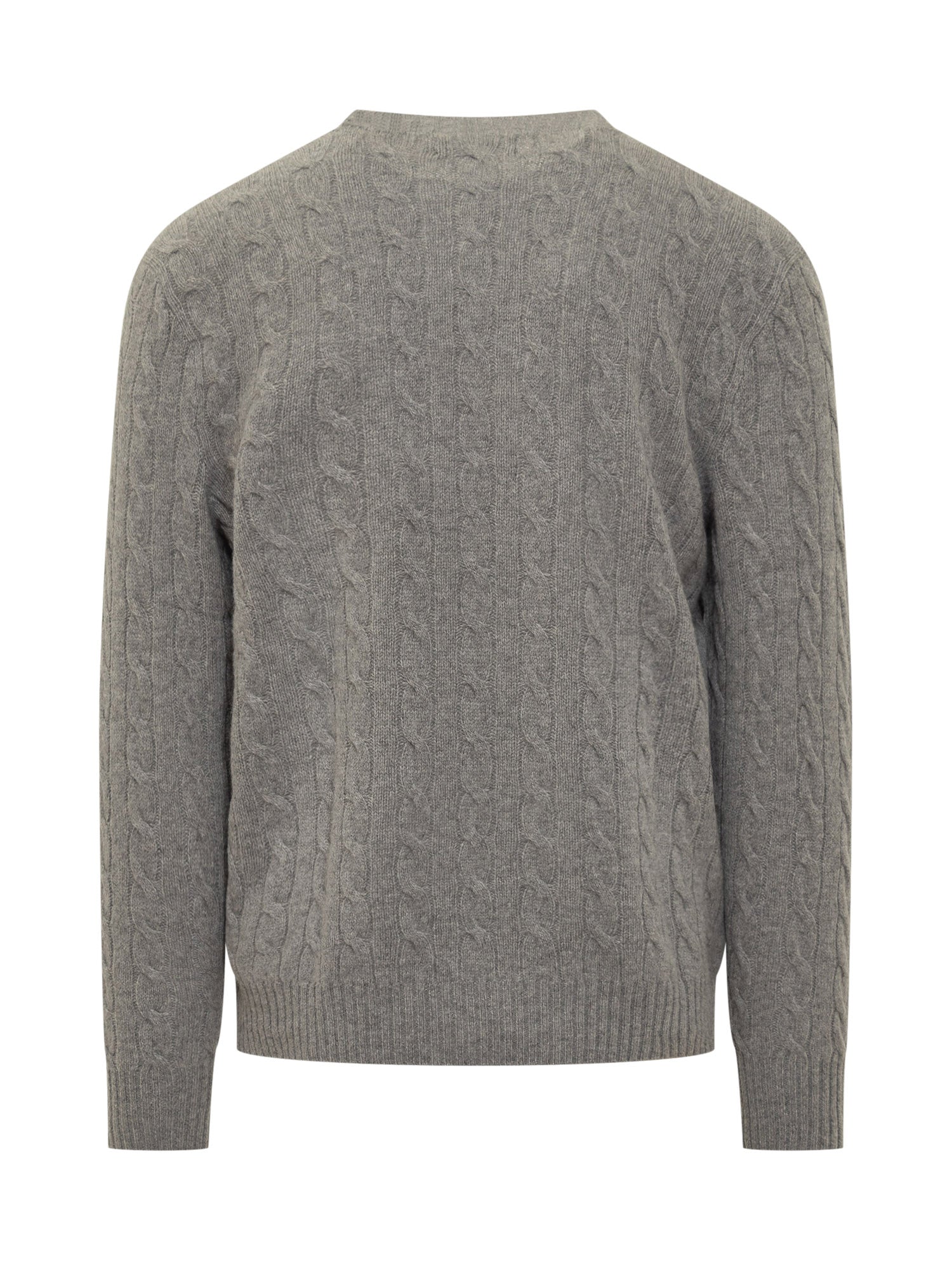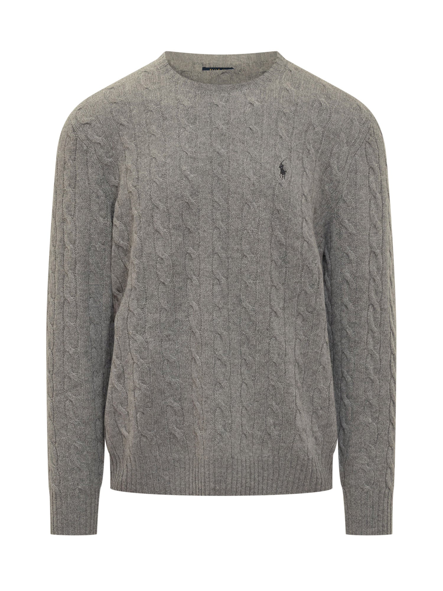 Polo Ralph Lauren grey wool cable-knit sweater with crewneck and embroidered pony logo on the chest.