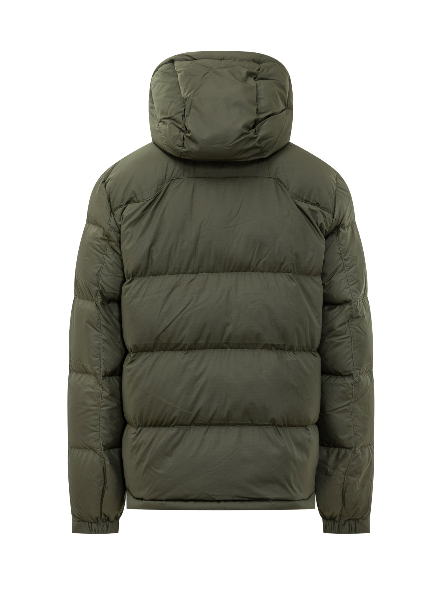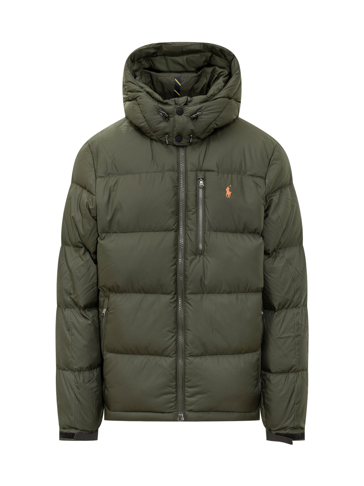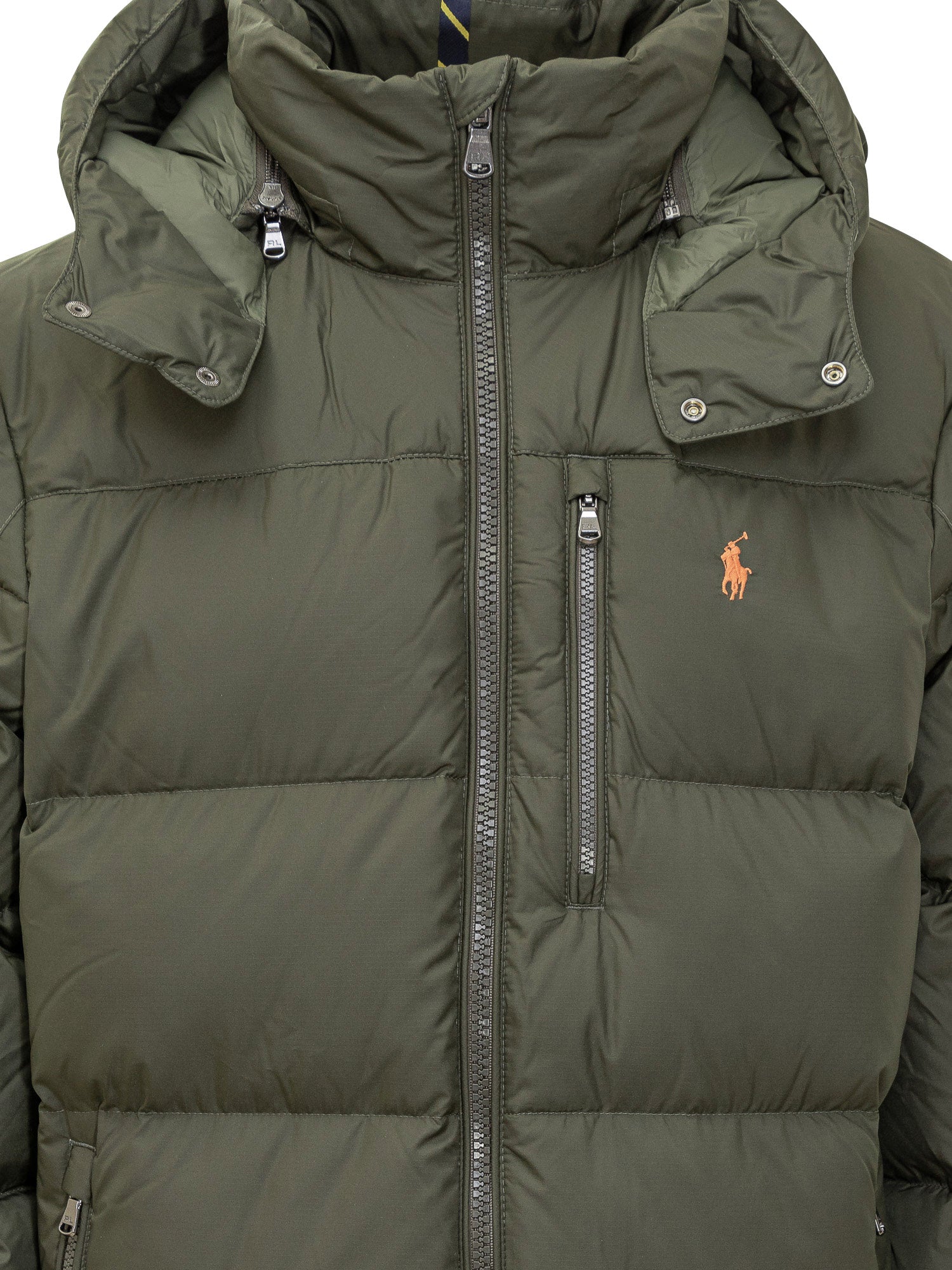 Polo Ralph Lauren down jacket in military green with adjustable hood, warm padding, and embroidered chest logo.
