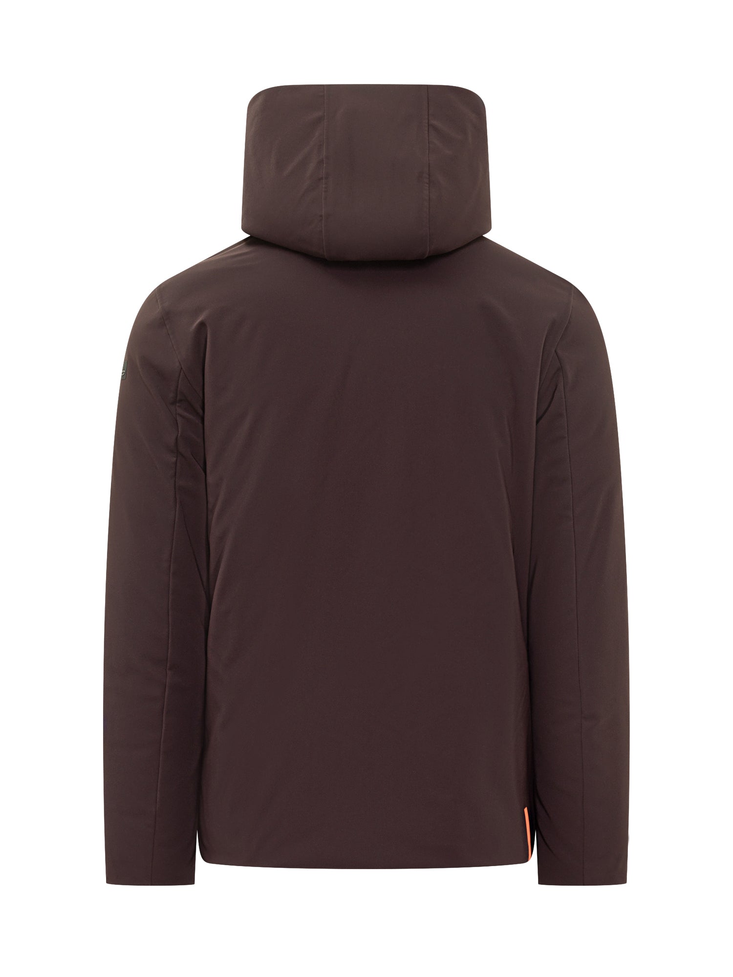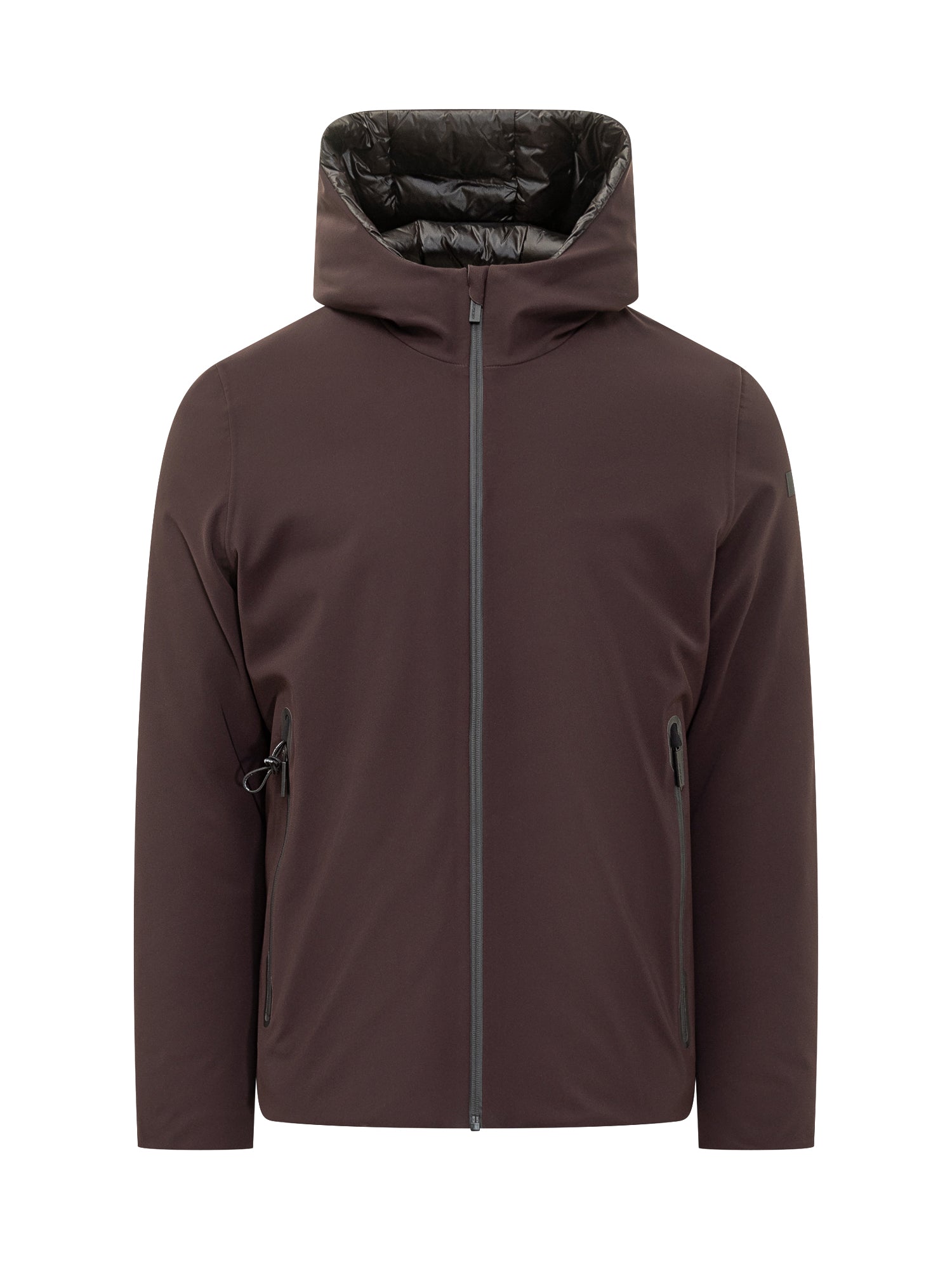 Brown RRD softshell jacket featuring padded hood, waterproof front zip and side pockets with closure.