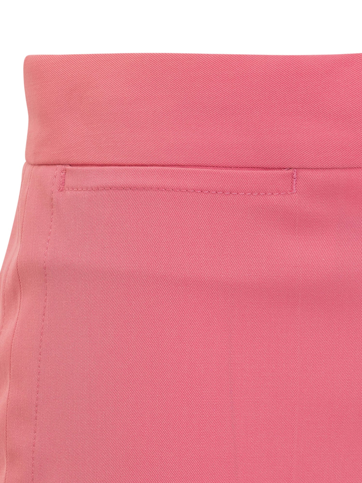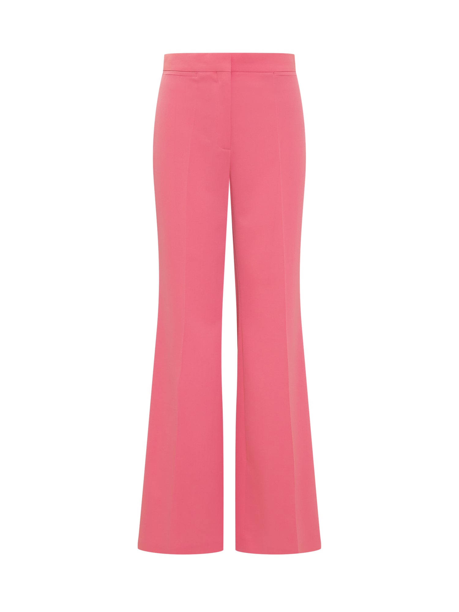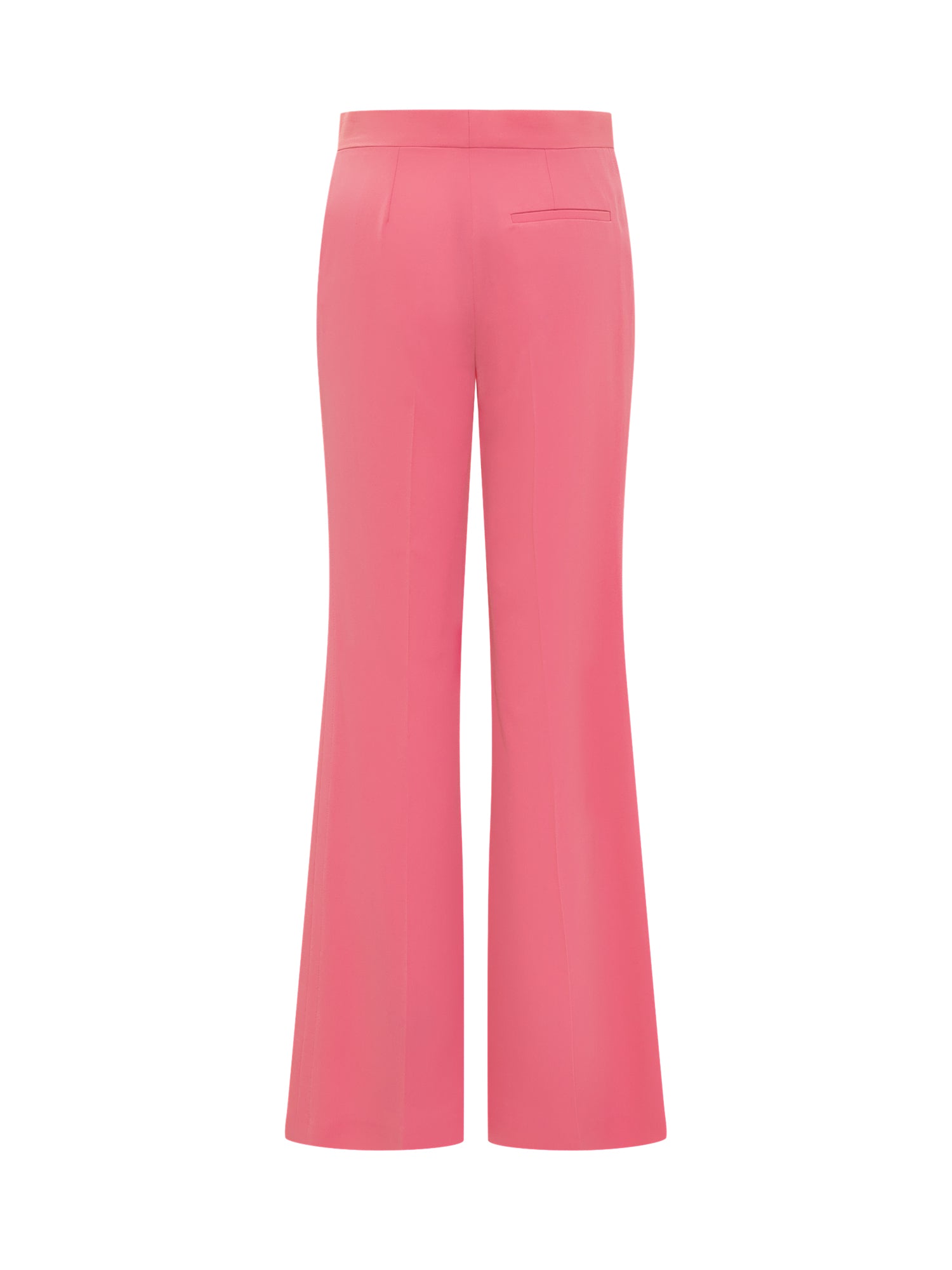 Pink long trouser. Wide flared leg. Flat pockets with stitched flap. Zipper and hook-and-eye closure.