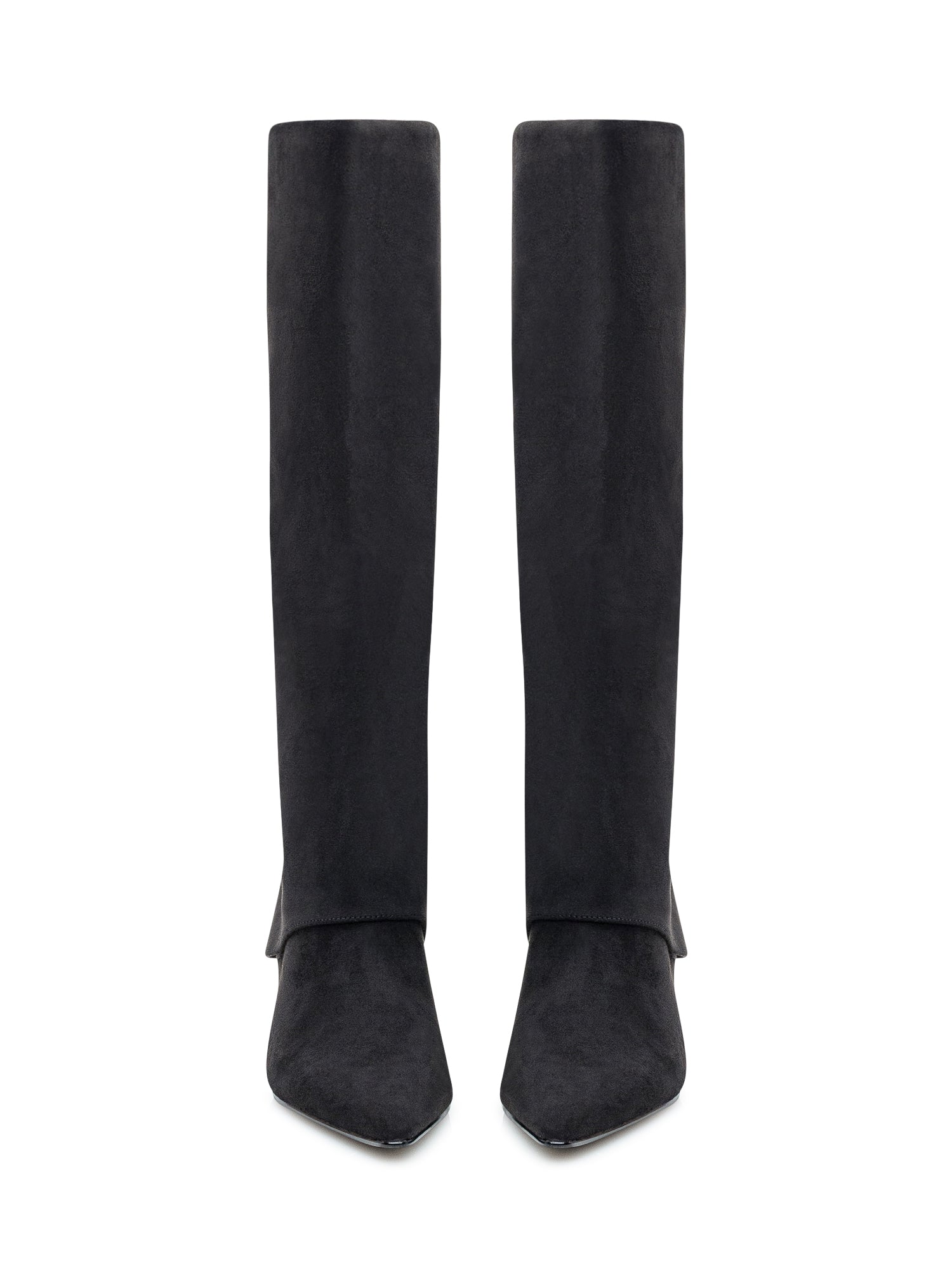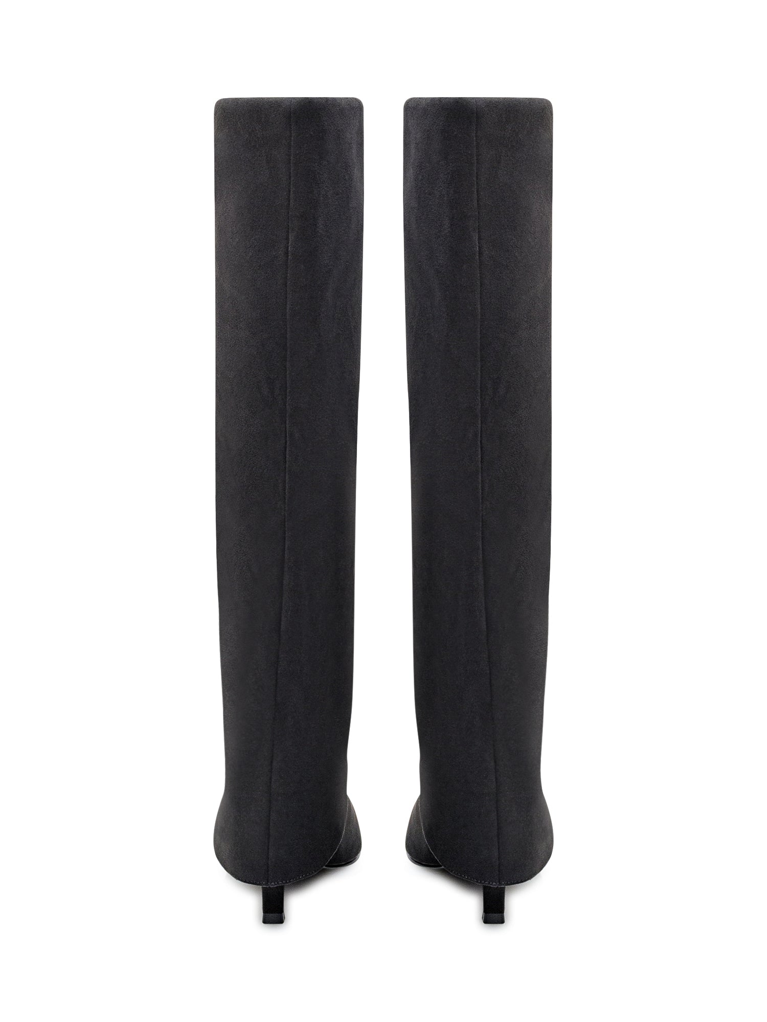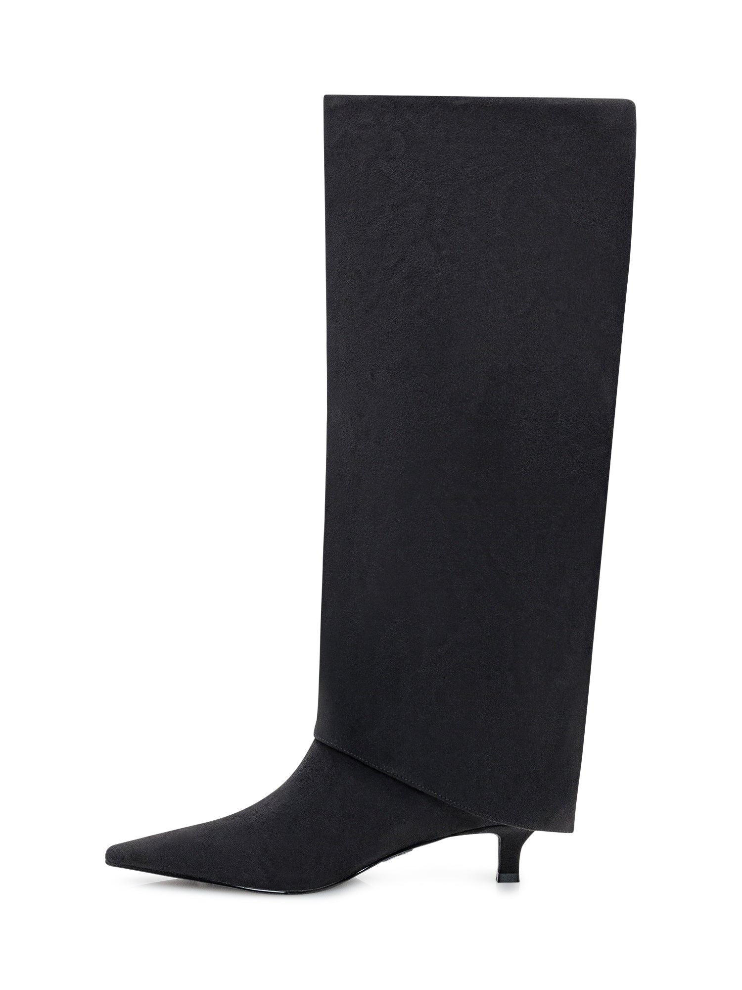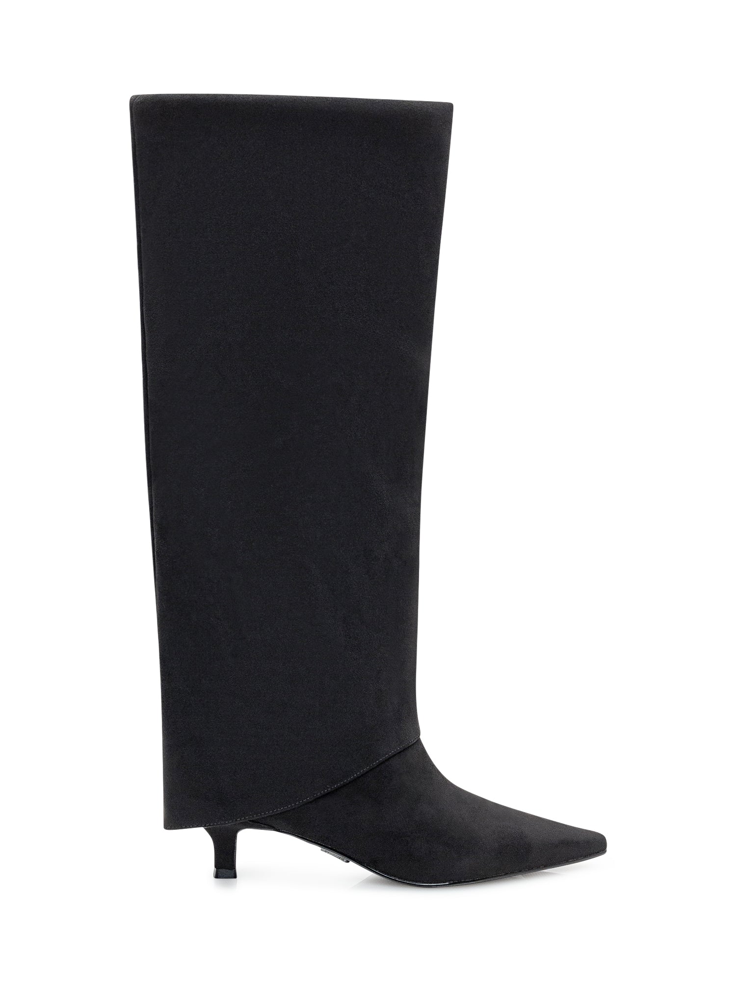 Steve Madden black fabric high boots with pointed toe and kitten heel.