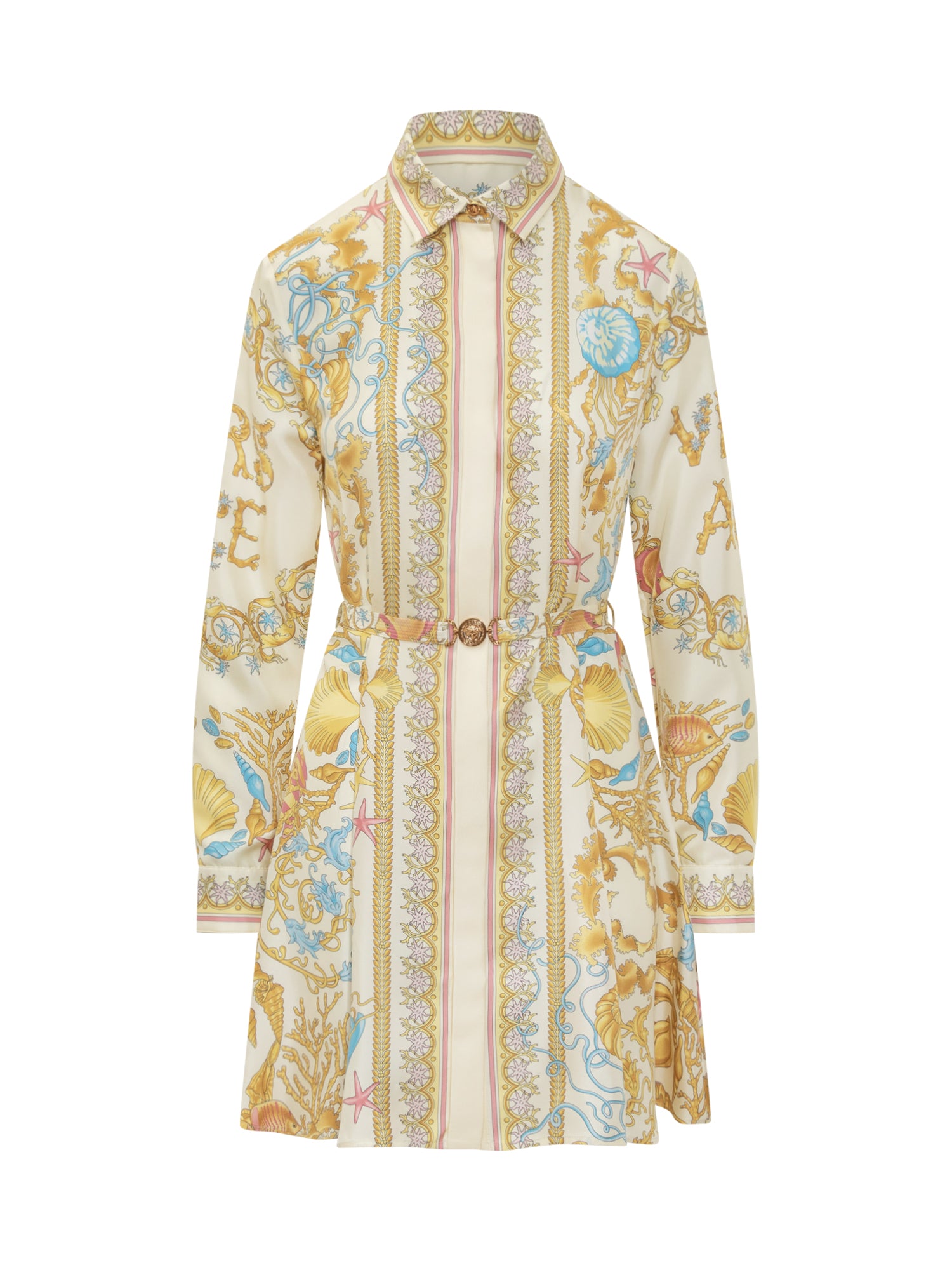 Versace mini shirt dress in marine baroque printed satin with belt and long sleeves.