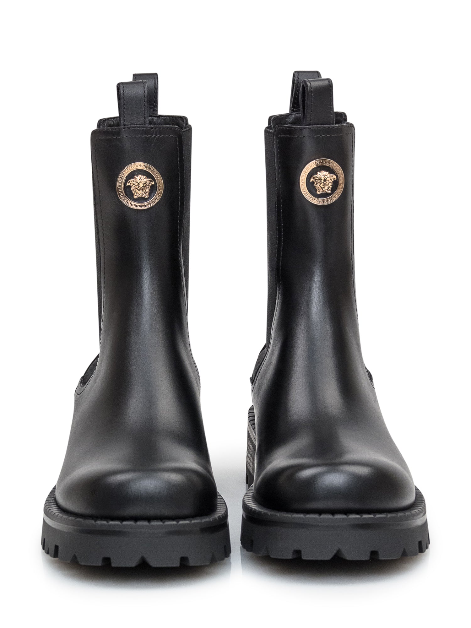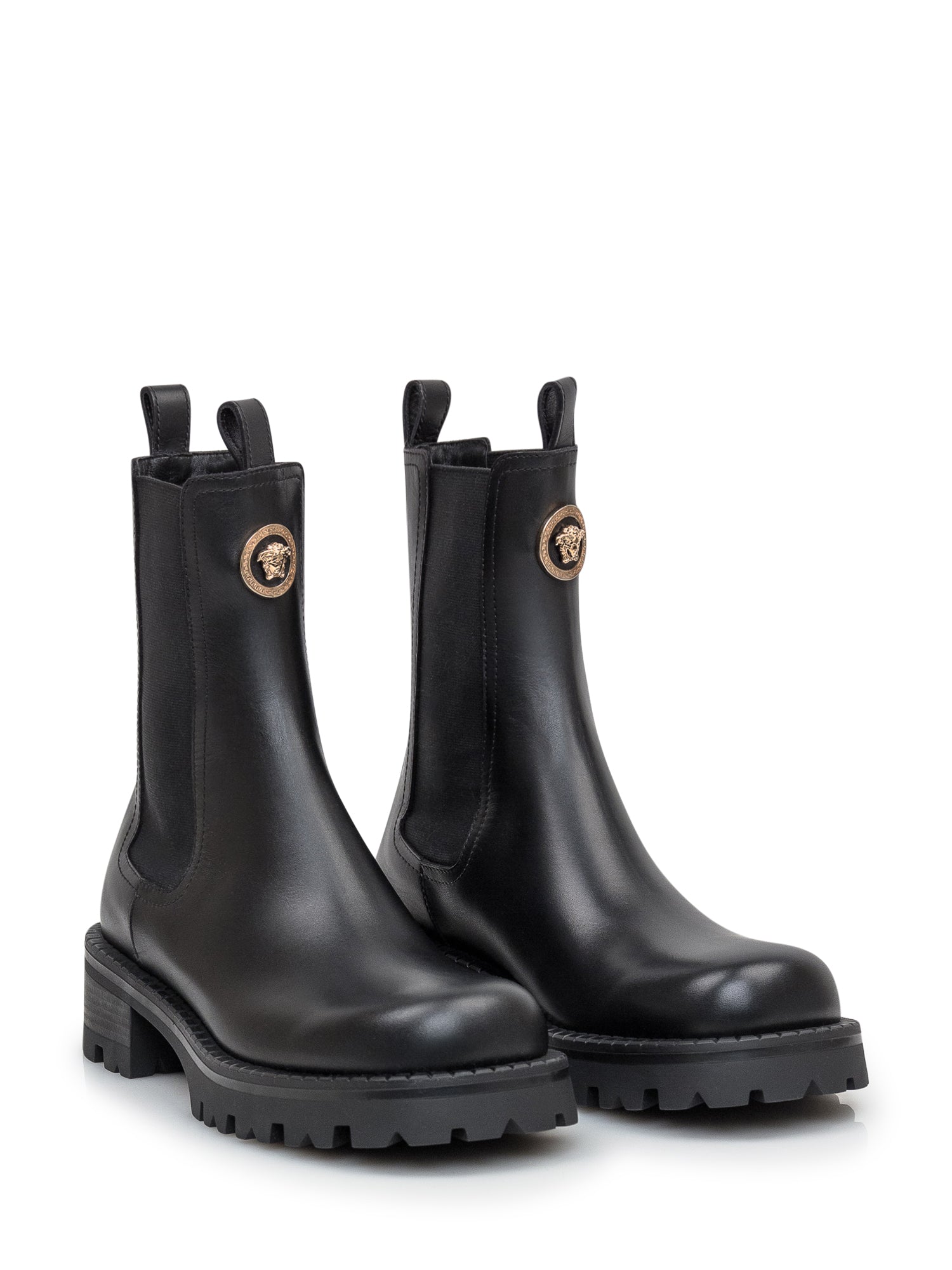 Black leather boots. Chelsea model. Golden Medusa logo. Elastic side inserts. Shaped sole.