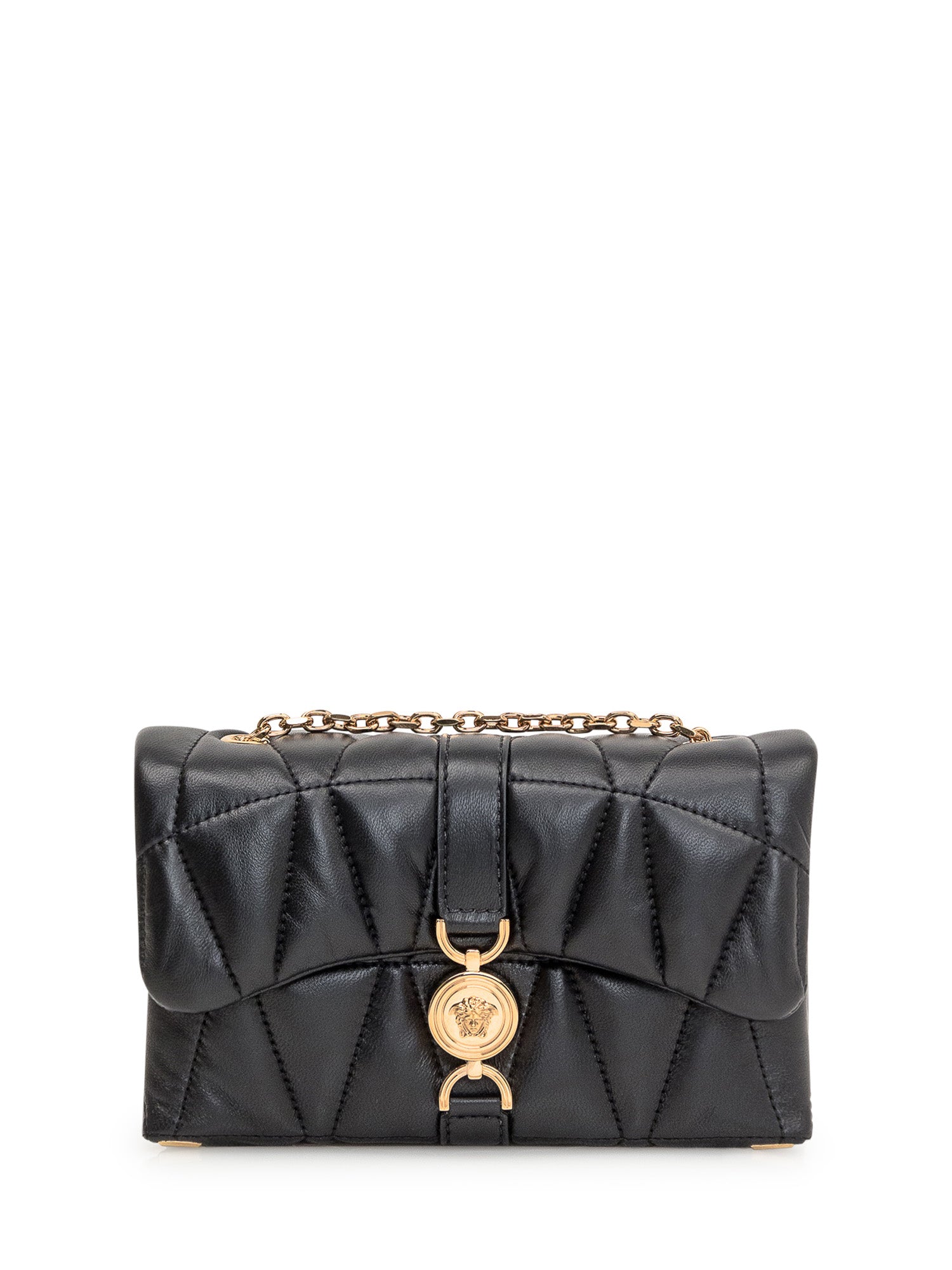 Black leather bag. Adjustable and removable shoulder strap. Two compartments and inside pocket. Magnetic button closure with Medusa logo.