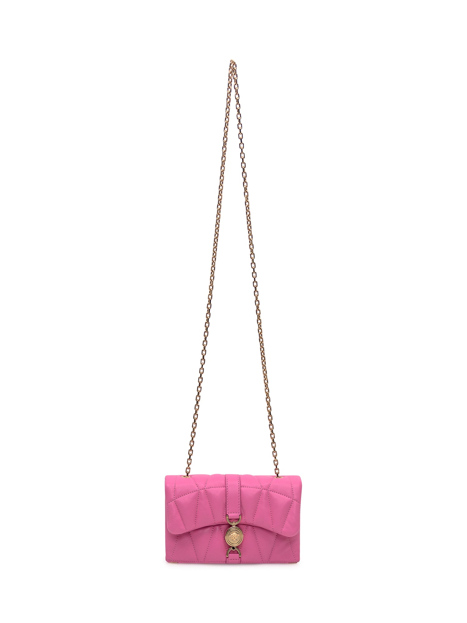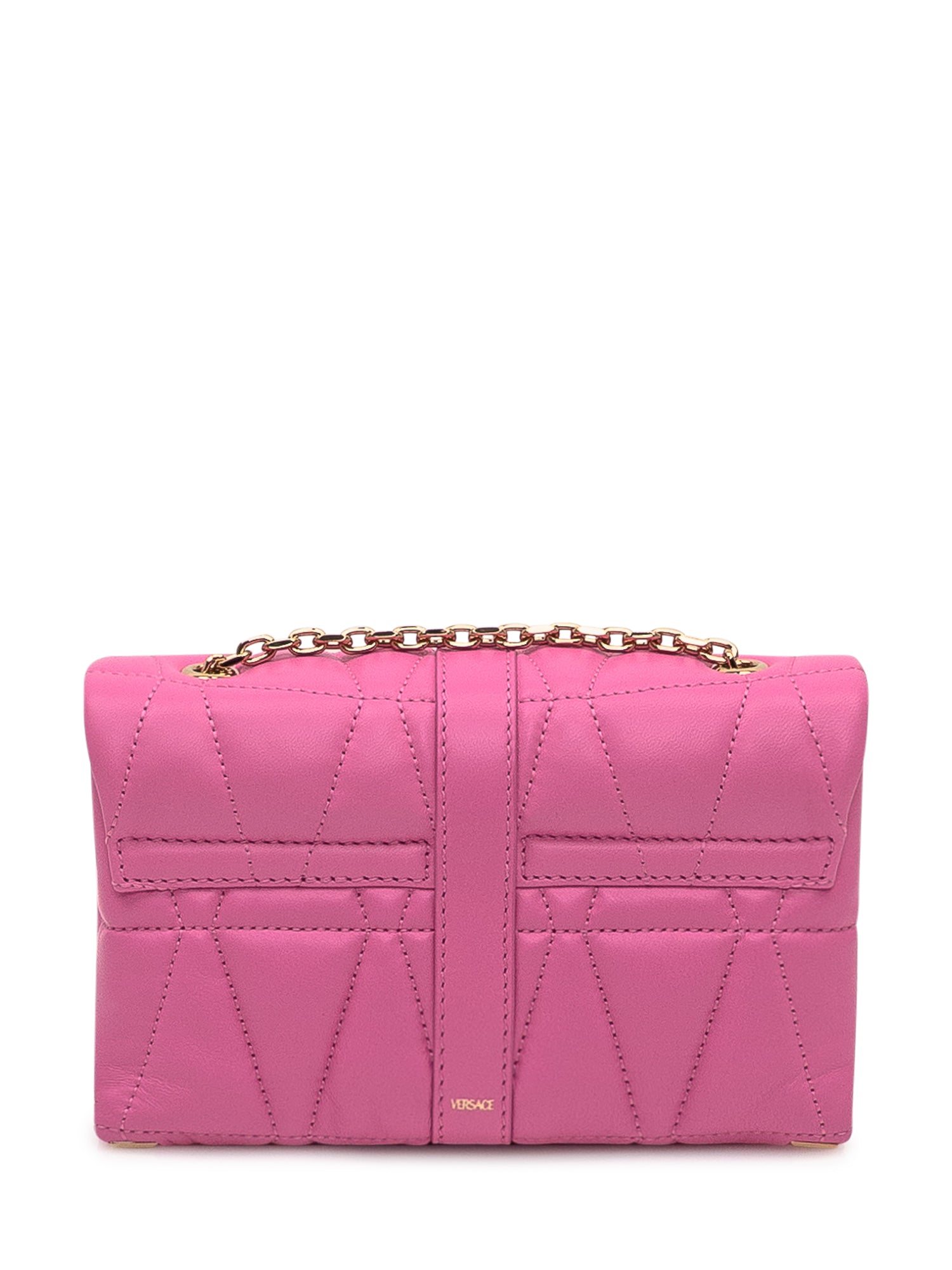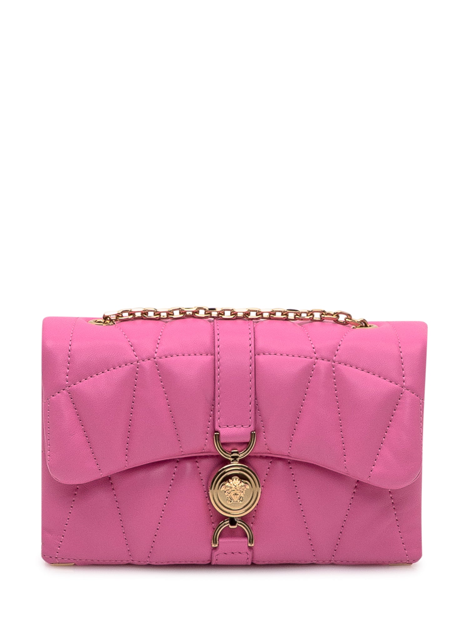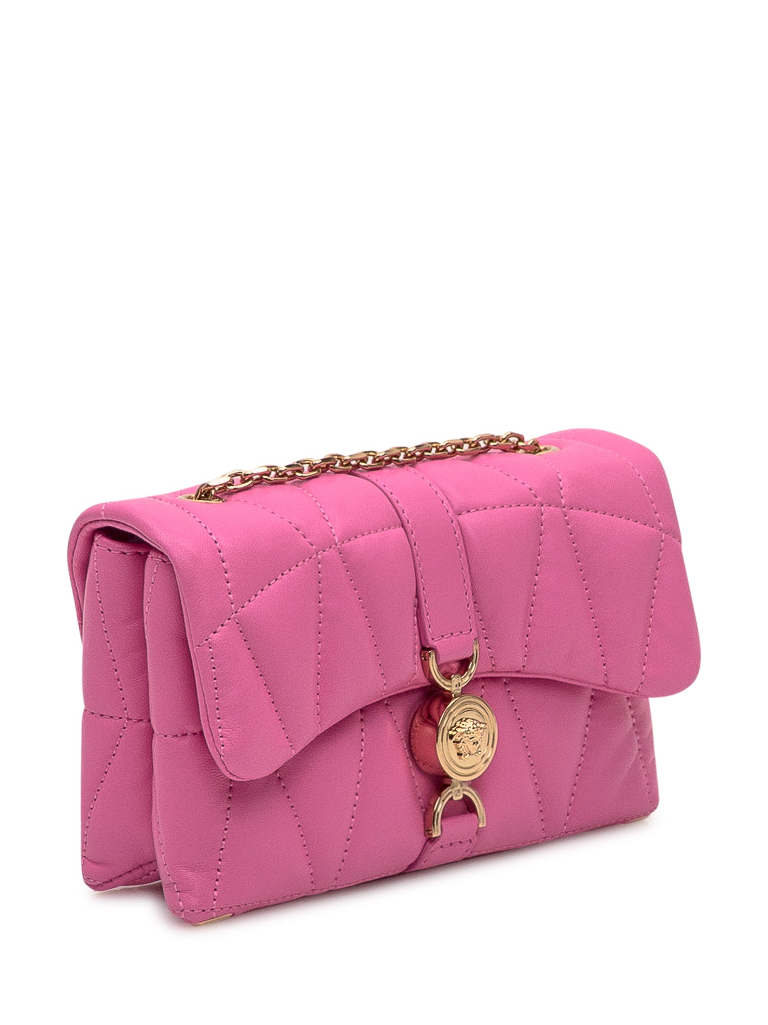 Pink leather bag. Adjustable and removable shoulder strap. Two compartments and inside pocket. Magnetic button closure with Medusa logo.