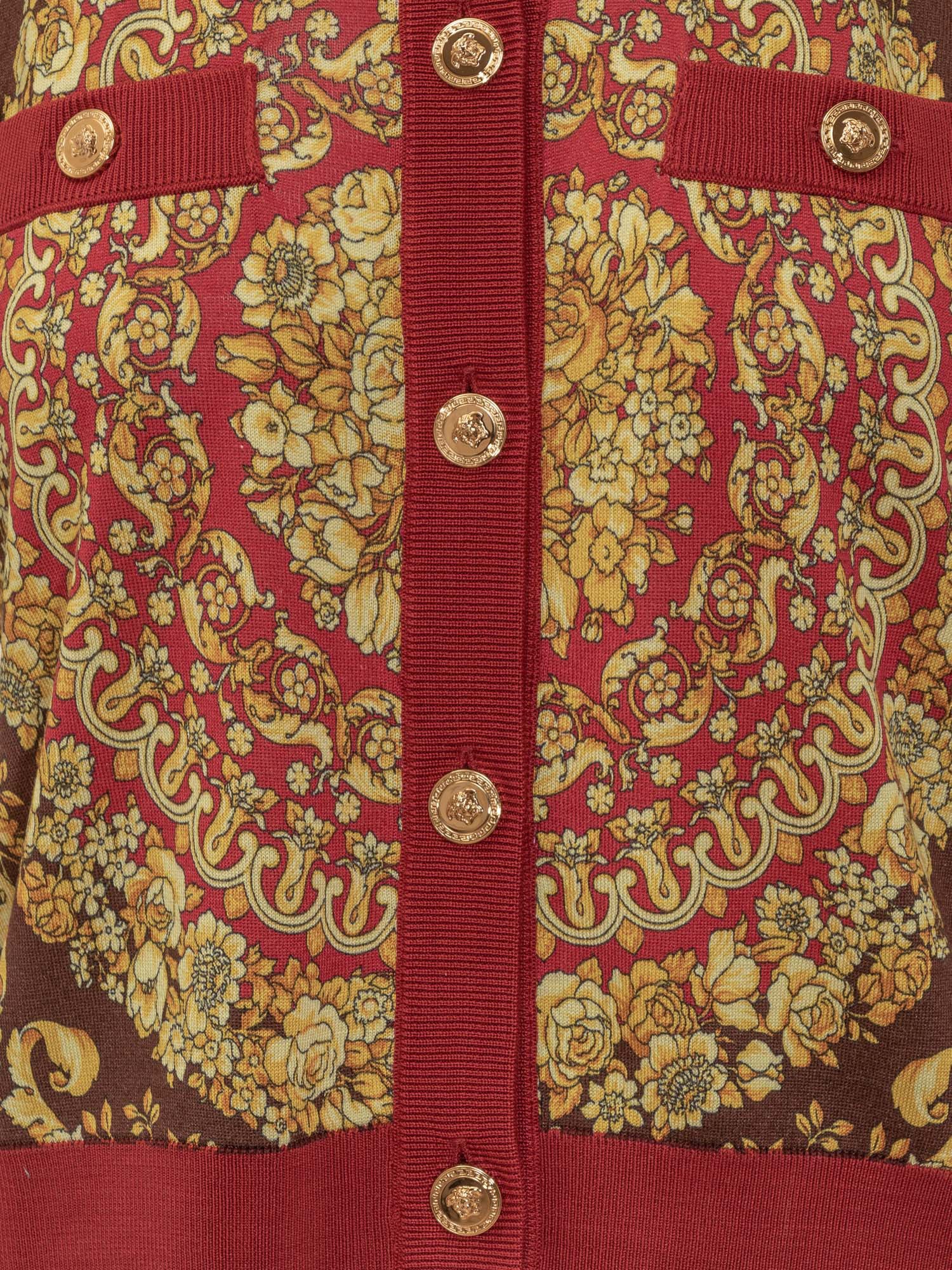 Versace knit cardigan with multicolor baroque print. Gold logo buttons and contrasting red details.
