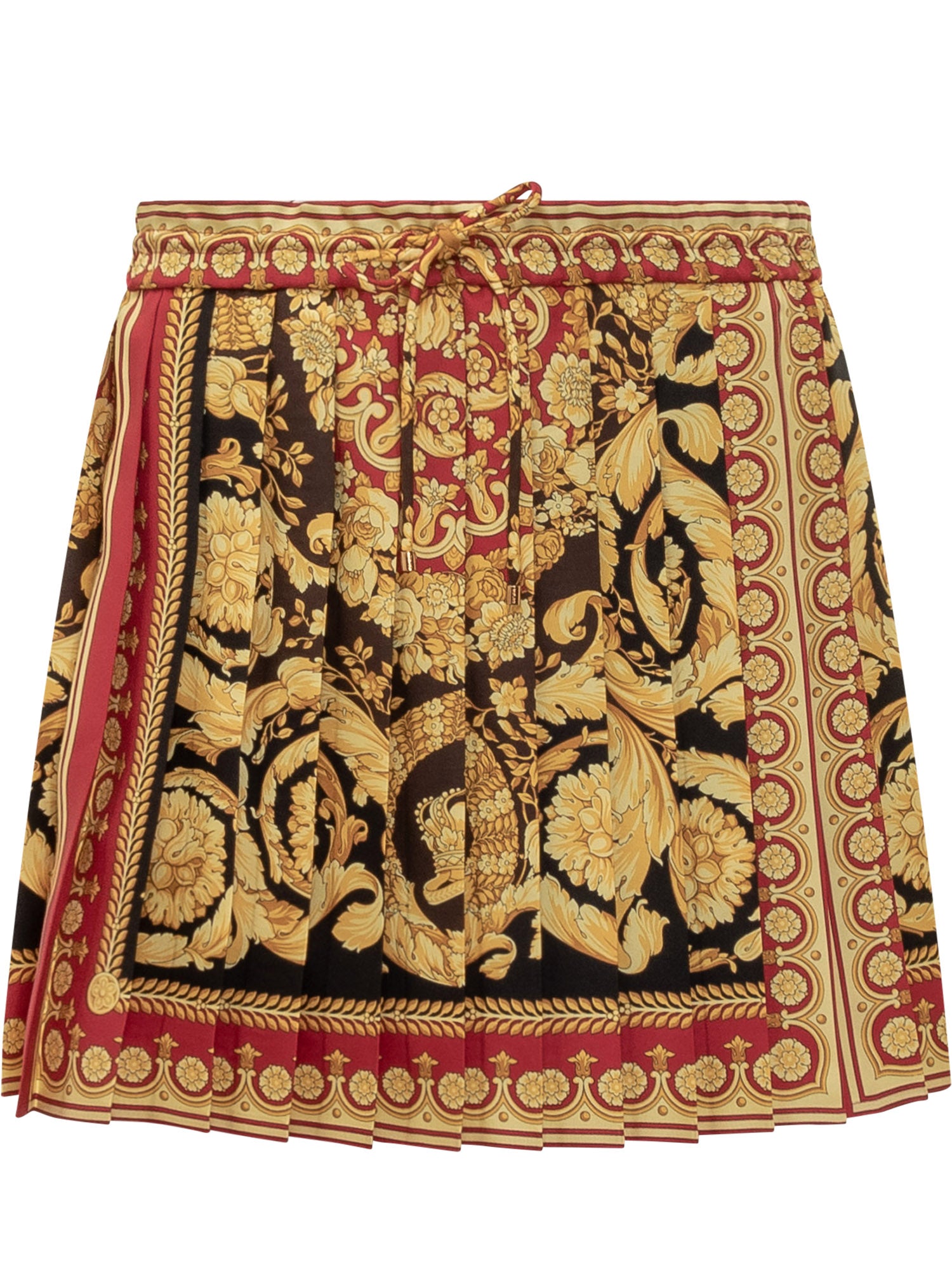 Short pleated Versace skirt with elastic waistband and baroque print in gold, red, and black tones.