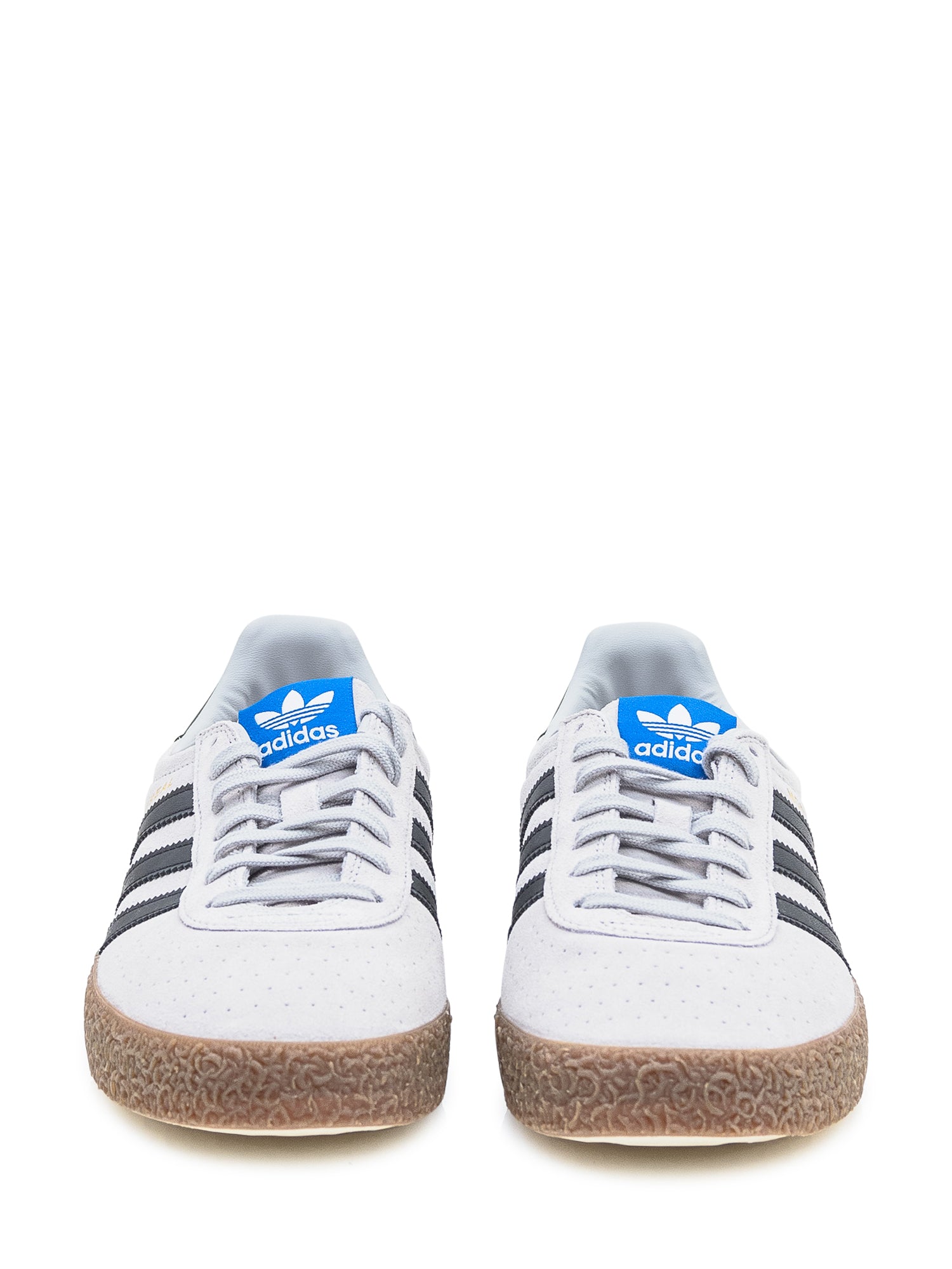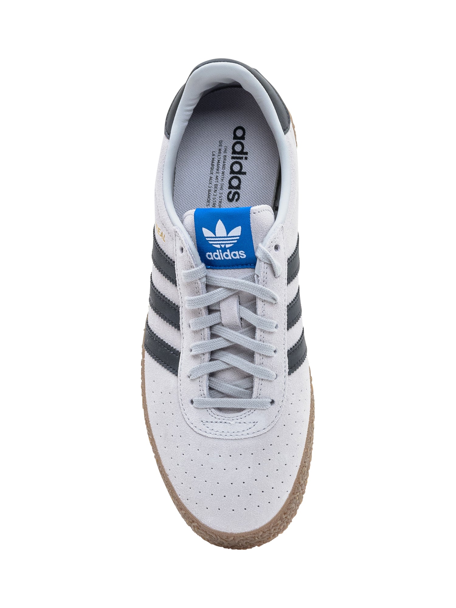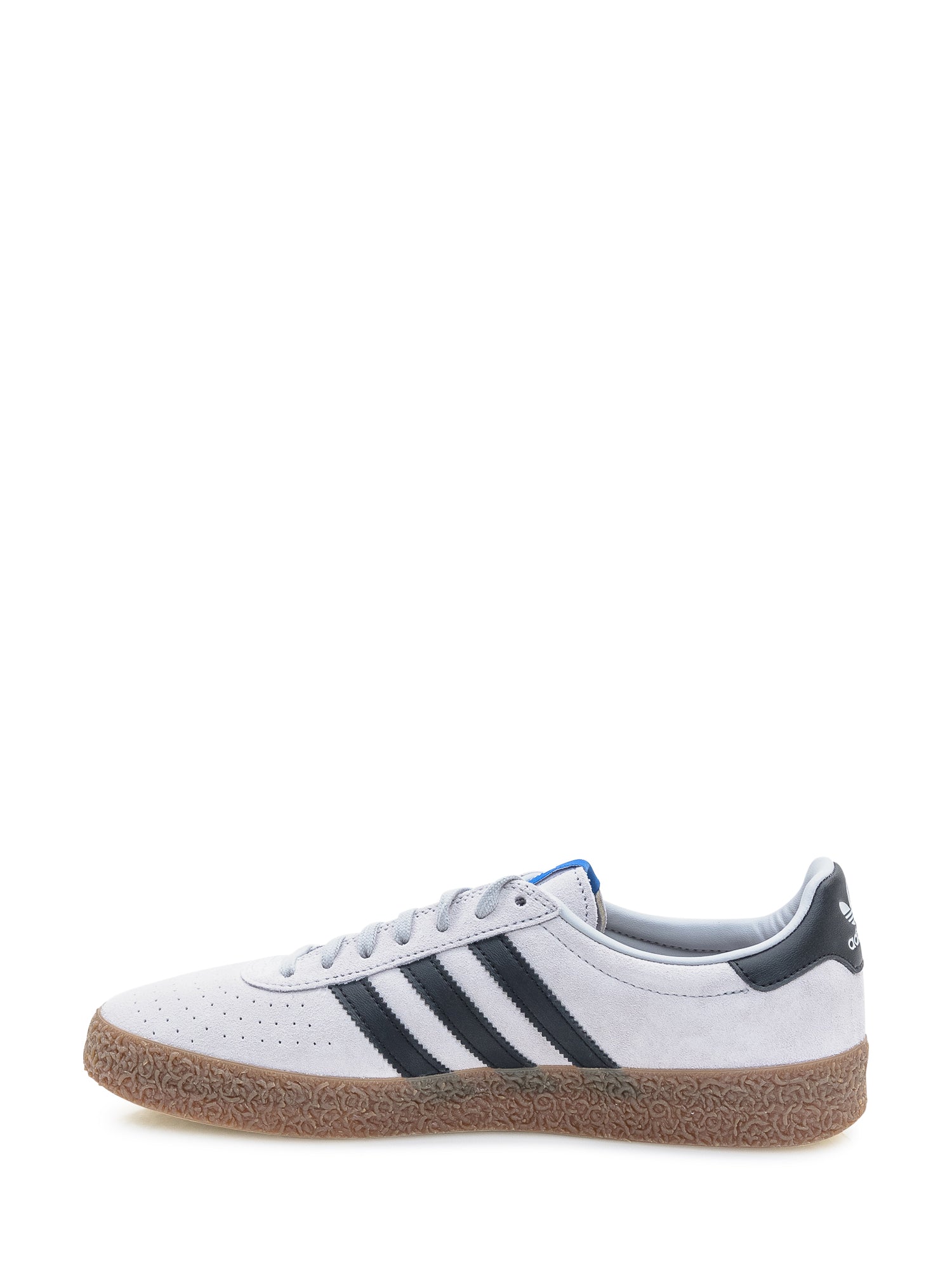 Adidas Montreal 76 sneakers in white suede with iconic black stripes and brown rubber sole.