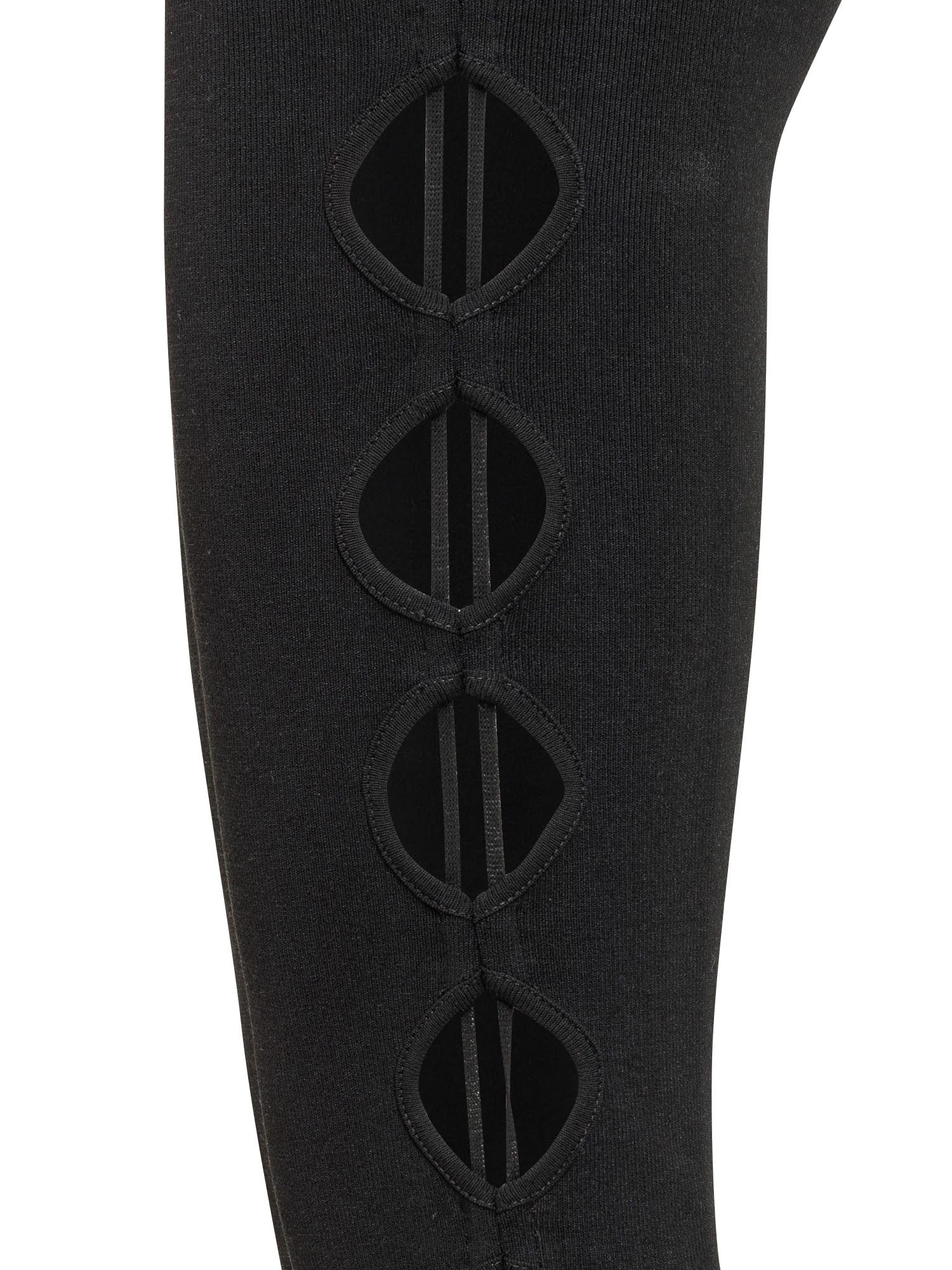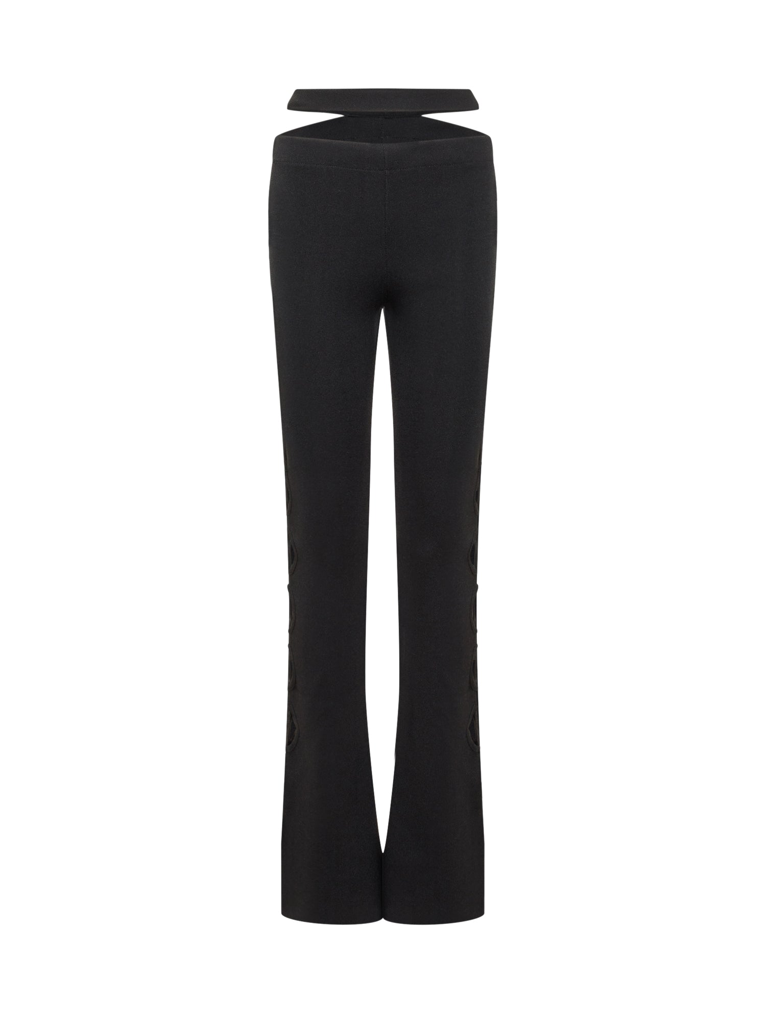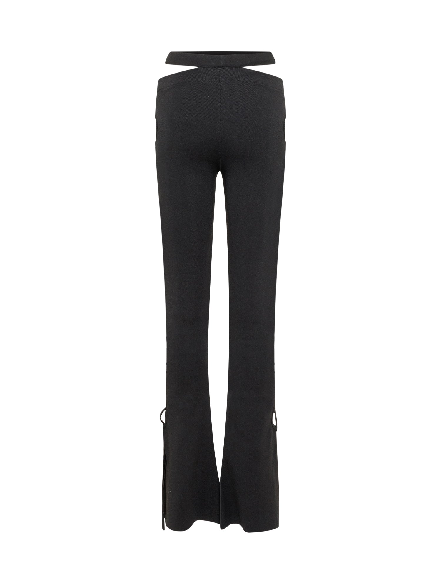 Black long trousers. Cut out details at the waist and sides. Slits at the bottom.