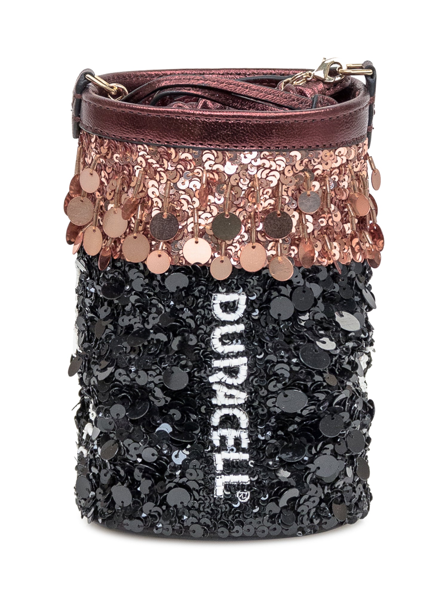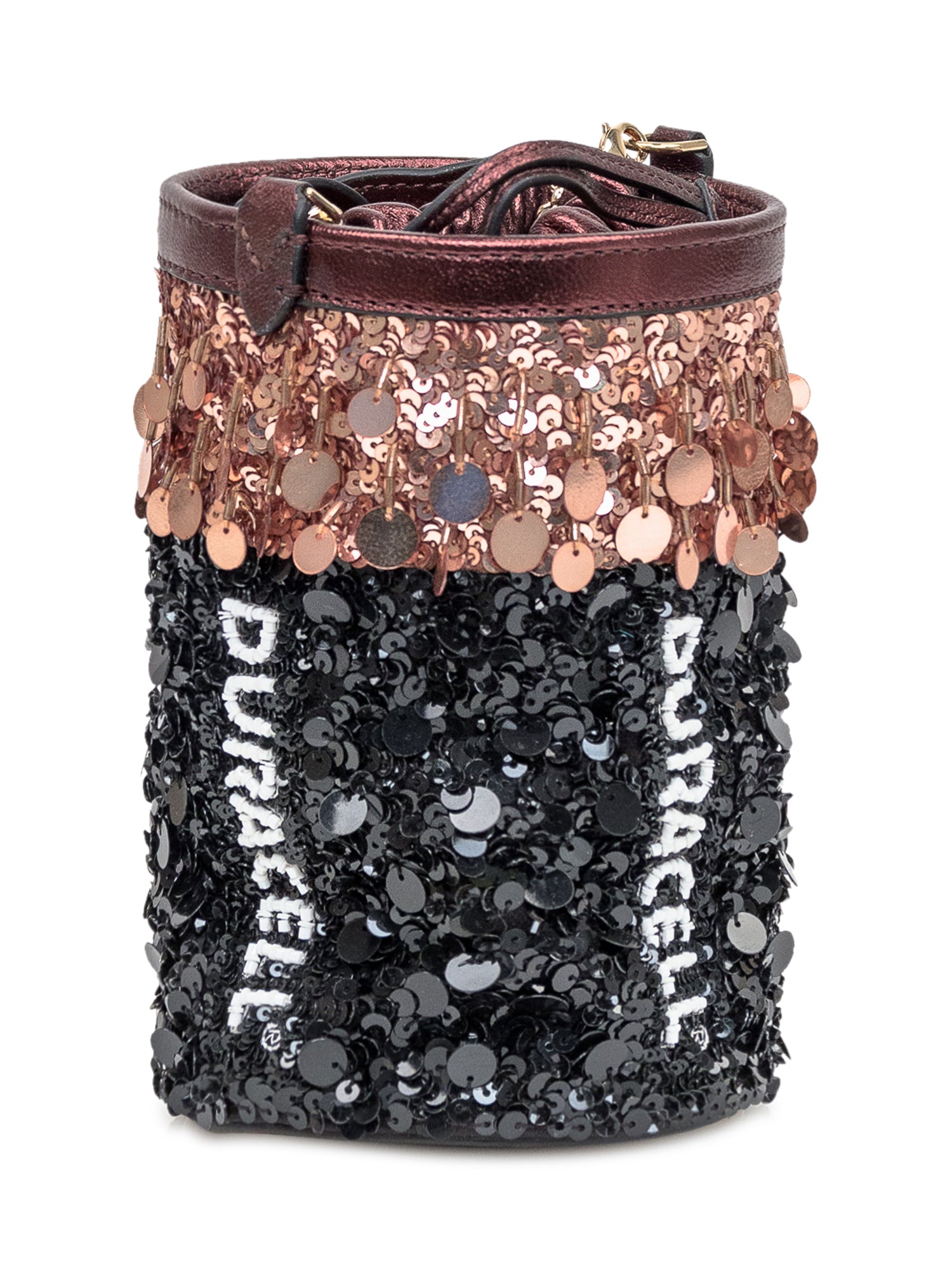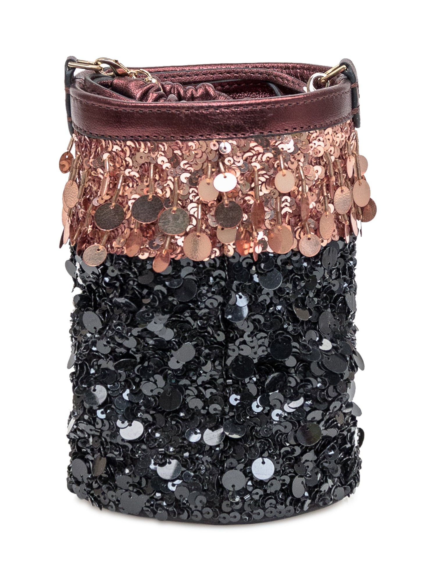 Black bucket bag. Closure with removable shoulder strap or drawstring laces. Covered with sequins and beads.