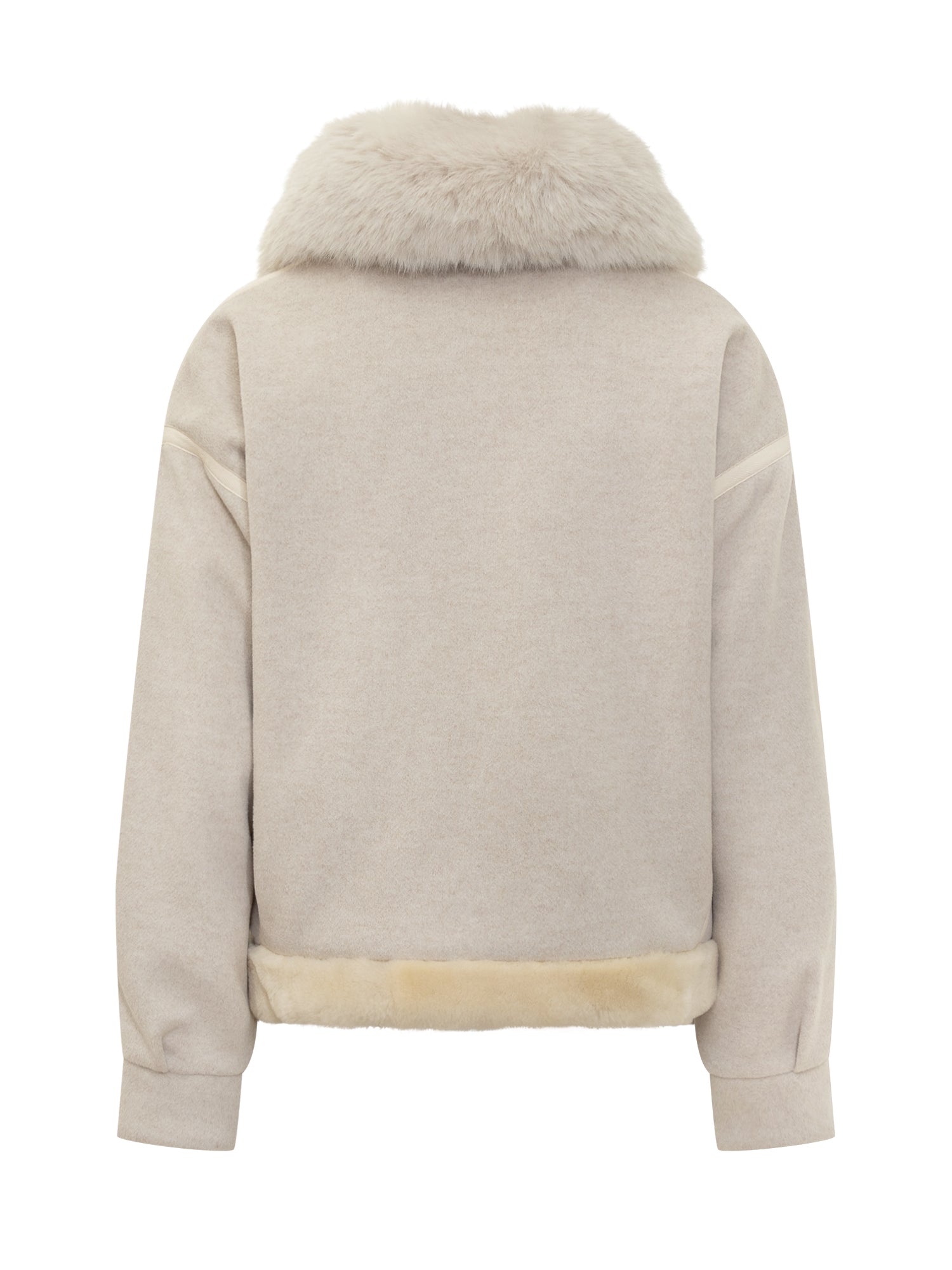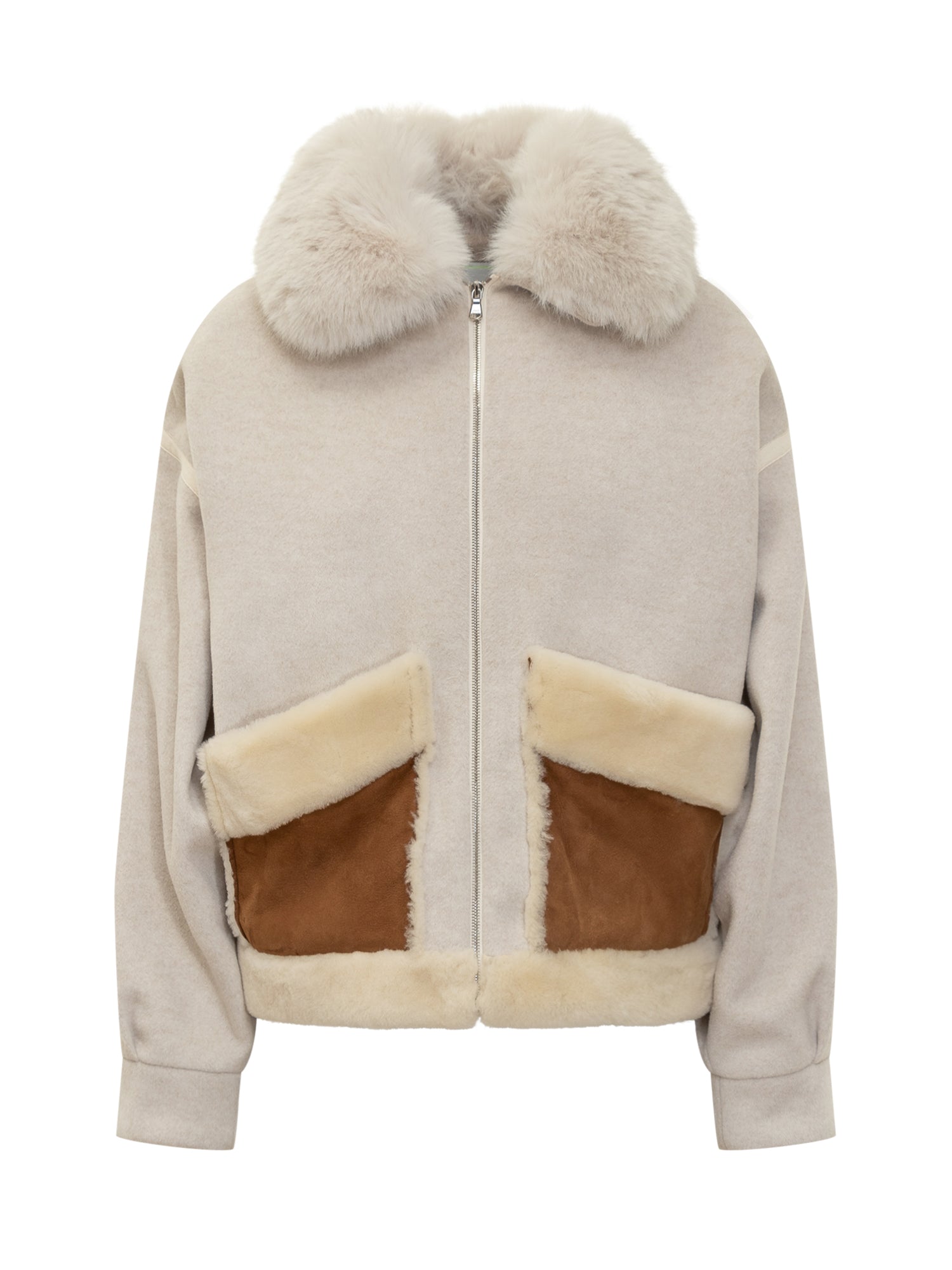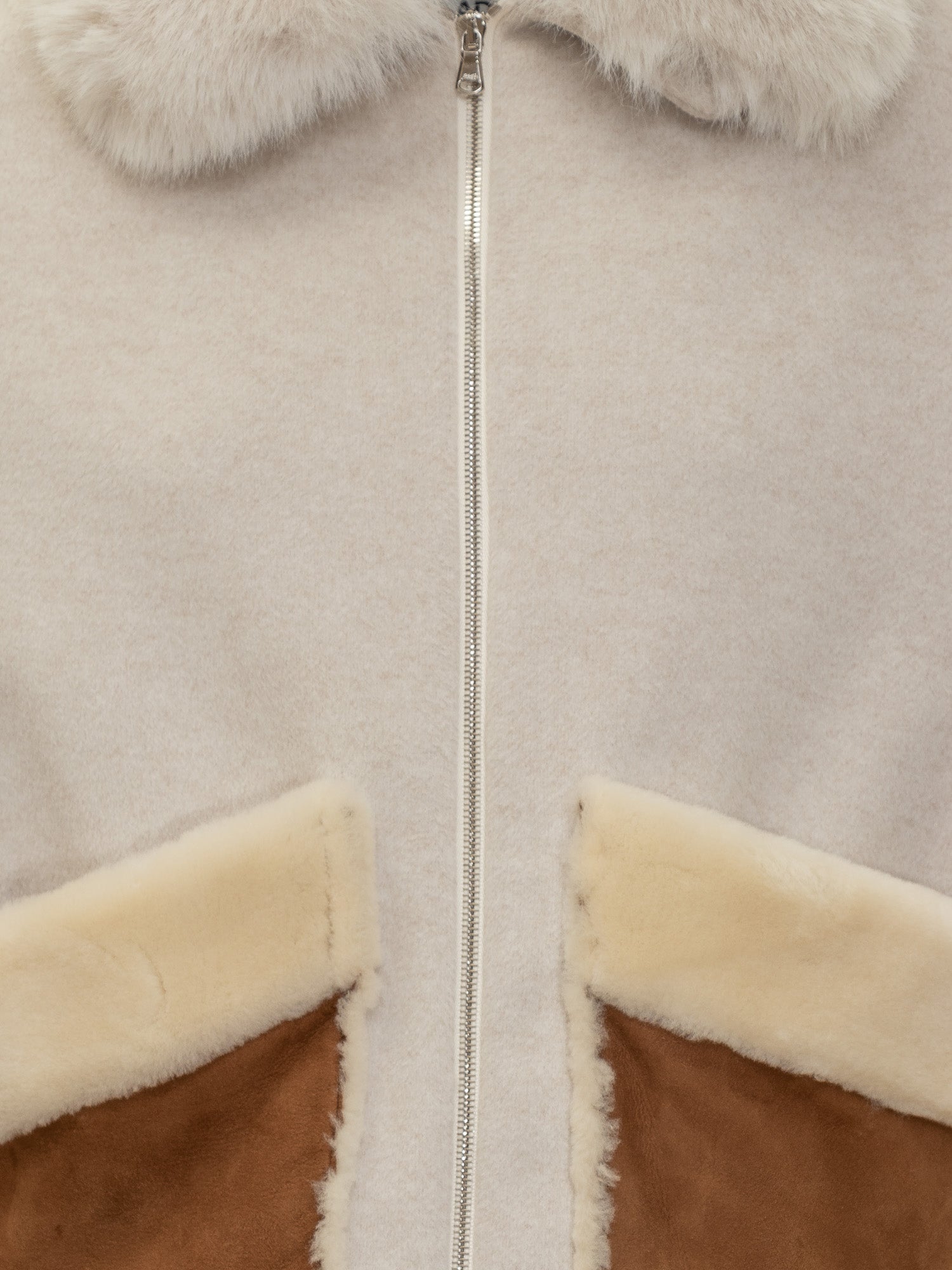 Ava Adore shearling jacket in beige with oversized collar and contrast suede pockets.