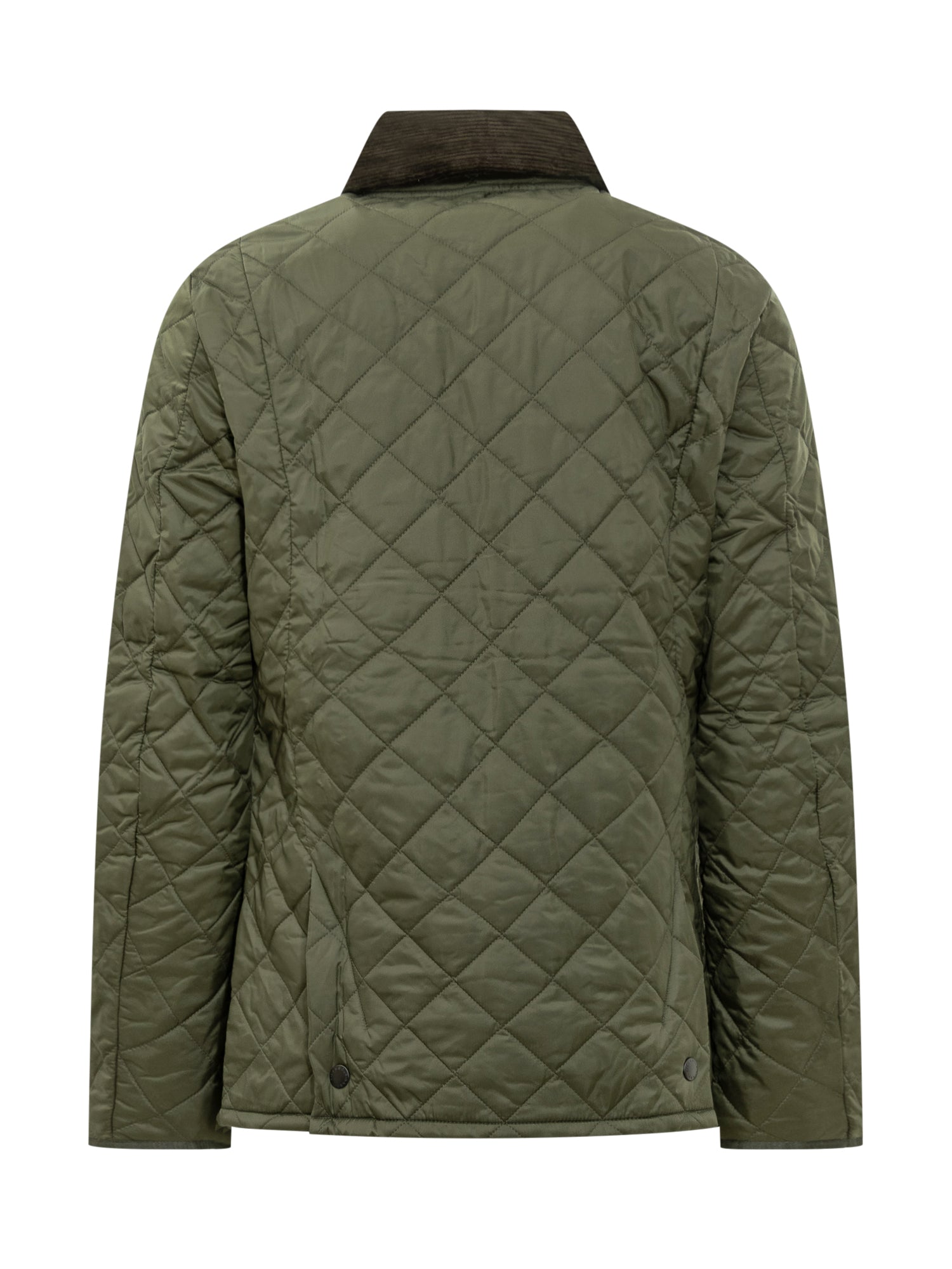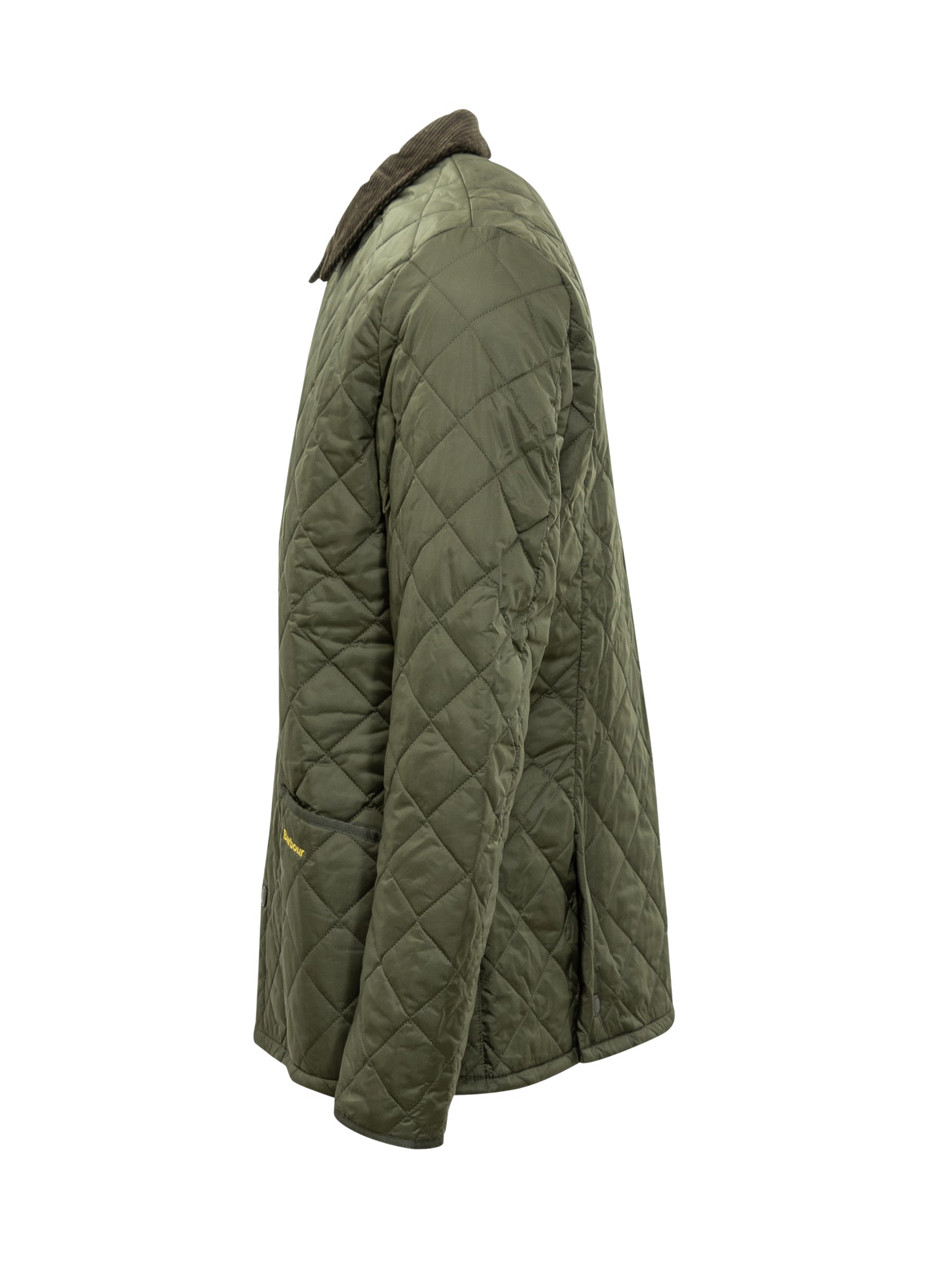 Green quilted jacket with diamond pattern, brown velvet collar, and button closure.