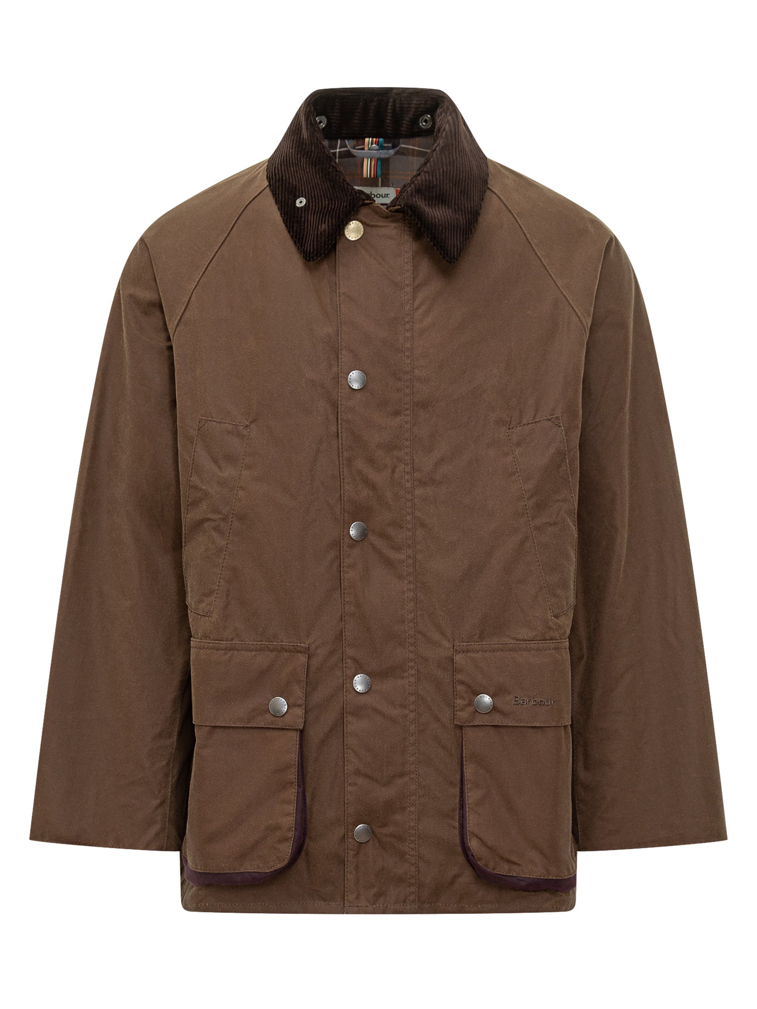 Barbour x Paul Smith brown waxed jacket with corduroy collar and checked lining enriched by Paul Smith s signature multicolor details. A blend of British heritage and modern style.