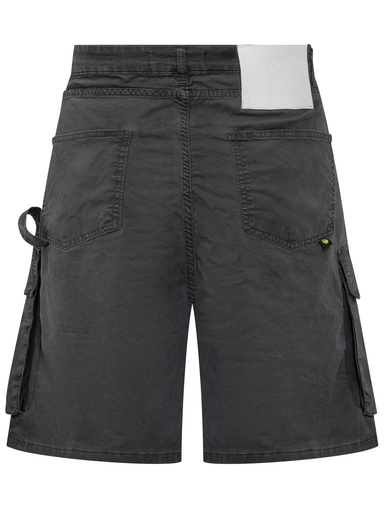 Button and zip fastening. Cargo pockets at sides. Five pockets. Belt loops.