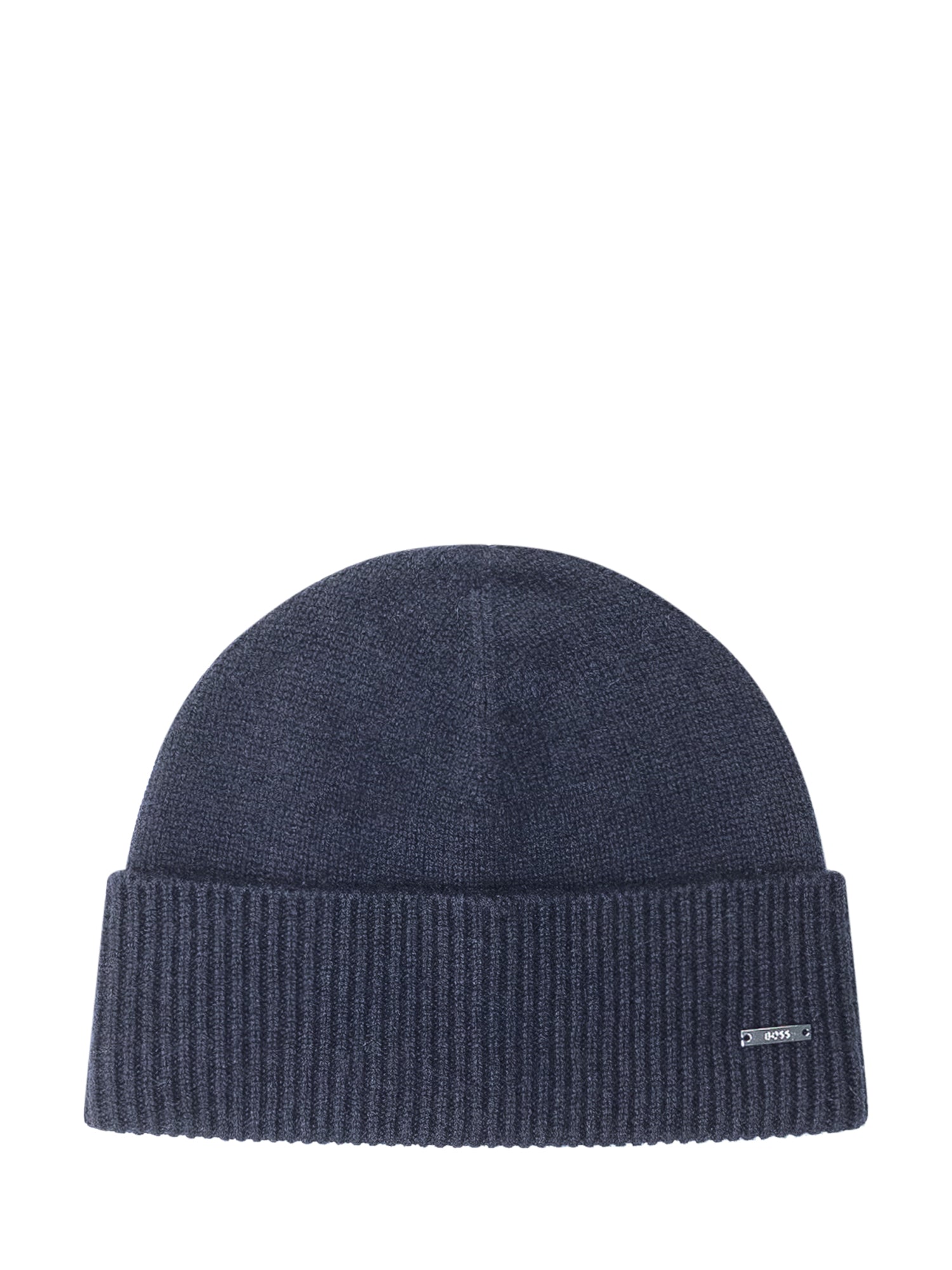 Boss Fati beanie in blue knit with folded brim and subtle logo tag.