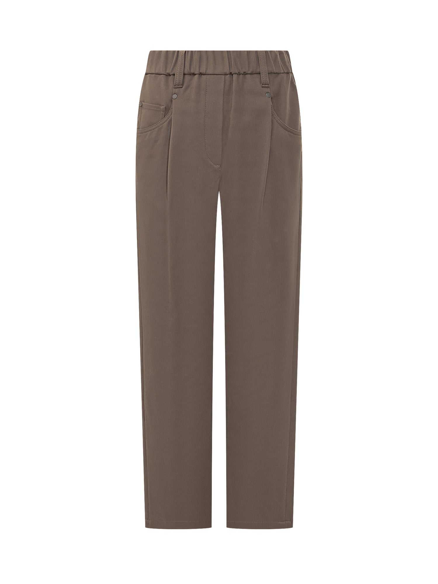 Crafted from premium stretch cotton, these Brunello Cucinelli trousers blend comfort with refined tailoring. The relaxed fit and elasticated back waistband ensure ease of movement, while the front crease adds a touch of polish. Featuring jean-style pockets with metal rivets, the trousers are completed with an automatic zip, button, and hook closure for secure and effortless wear.