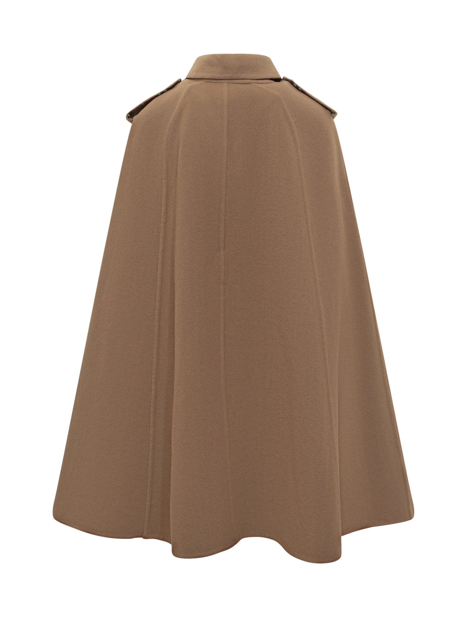 Elegant Burberry wool cape in camel with waist belt and double-breasted details. A refined piece combining British heritage with a feminine silhouette.