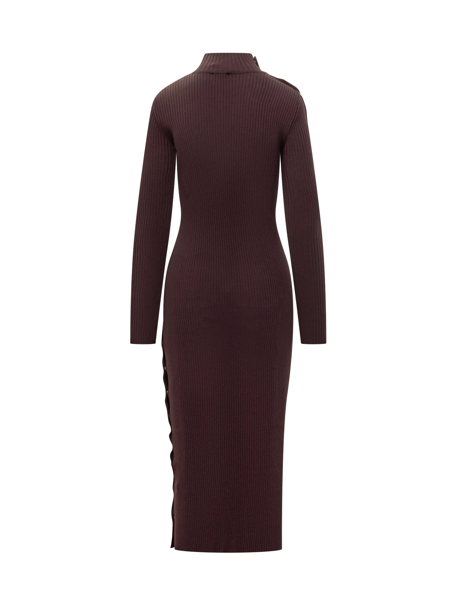 Burgundy Courrèges midi dress in ribbed knit with high neck and snap buttons on sleeve and side. Fitted silhouette and embroidered logo for a bold.