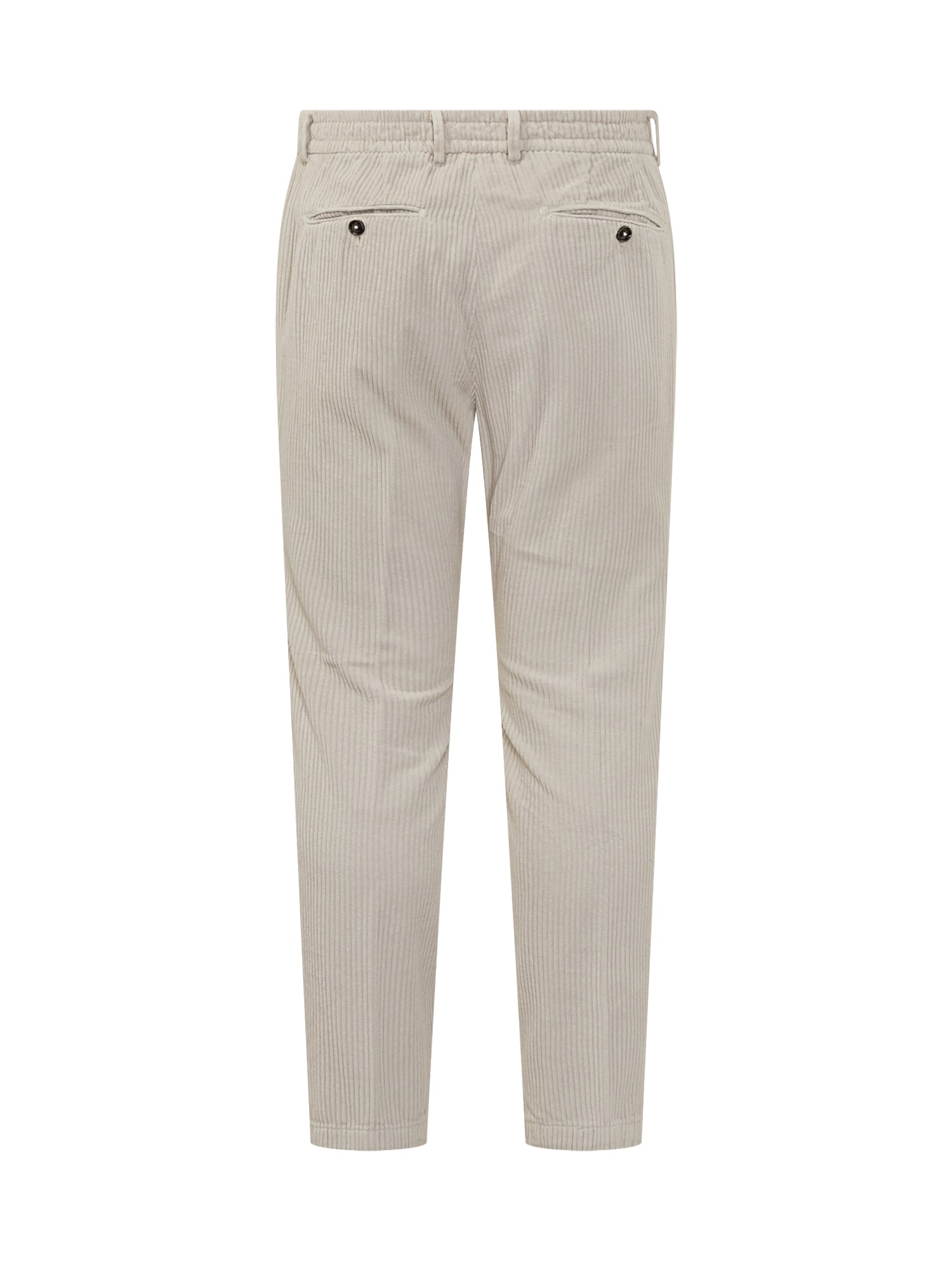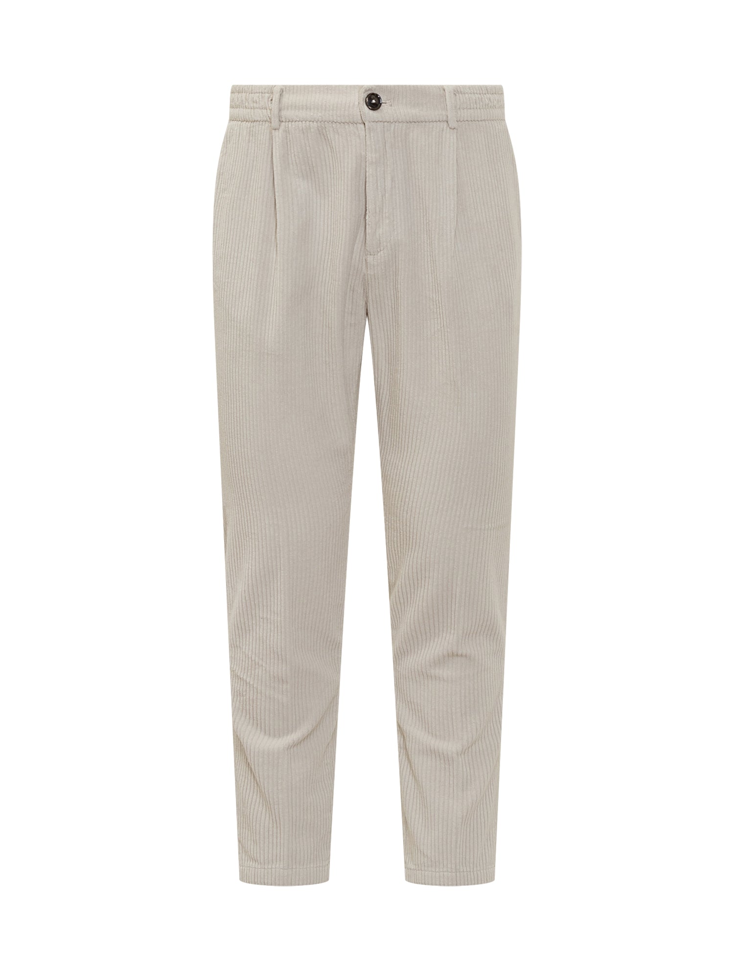 Cruna beige corduroy trousers with a modern fit, elastic waistband, and front pleats.