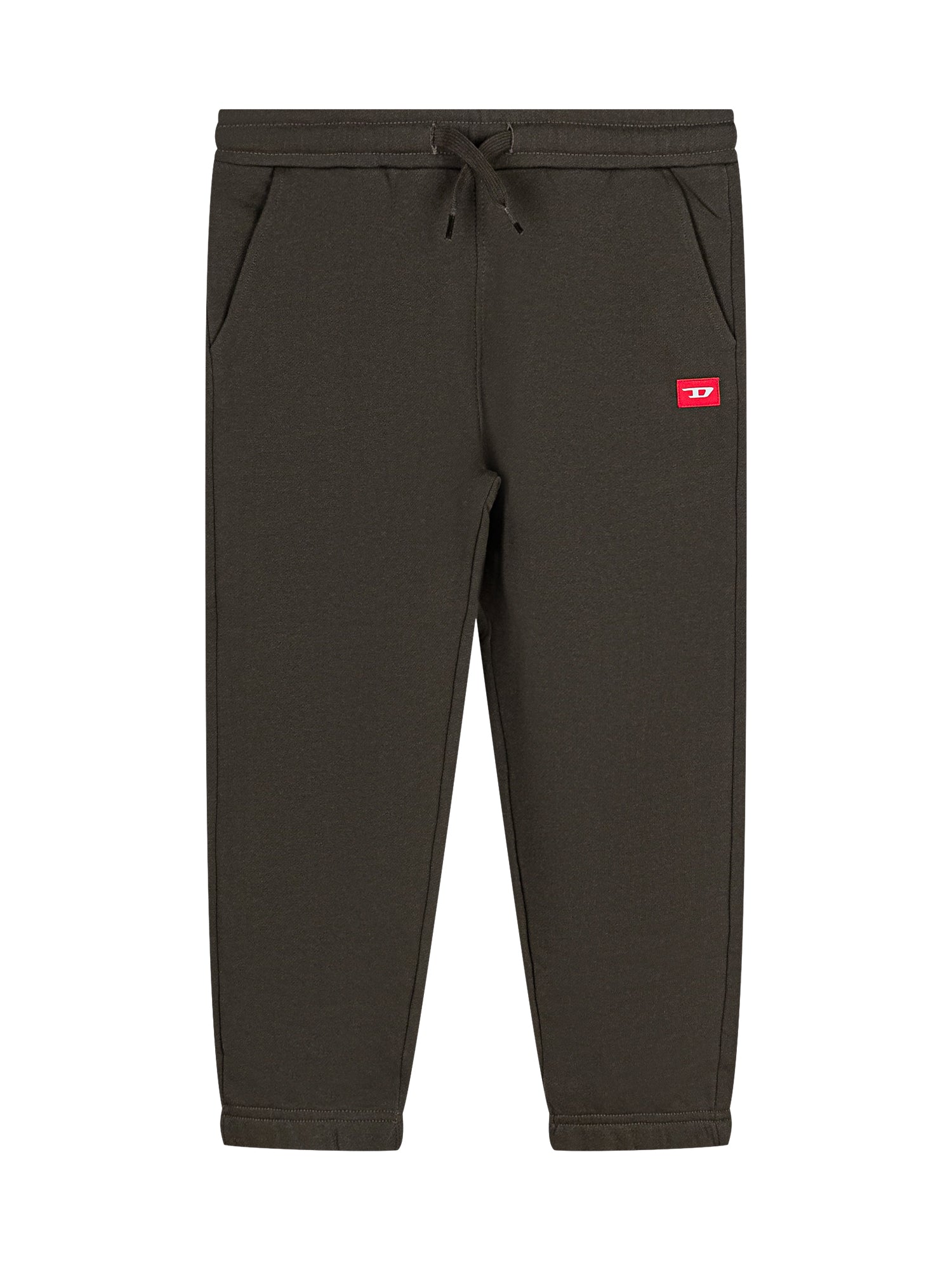 Green fleece pants with elastic waist and drawstring, side pockets and red embroidered Diesel logo.