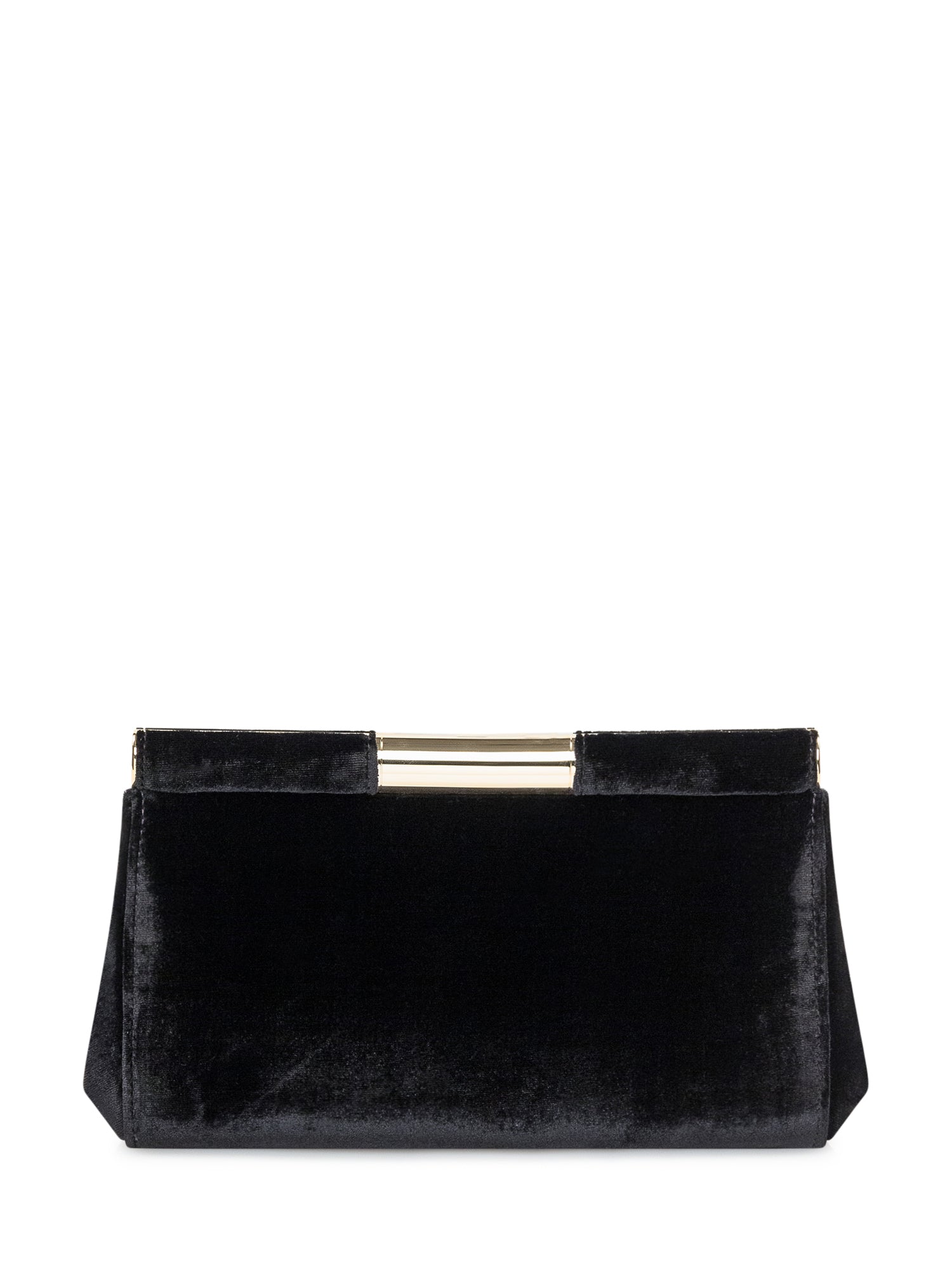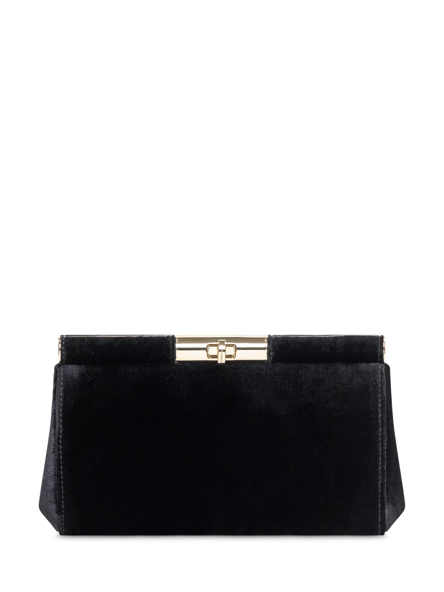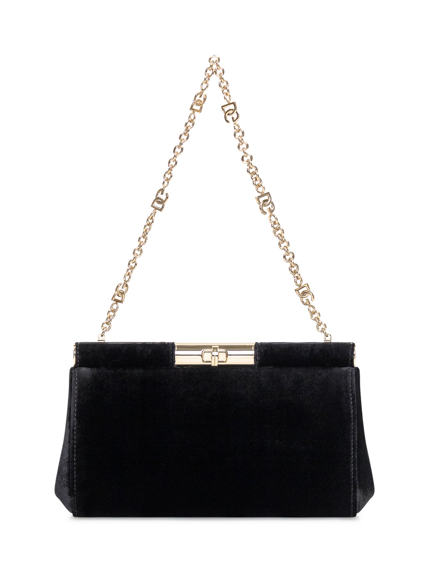 Black velvet shoulder bag. Light gold galvanized metal swivel closure. Gold chain shoulder strap. Satin lining and flat pocket. Dolce&Gabbana logo on closure.