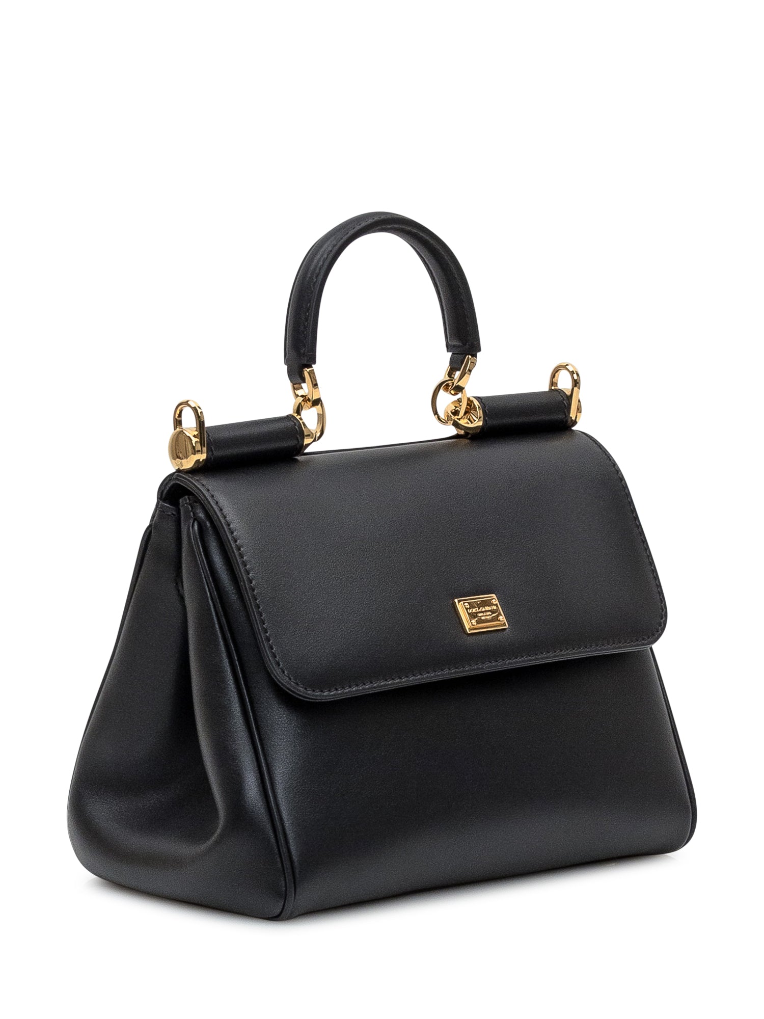 Dolce & Gabbana Sicily handbag in black leather with top handle and gold-tone hardware. Elegant and versatile, perfect for any occasion. Flap closure, front logo plaque, and detachable shoulder strap.