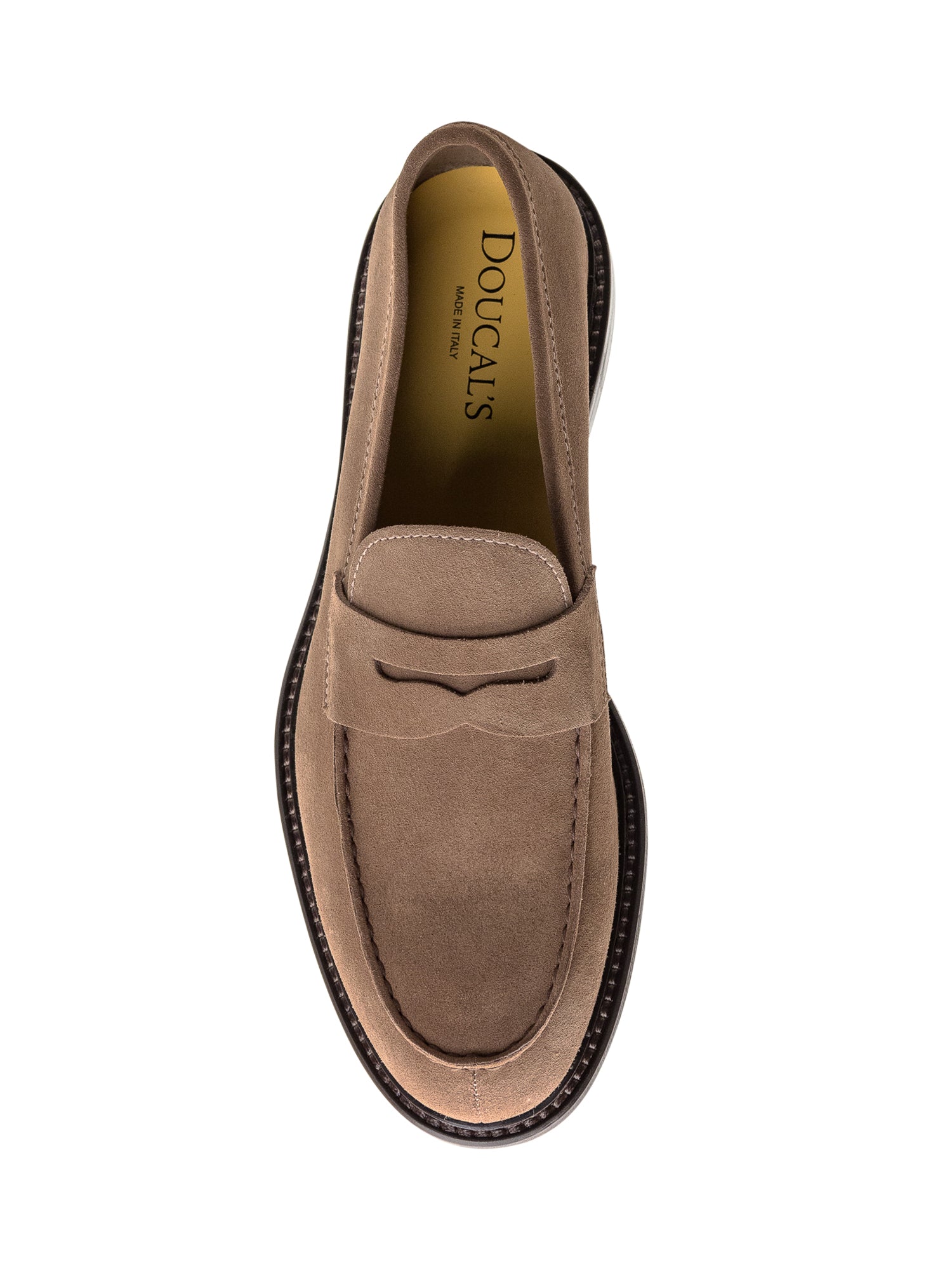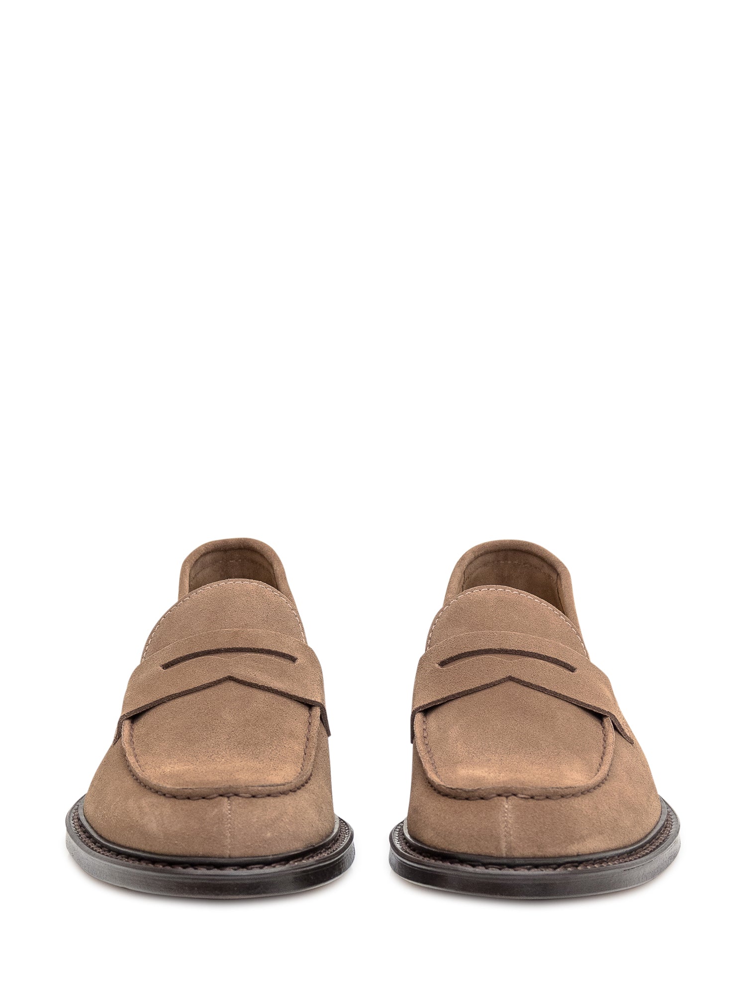 Brown suede loafer. Suede upper. Slip on. 100% Calf.