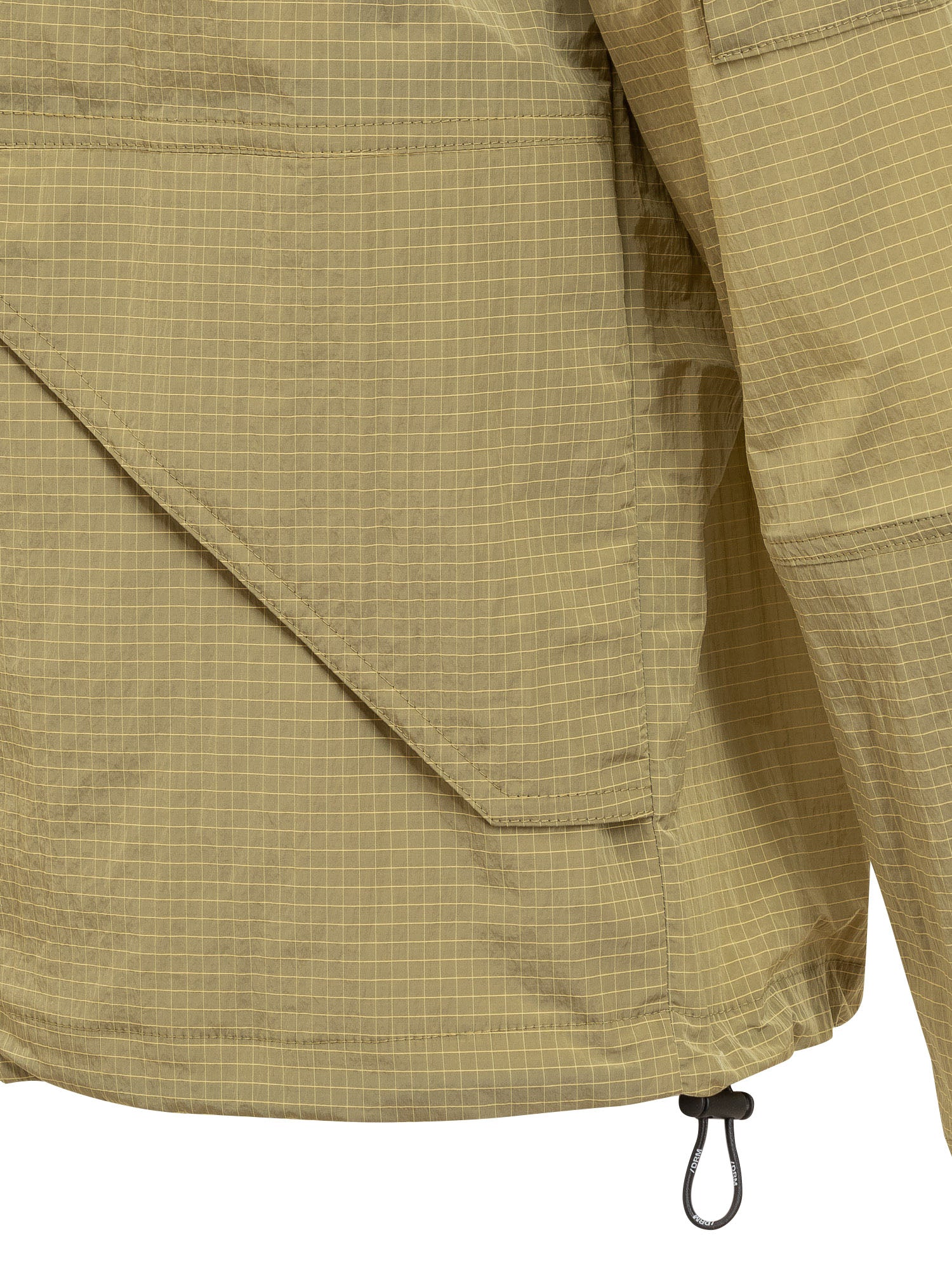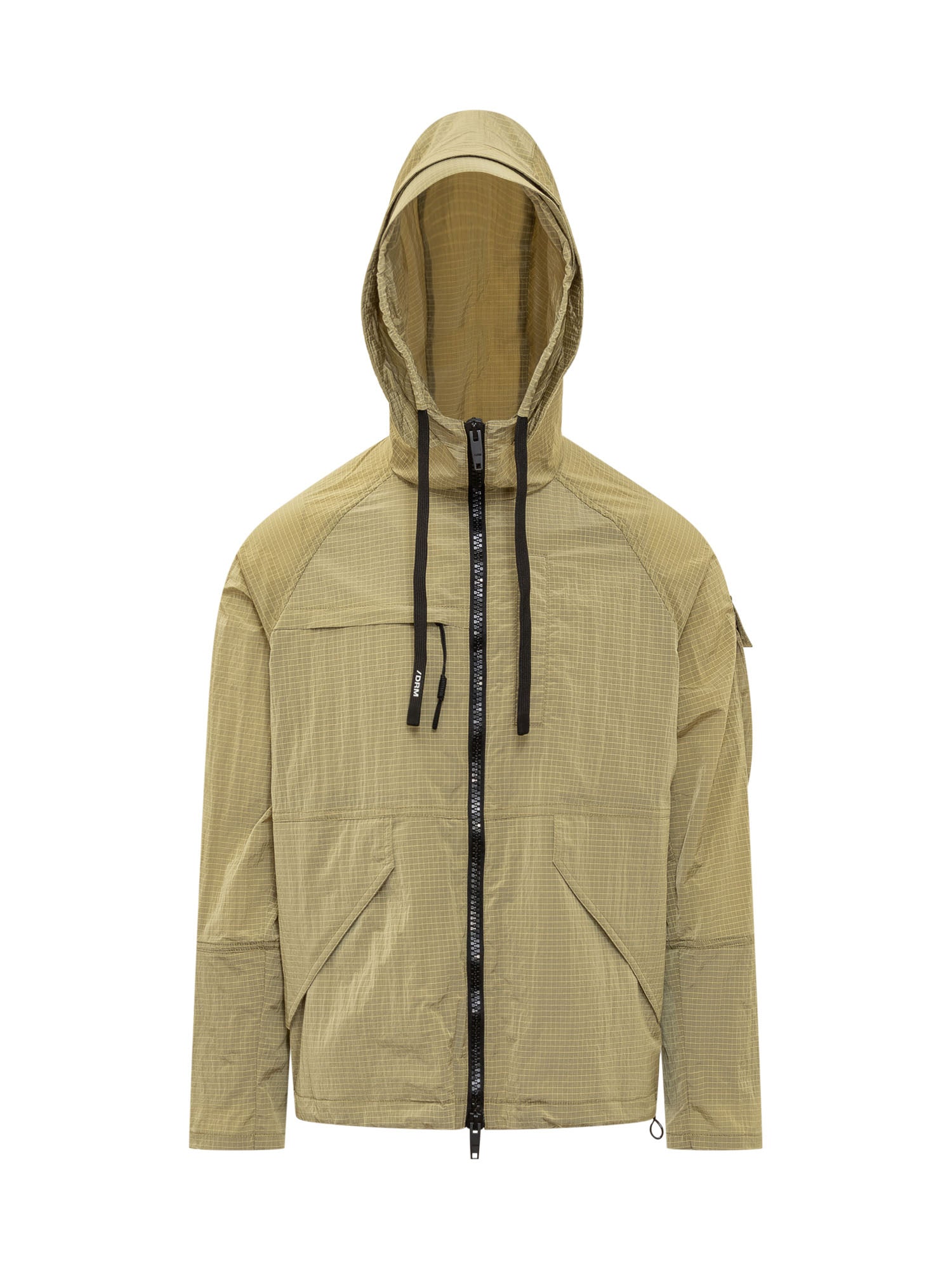 Hooded jacket. Drawstring hood. Zip closure. Two side pockets, one on the chest and one on the sleeve. Drawstring waist.