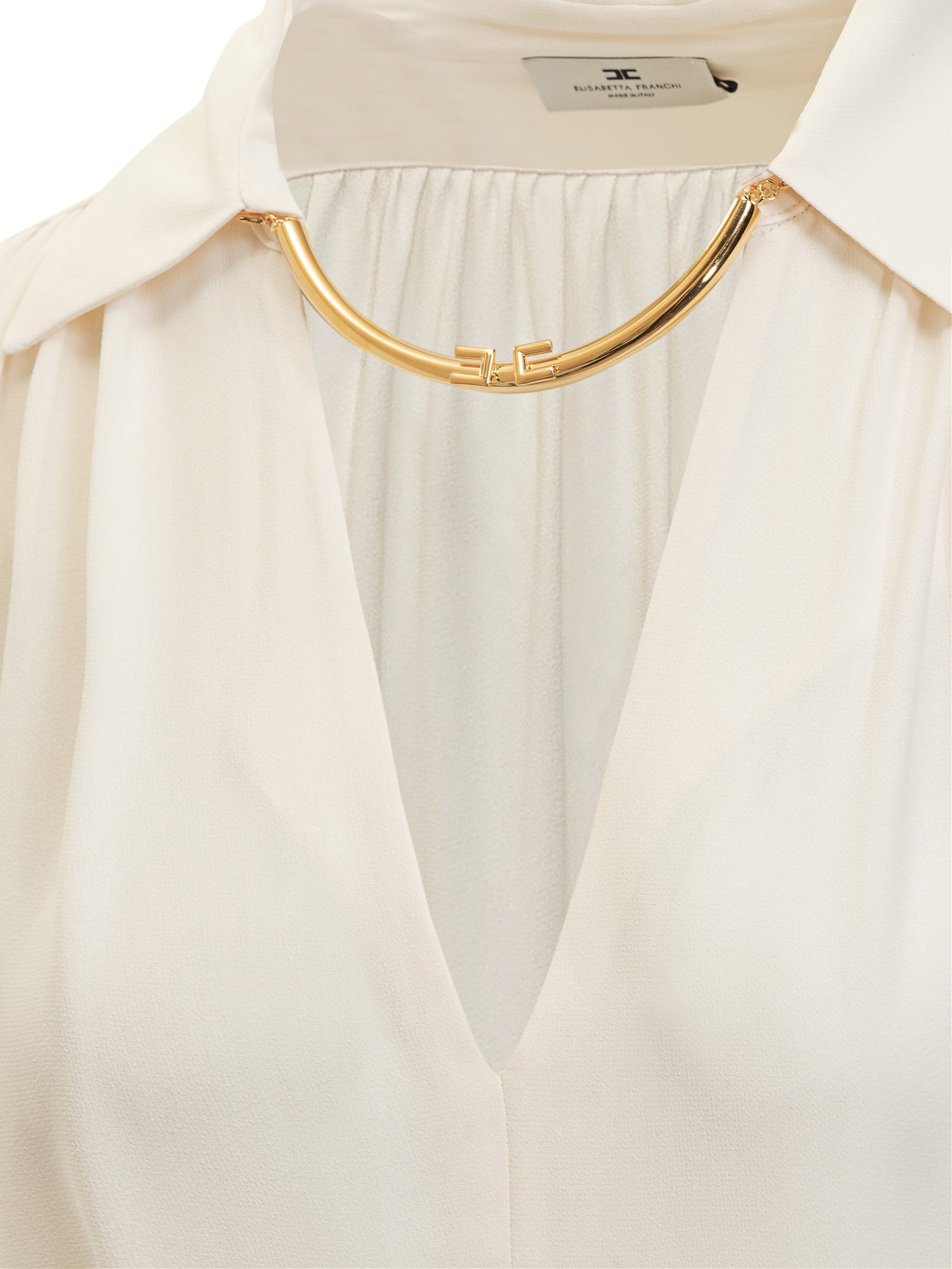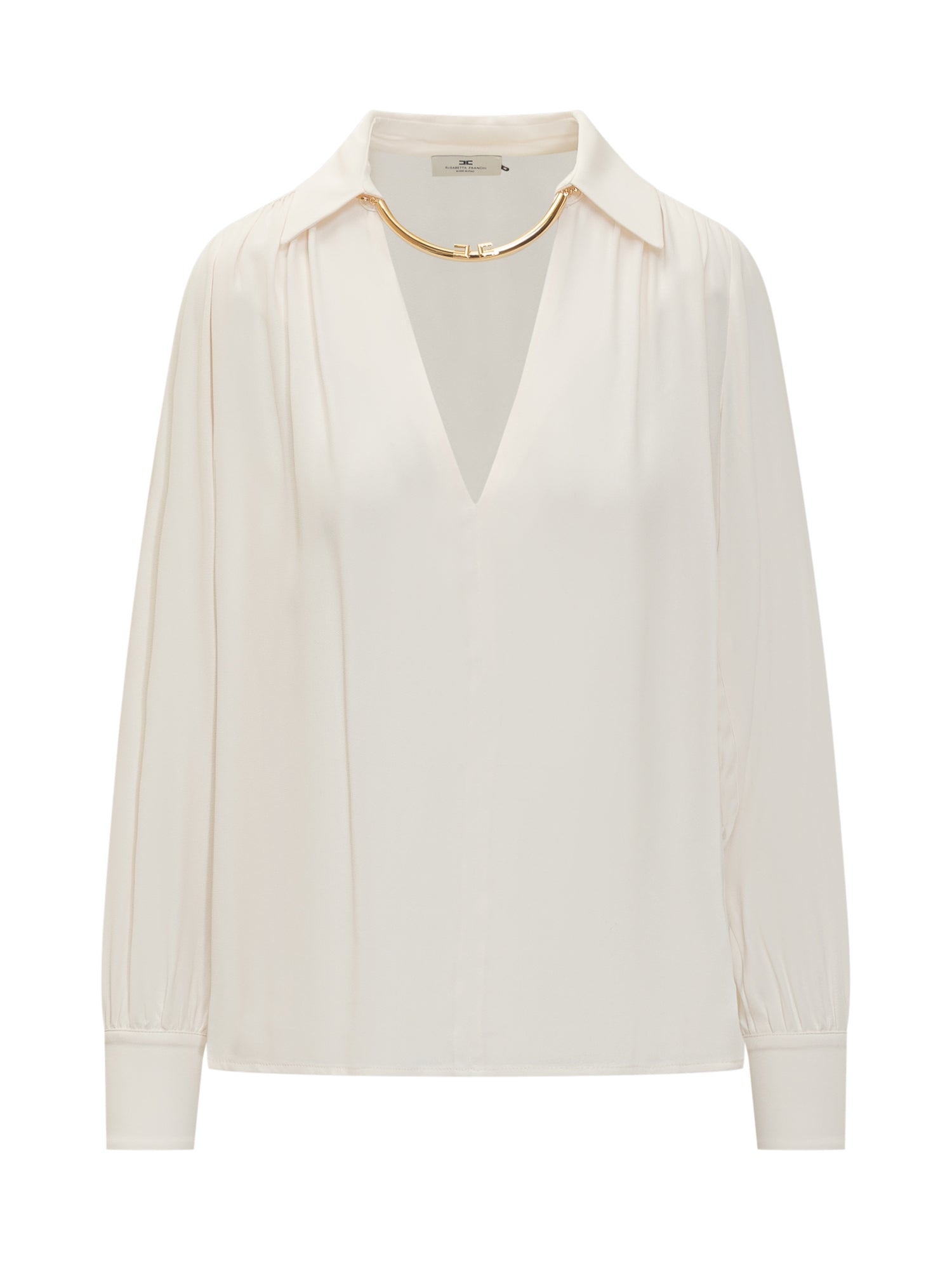 Elisabetta Franchi blouse in fluid ivory fabric with V-neckline and gold jewel detail.