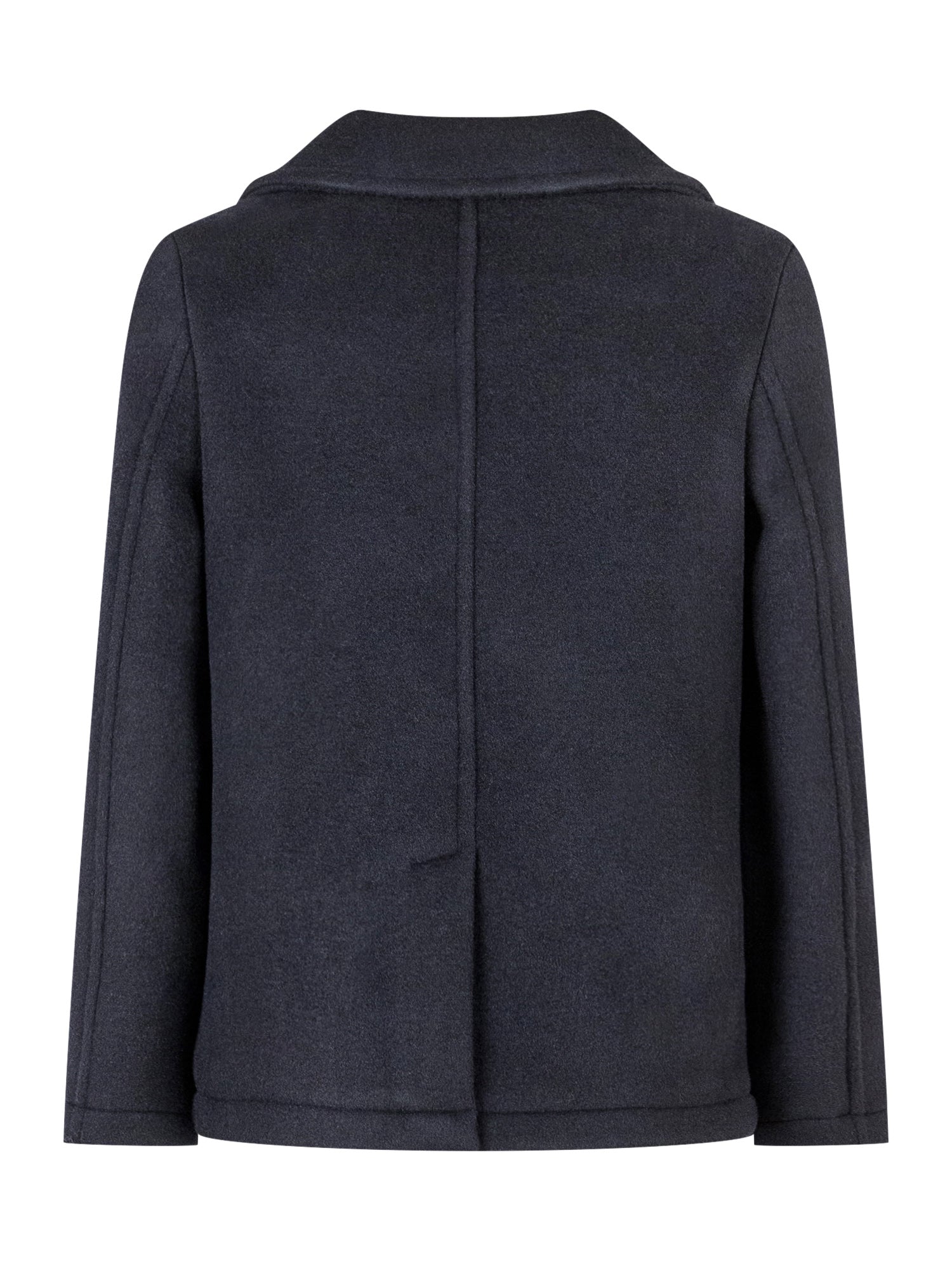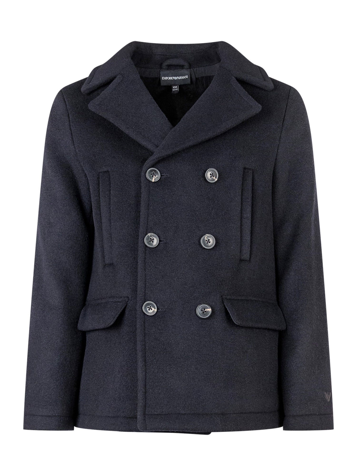 Elegant Emporio Armani wool peacoat in blue, featuring double-breasted closure, classic lapels and flap pockets.