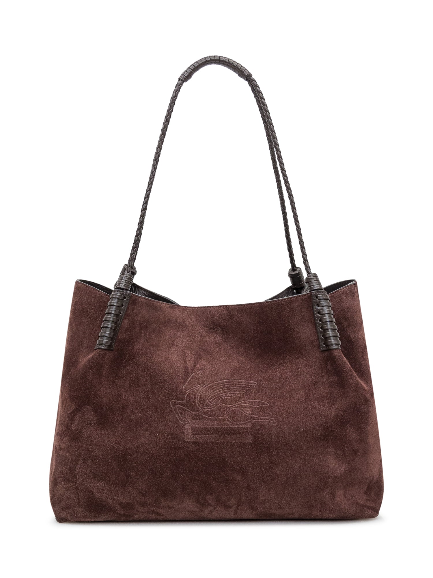 Brown suede bag. Embossed logo on the front. Open top. Two flat shoulder straps. Smooth leather clutch. Bag closure with carabiner.