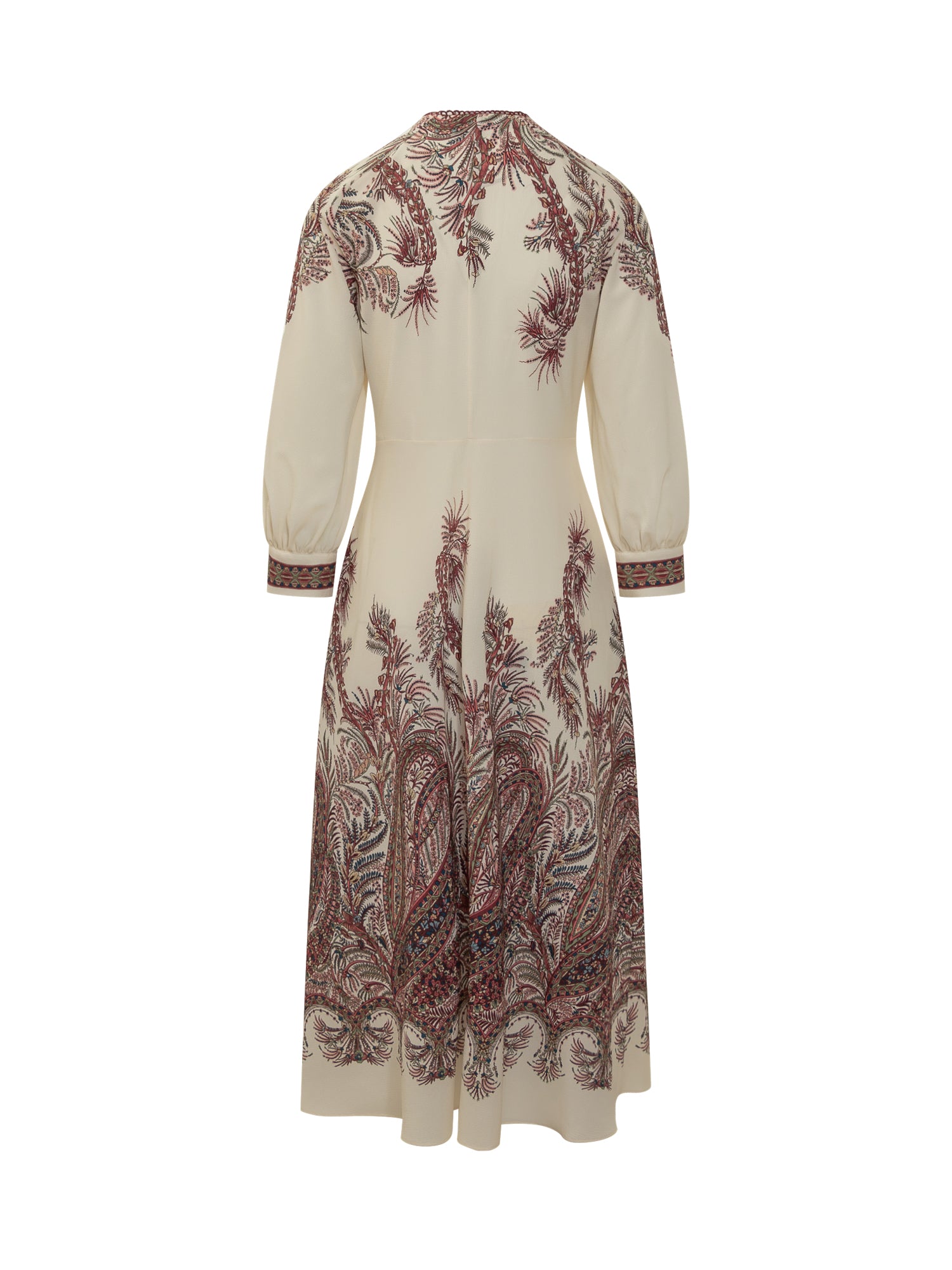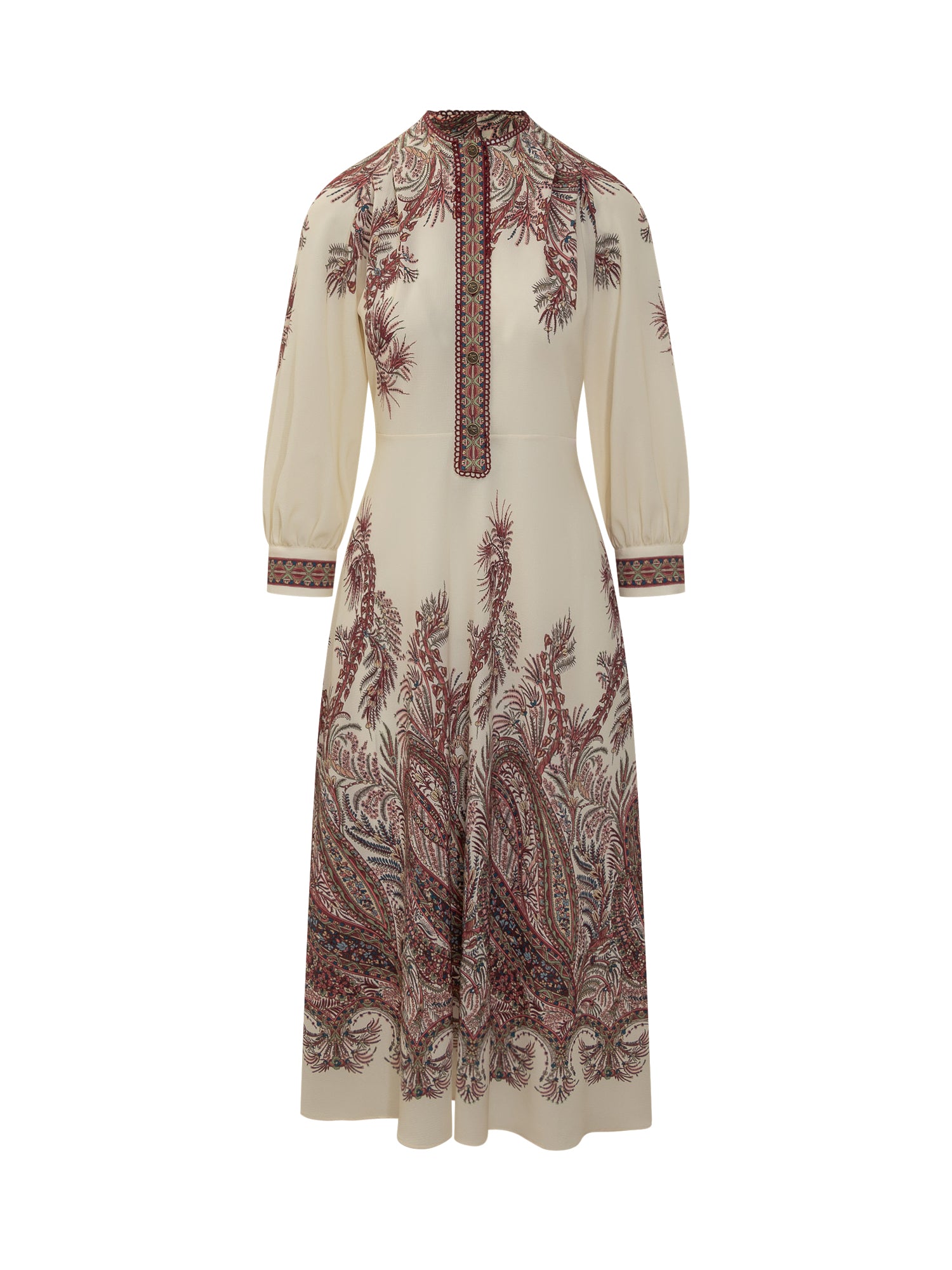 Etro midi dress in crepe featuring contrasting paisley print and 3/4 sleeves. With its fluid silhouette and detailed neckline, this piece offers a refined boho-chic