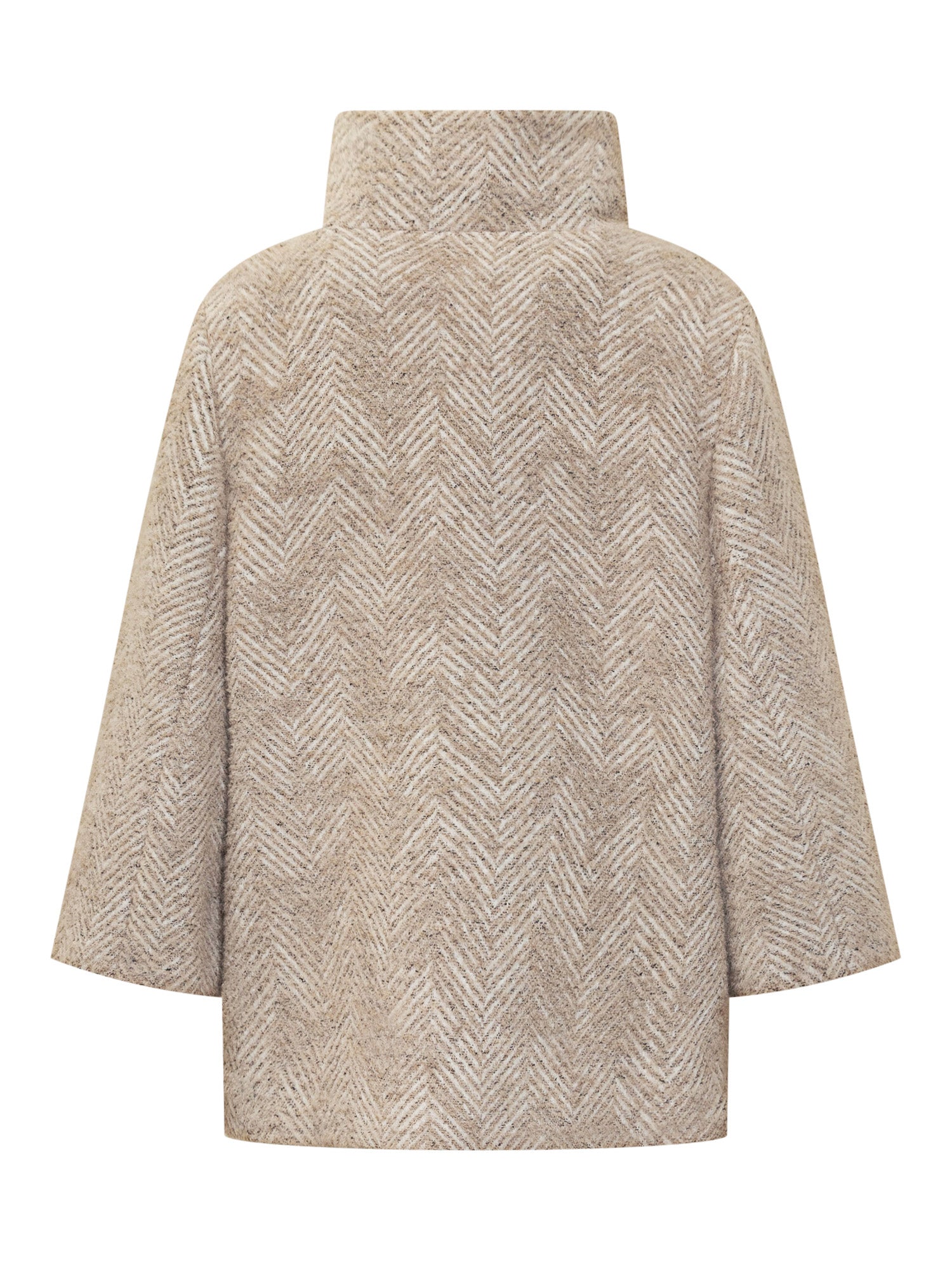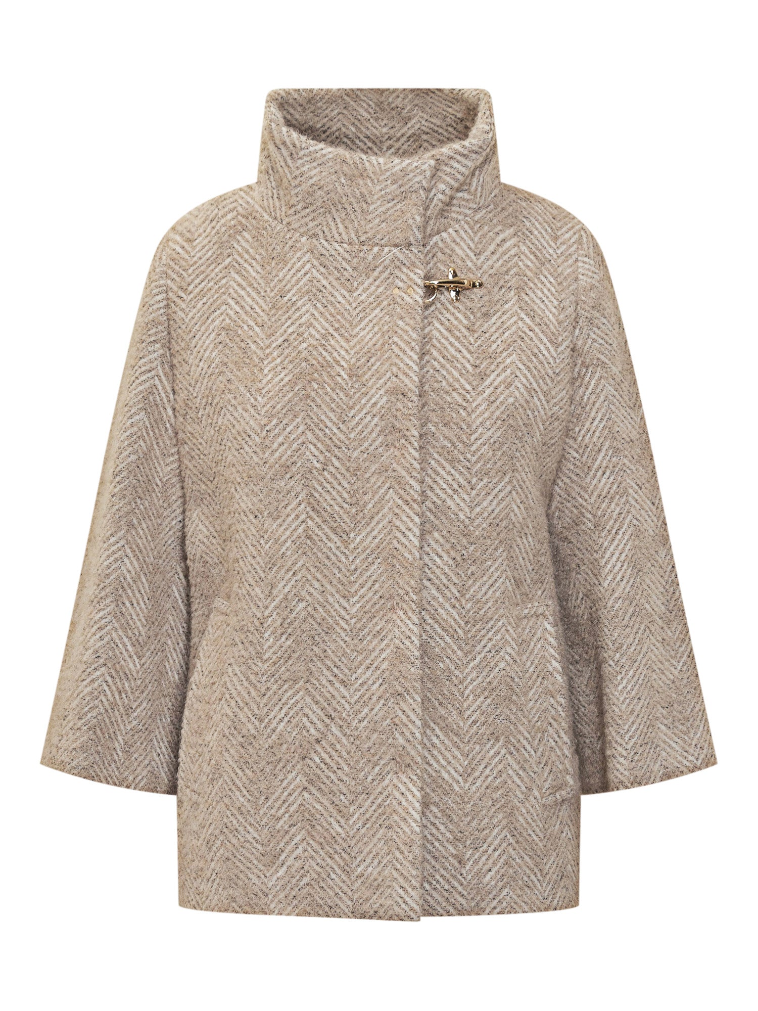 Fay wool cape with beige herringbone pattern. Features a wide silhouette, three-quarter sleeves, and the signature Fay metal hook at the neck.