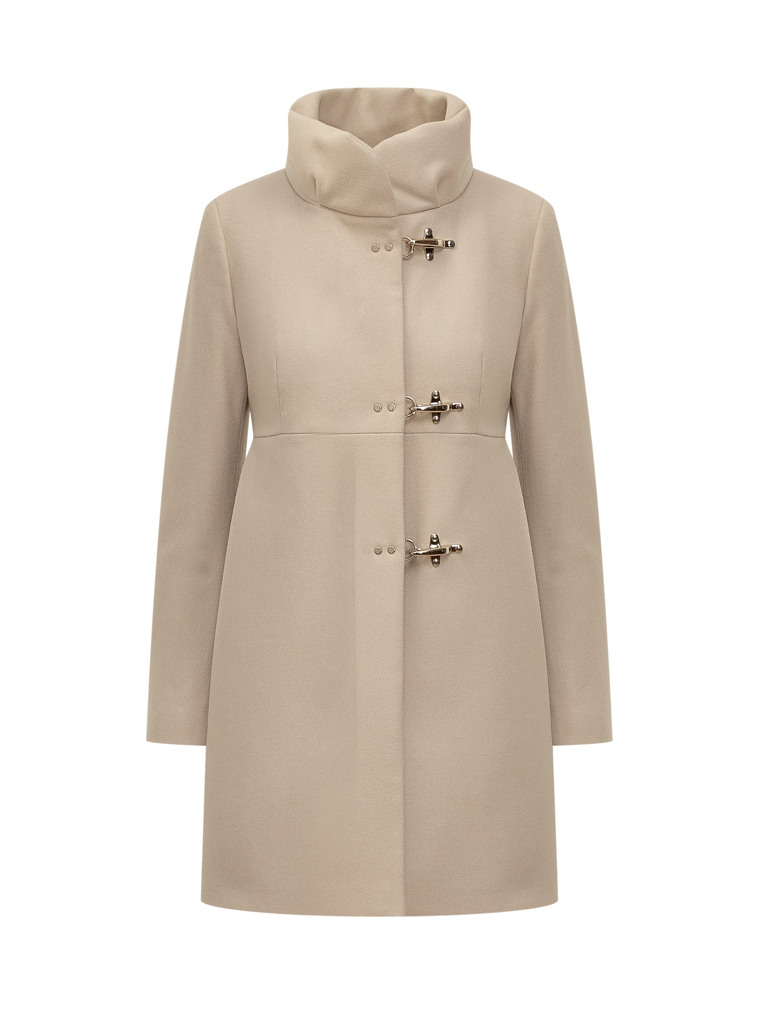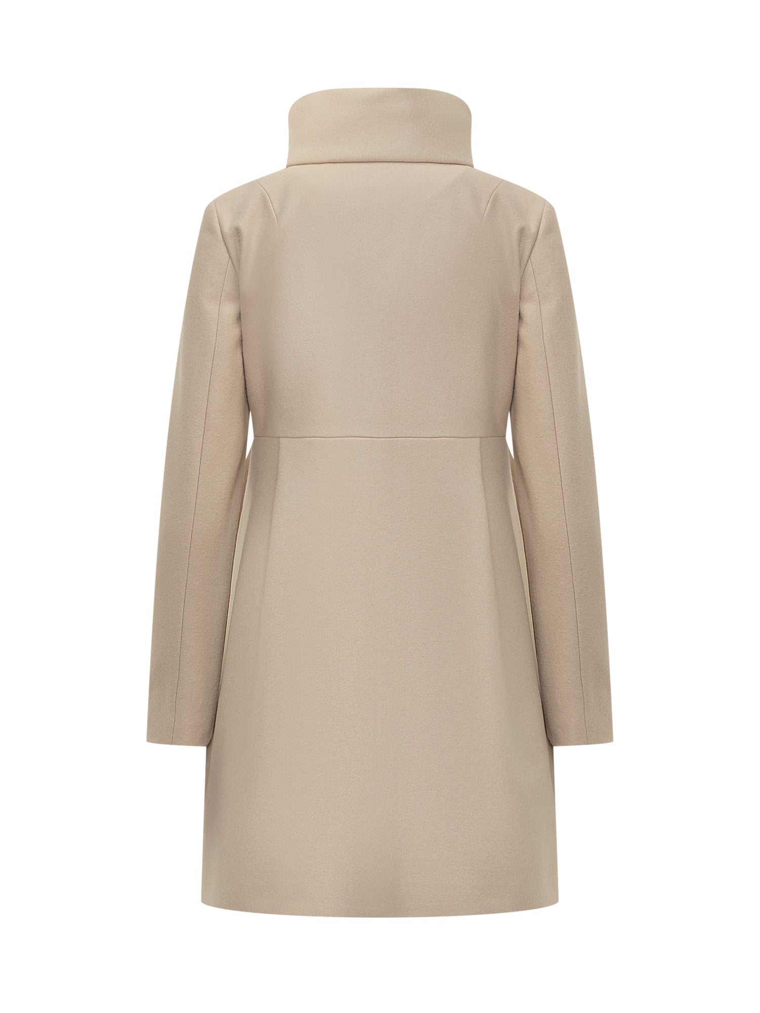 Beige wool coat. High neck. Side pockets. Closure with hooks.