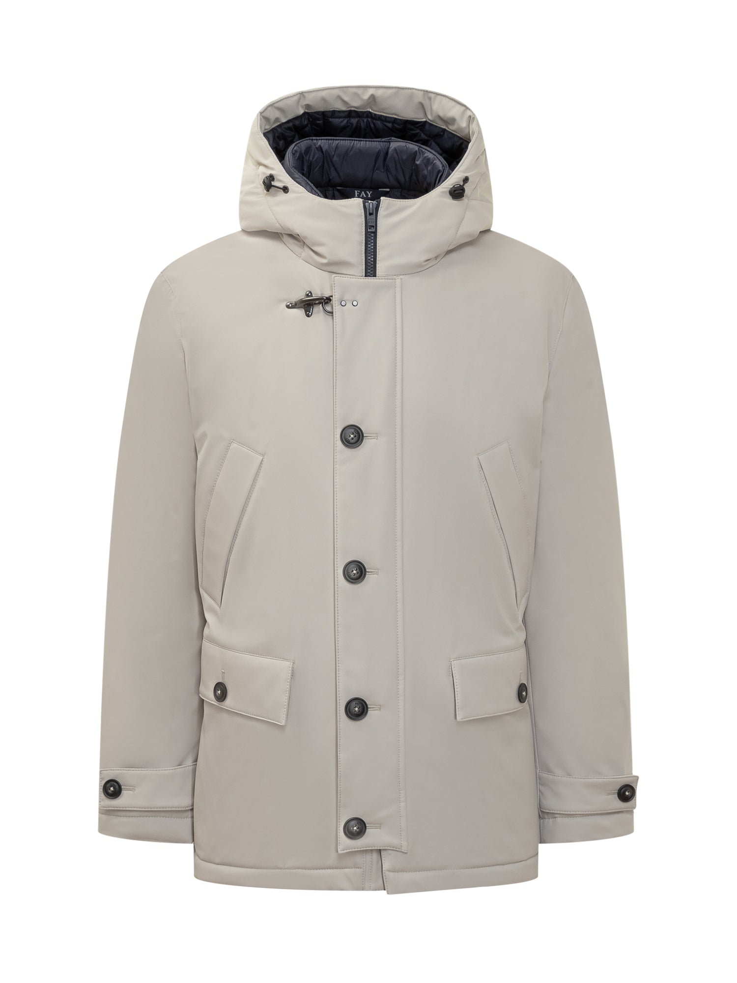 Fay jacket in beige technical fabric with adjustable hood, button and zip closure.
