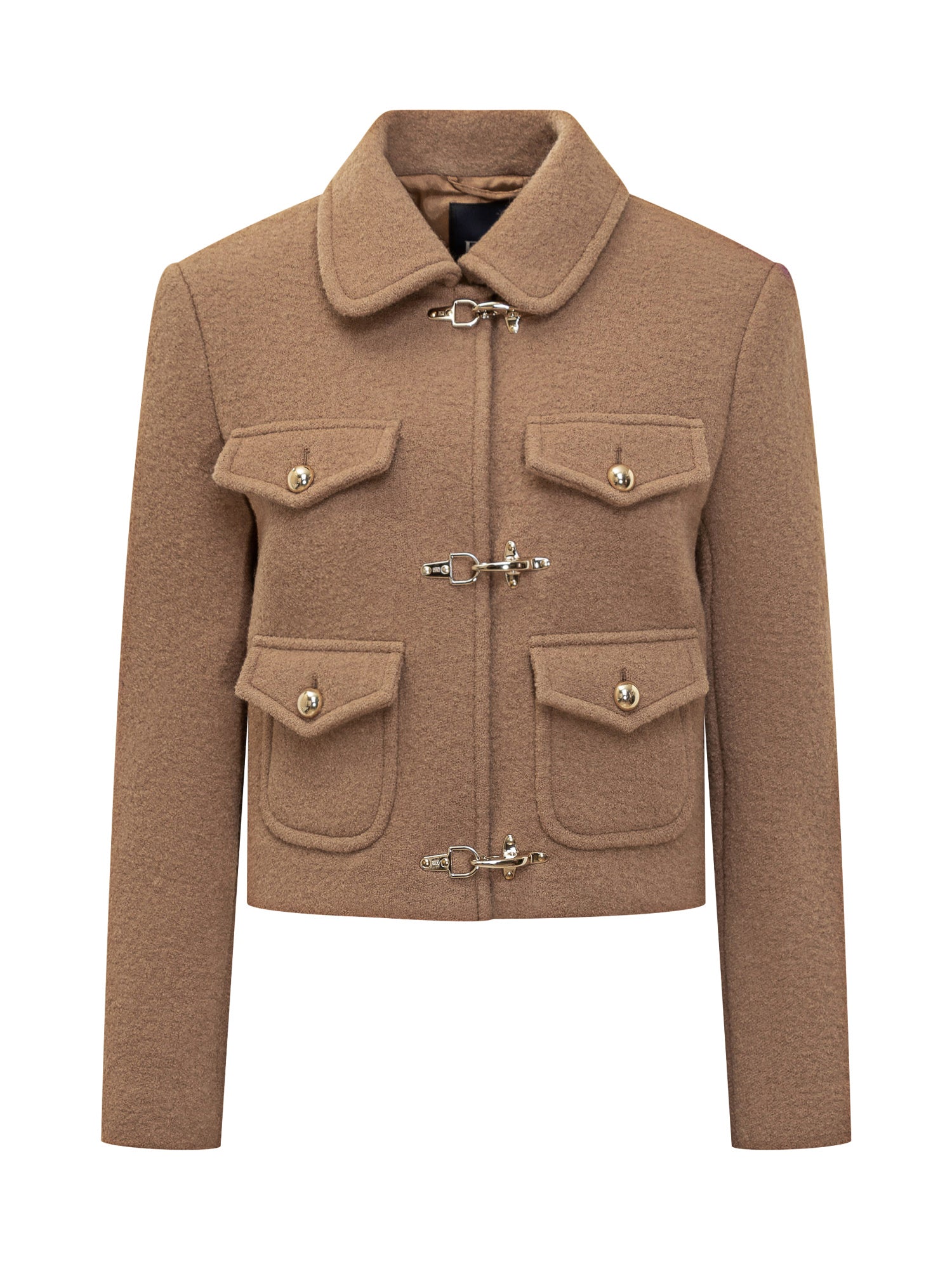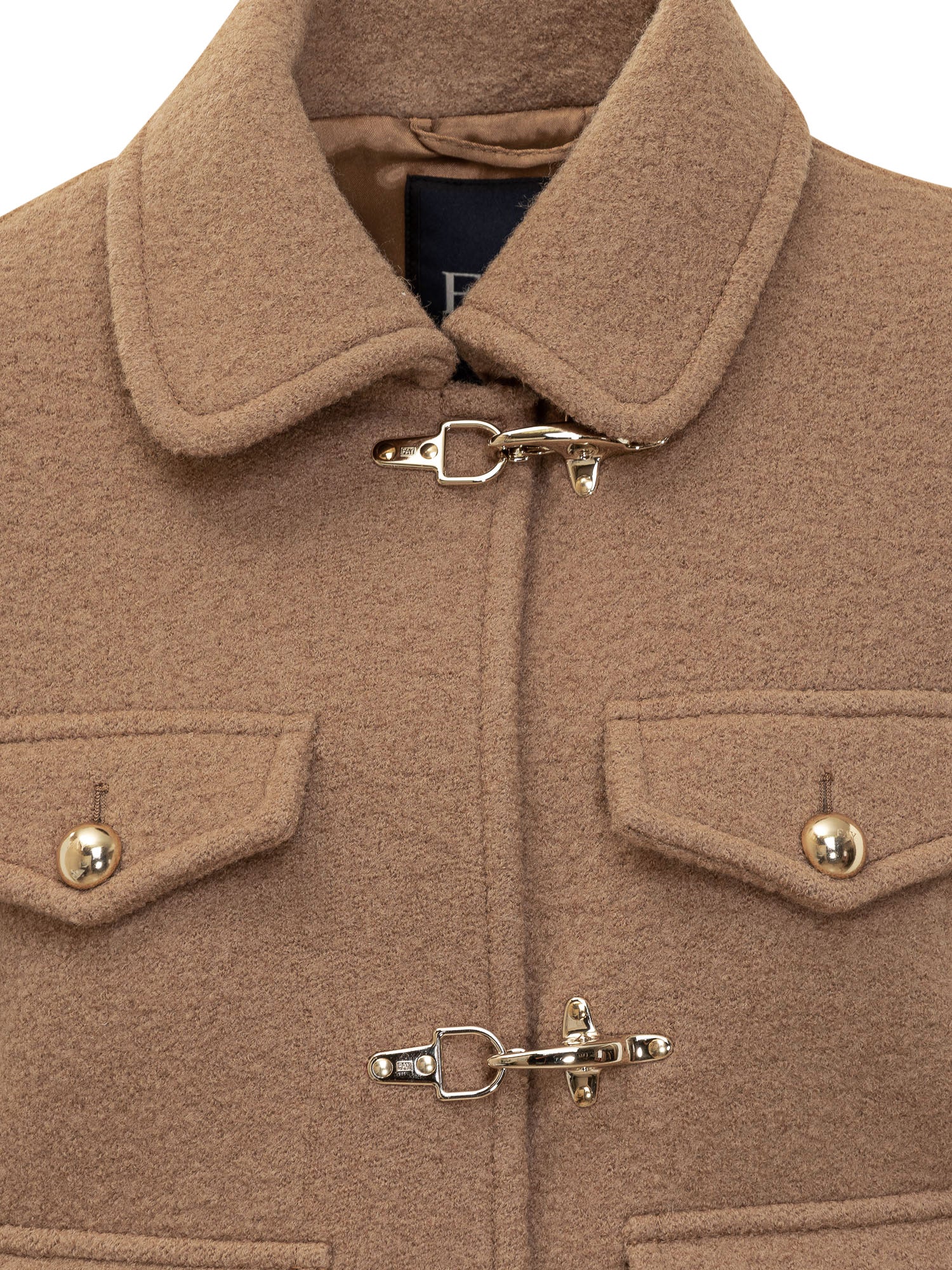 Camel wool Fay jacket with iconic metal hooks and four flap pockets.