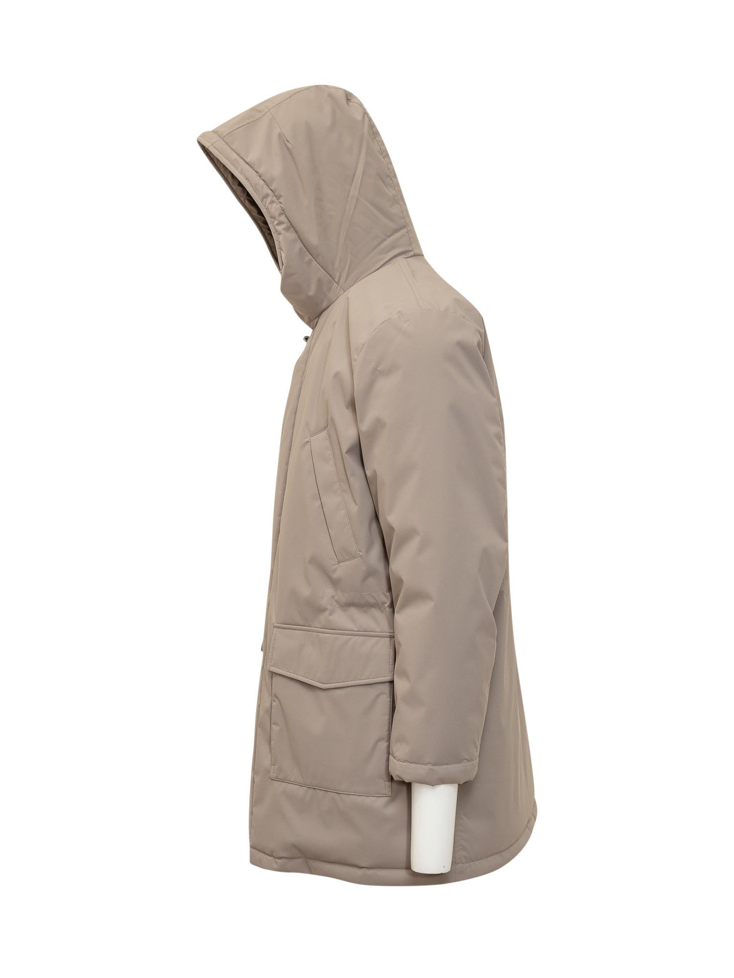 Beige padded parka with hood. Two chest pockets. Two flap pockets on the front. Zip and hook closure.