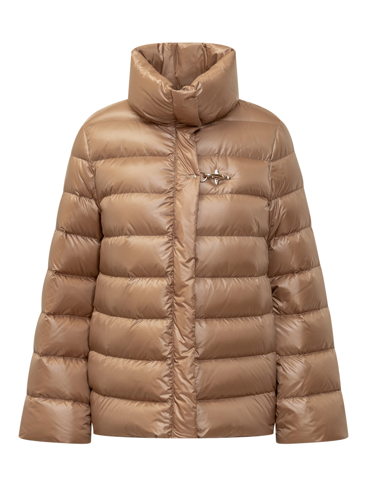 Brown down jacket. High neck. Zip pockets on the side. Closure with zip and hook.