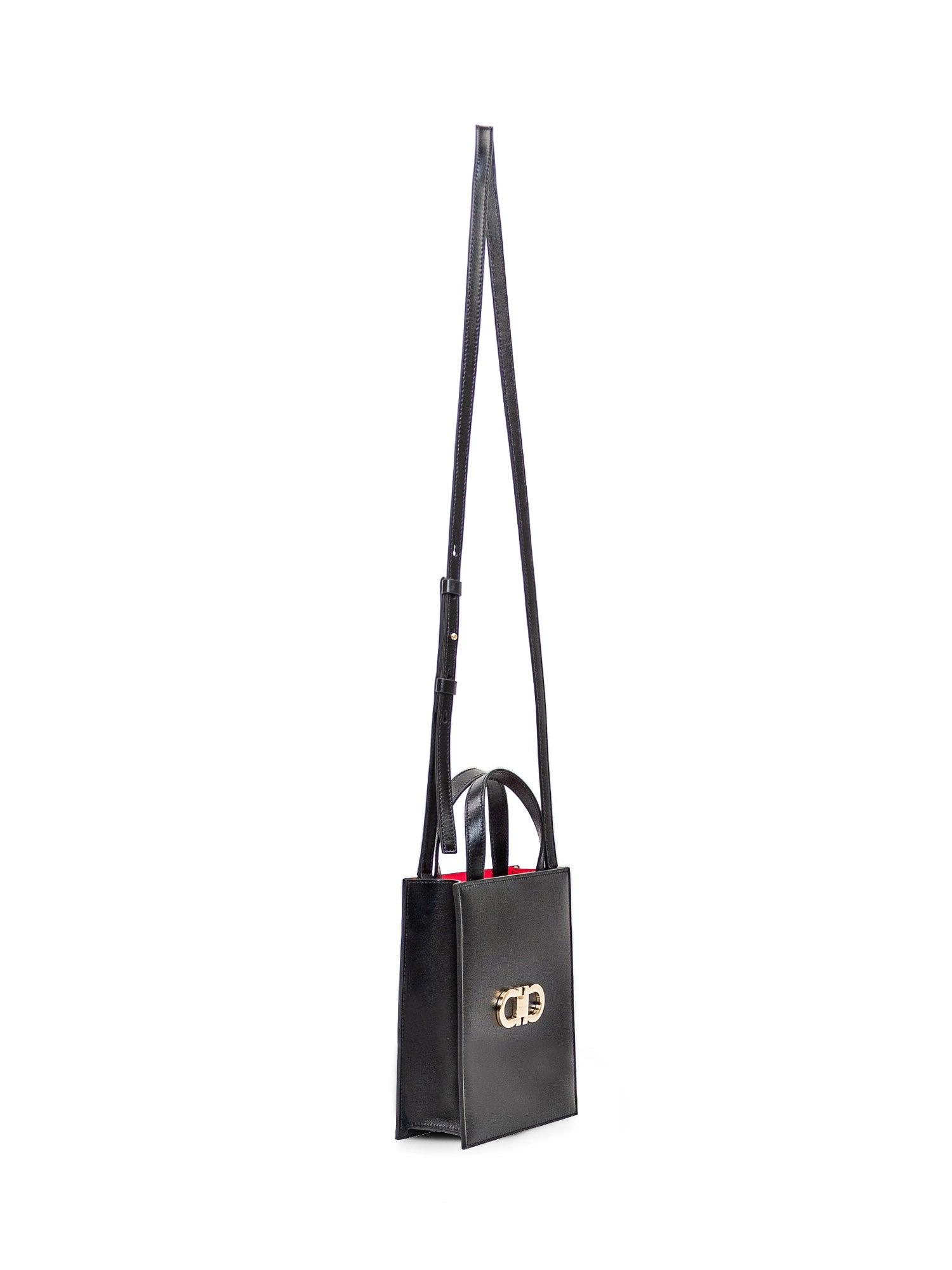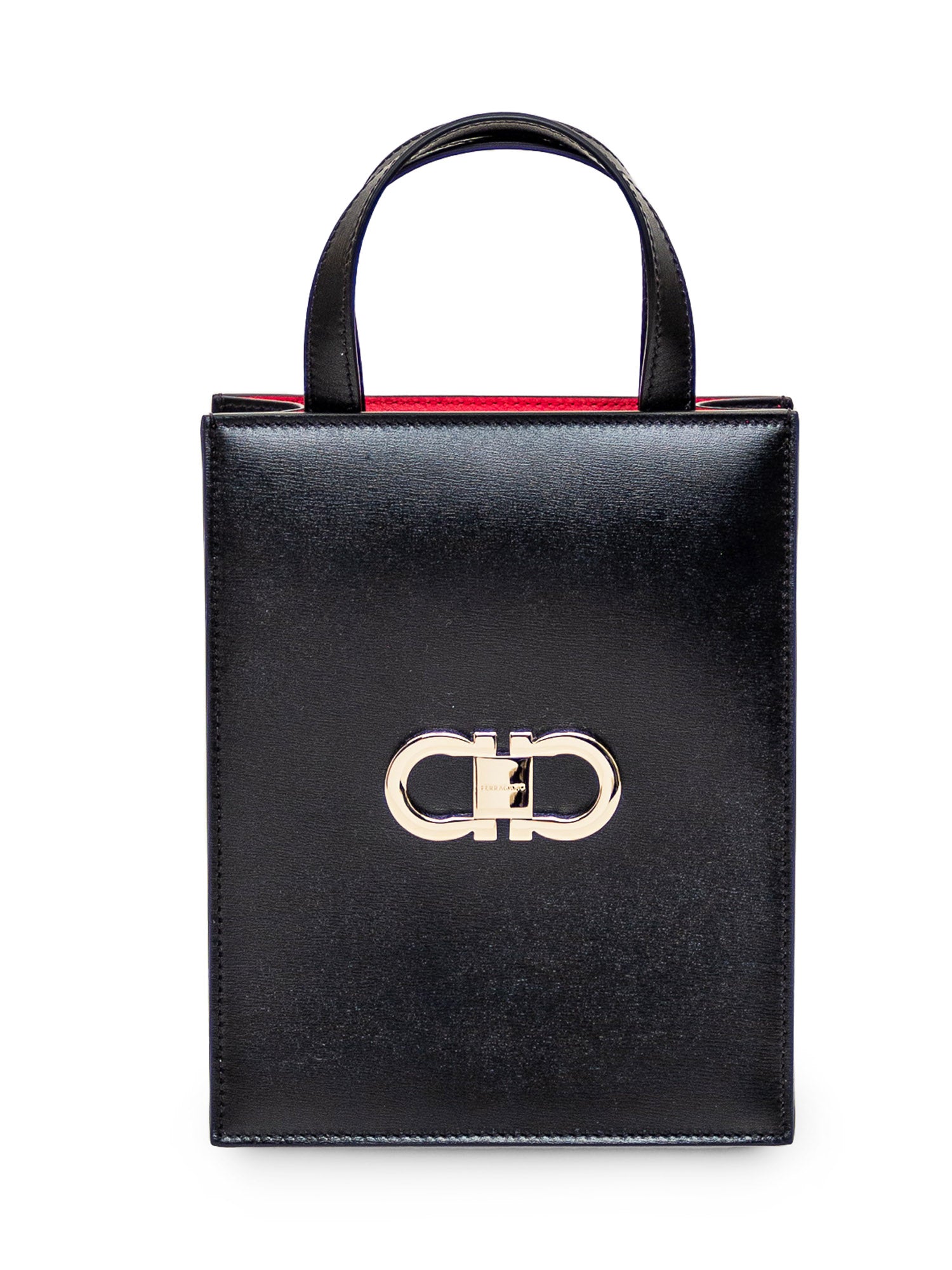 Black leather tote bag. Two handles. Adjustable and removable shoulder strap. Magnetic button closure. Gold metal Gancini logo on front.