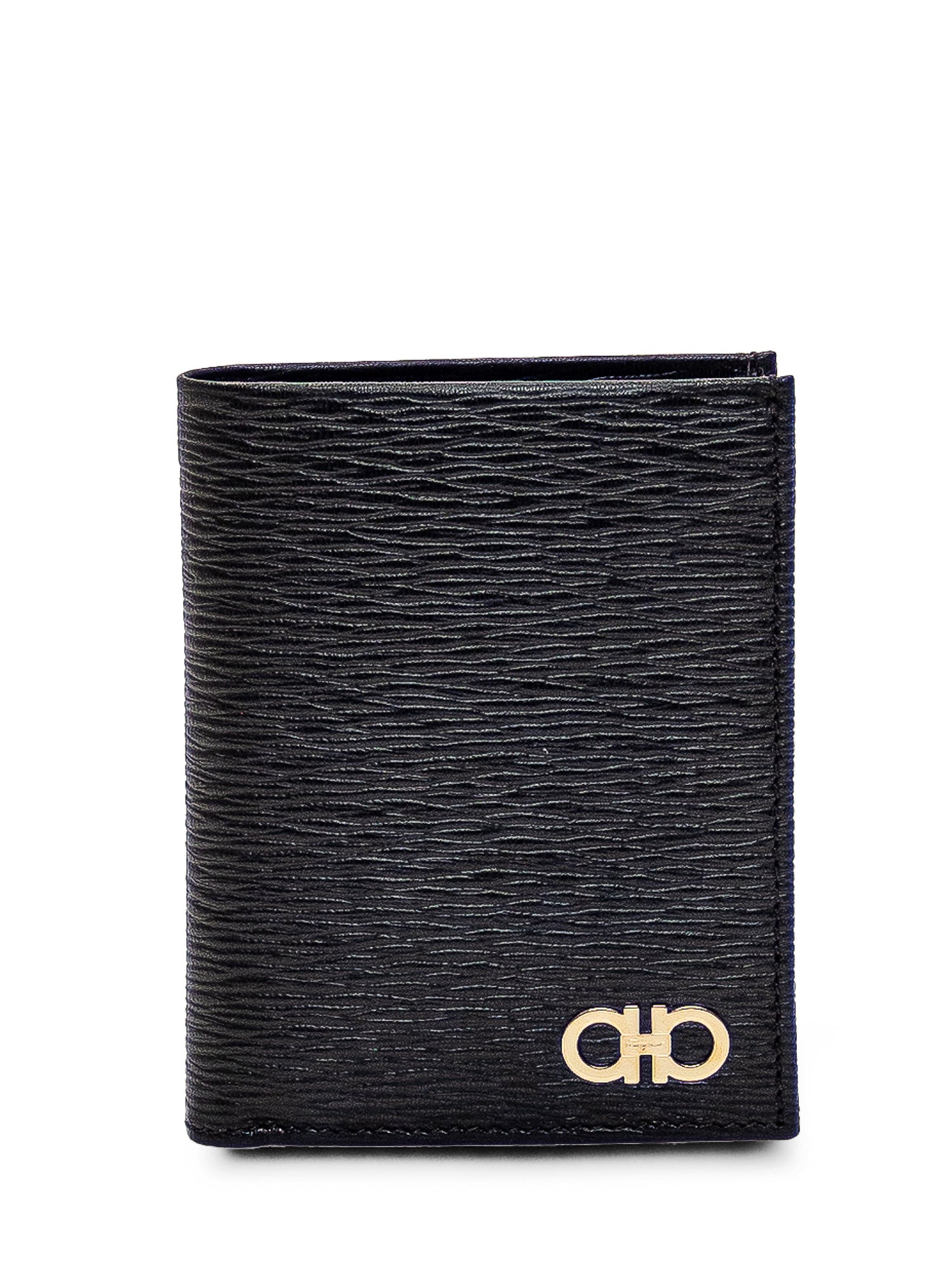 Black leather wallet. Interior compartments for credit cards and bills. Metal Gancini logo on front.