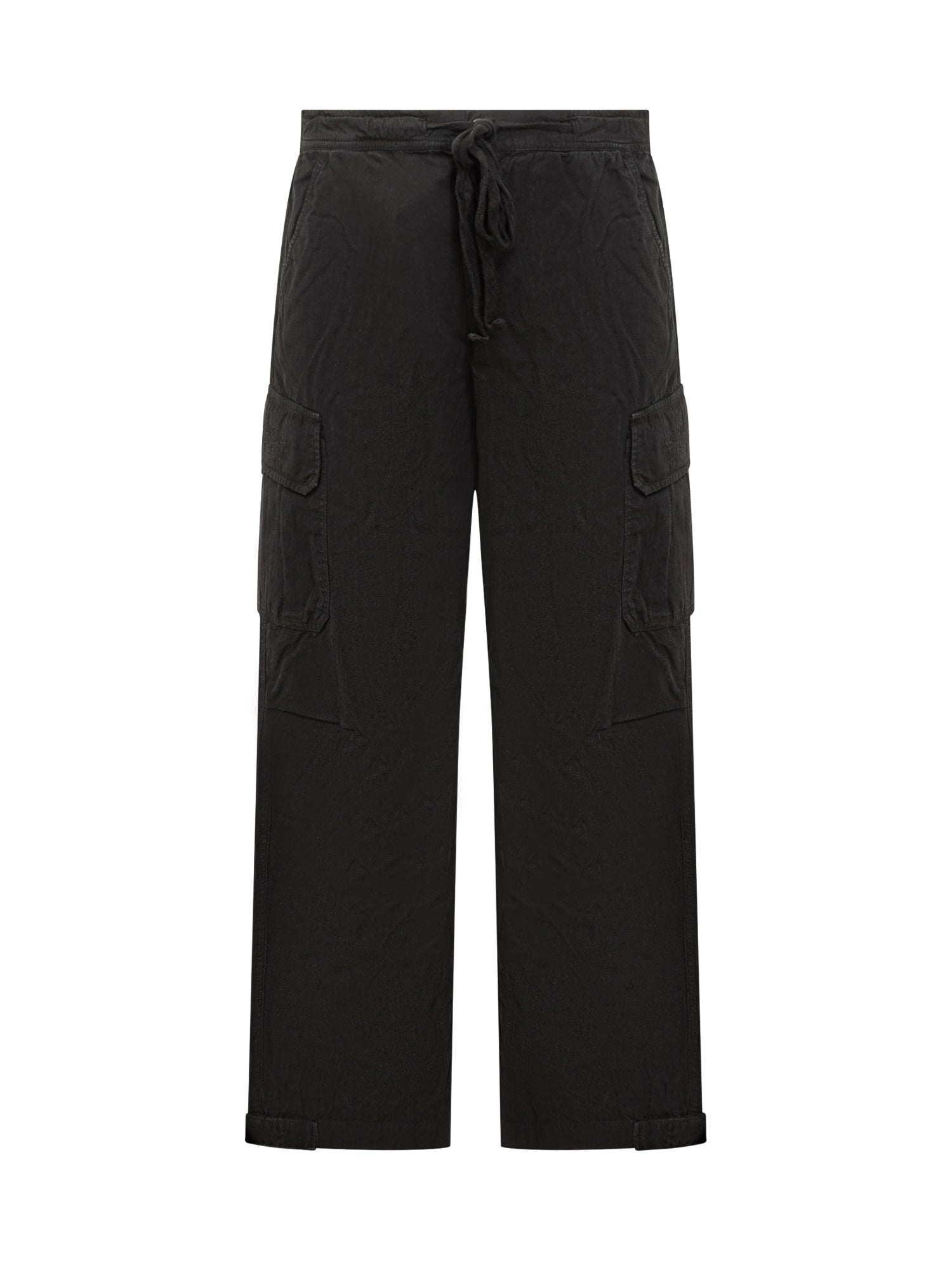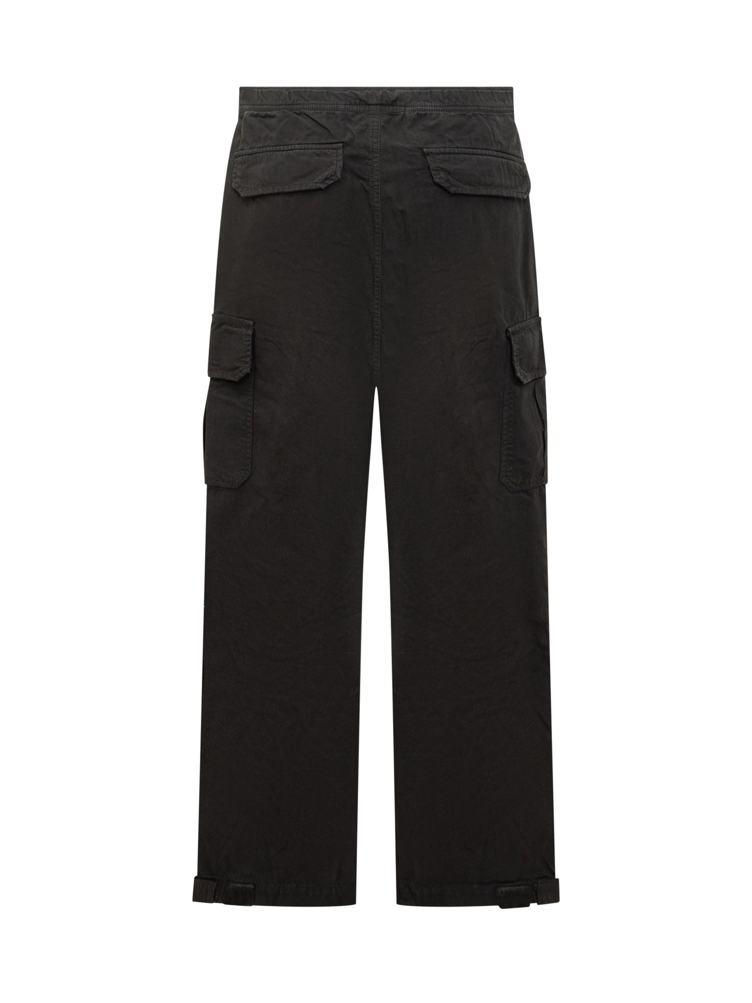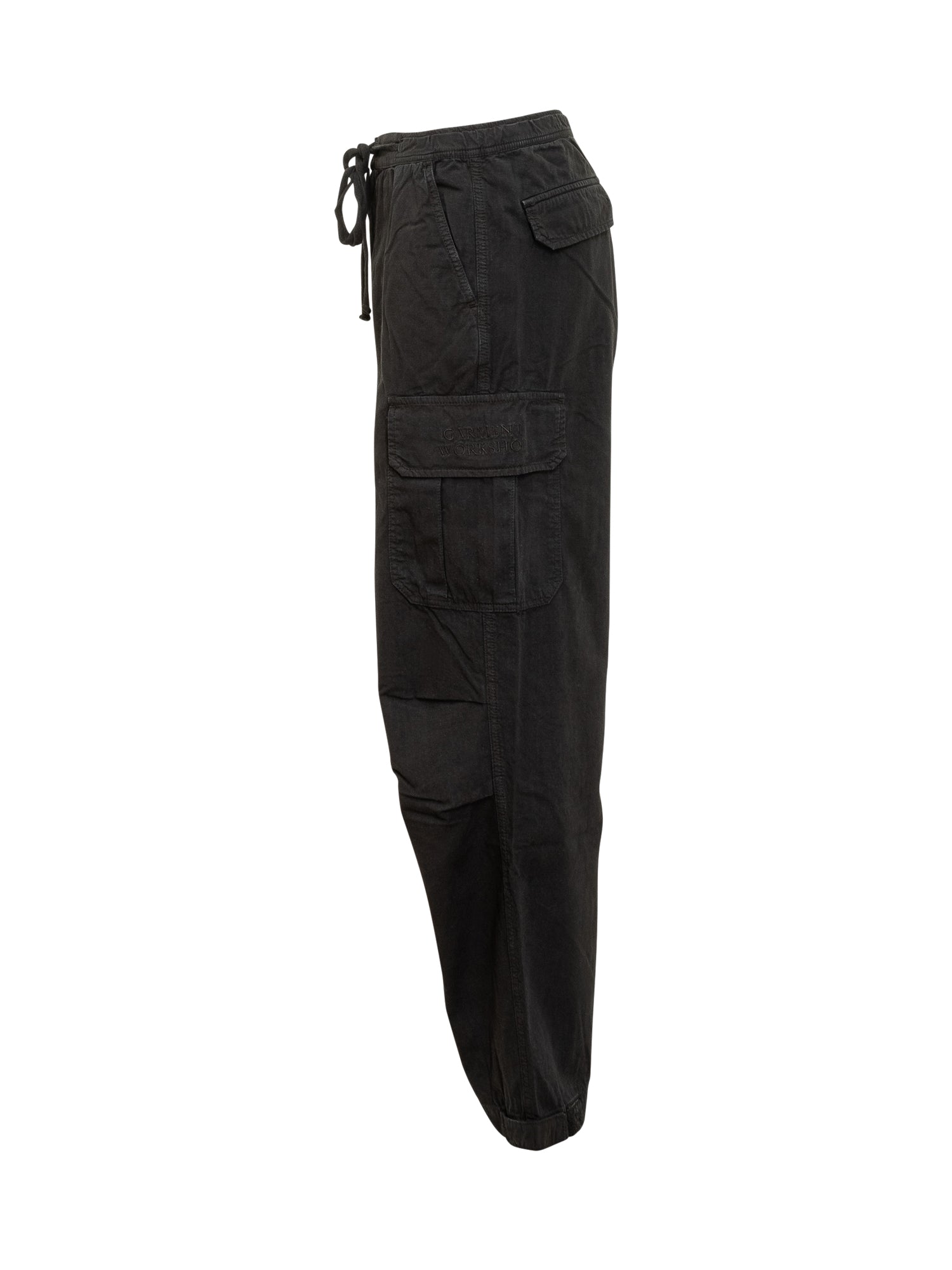 Black cotton trousers. Cargo model. Pockets with flap. Zip closure, button and drawstring. Adjustable bottom width.