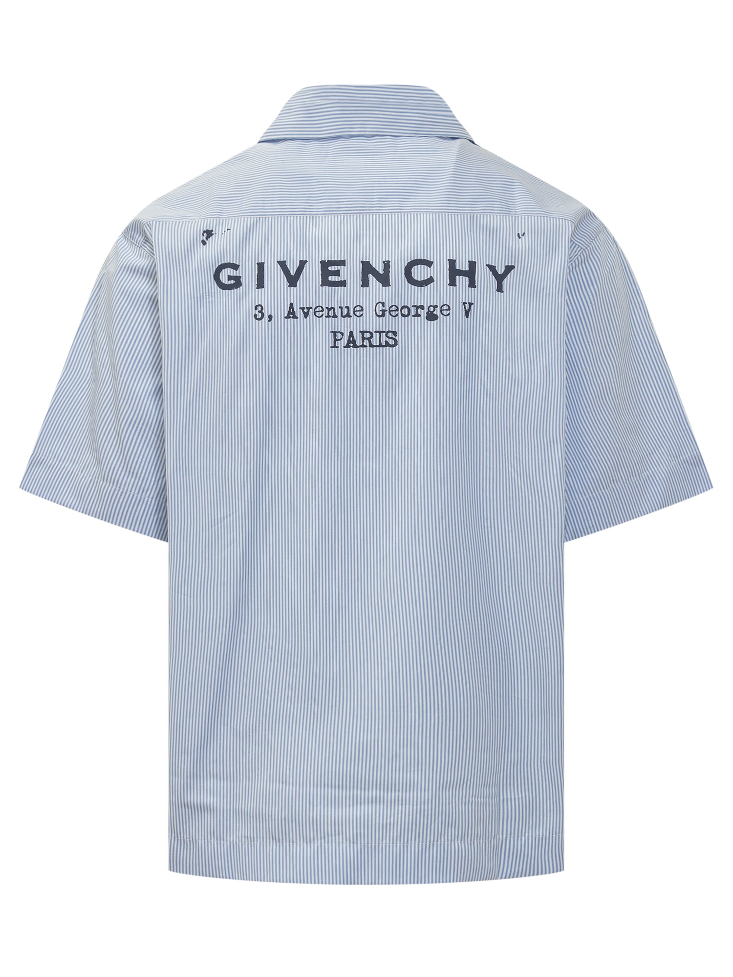 Givenchy short-sleeved shirt with blue and white stripes, Cuban collar, and front button closure.