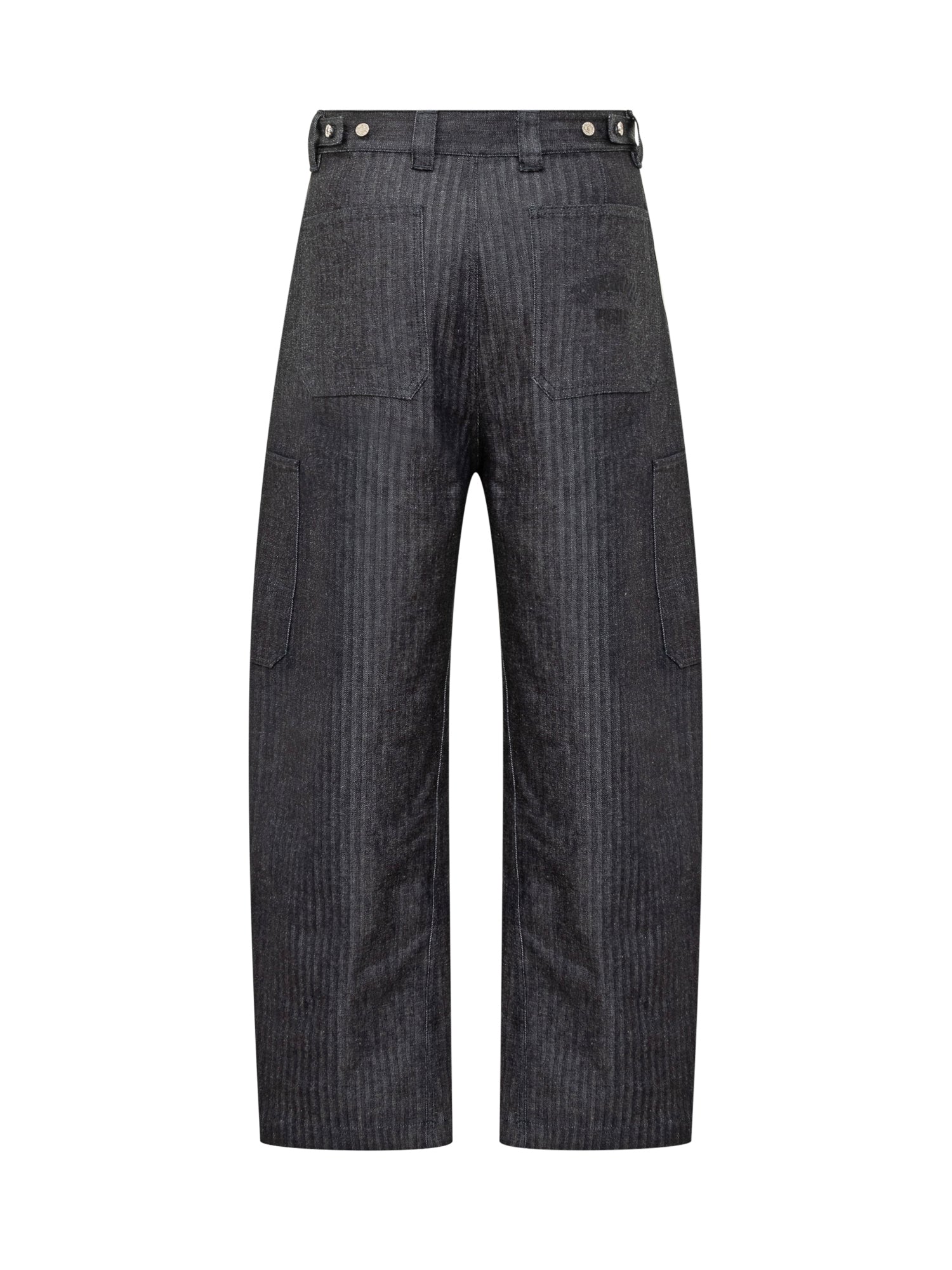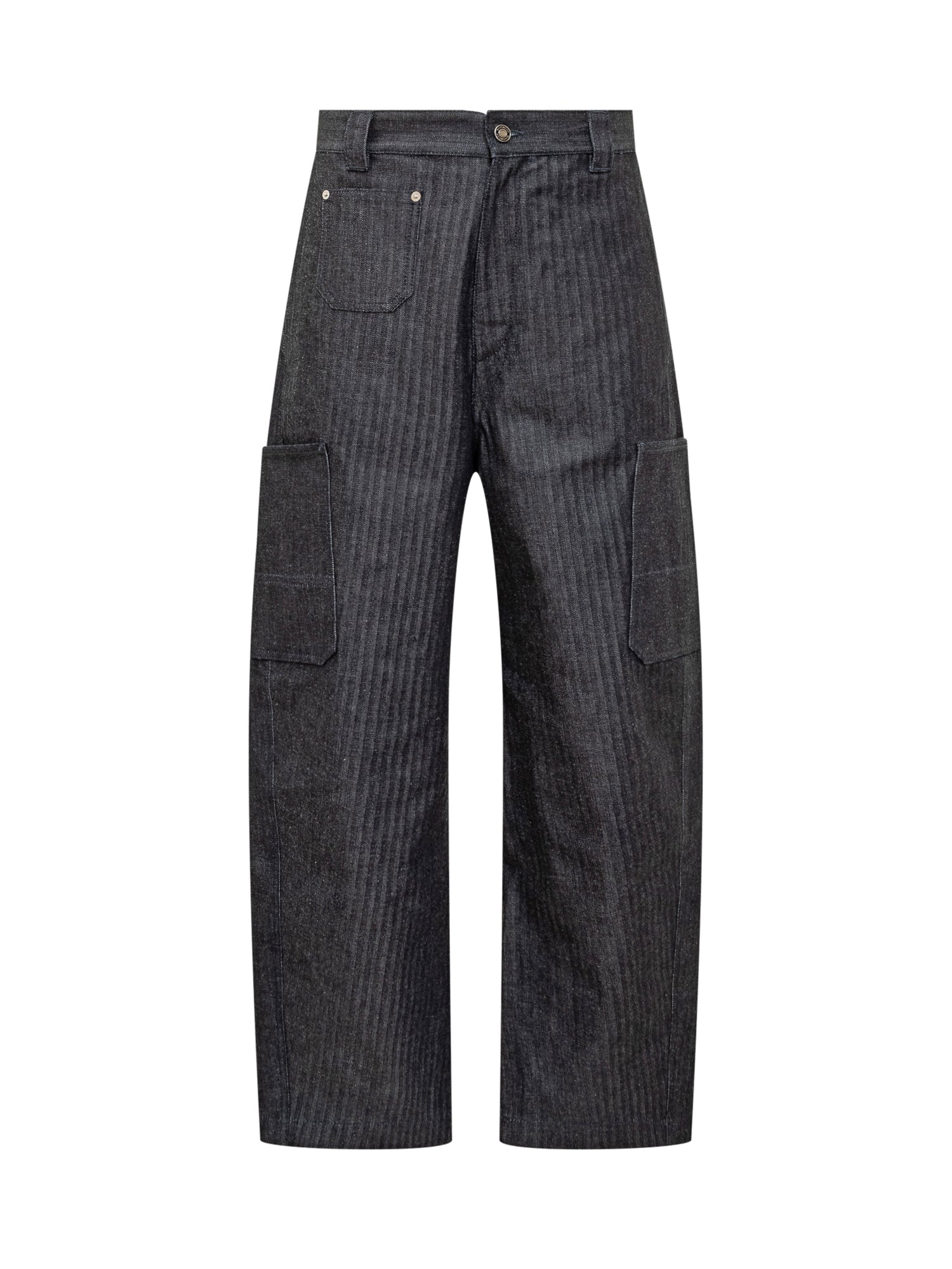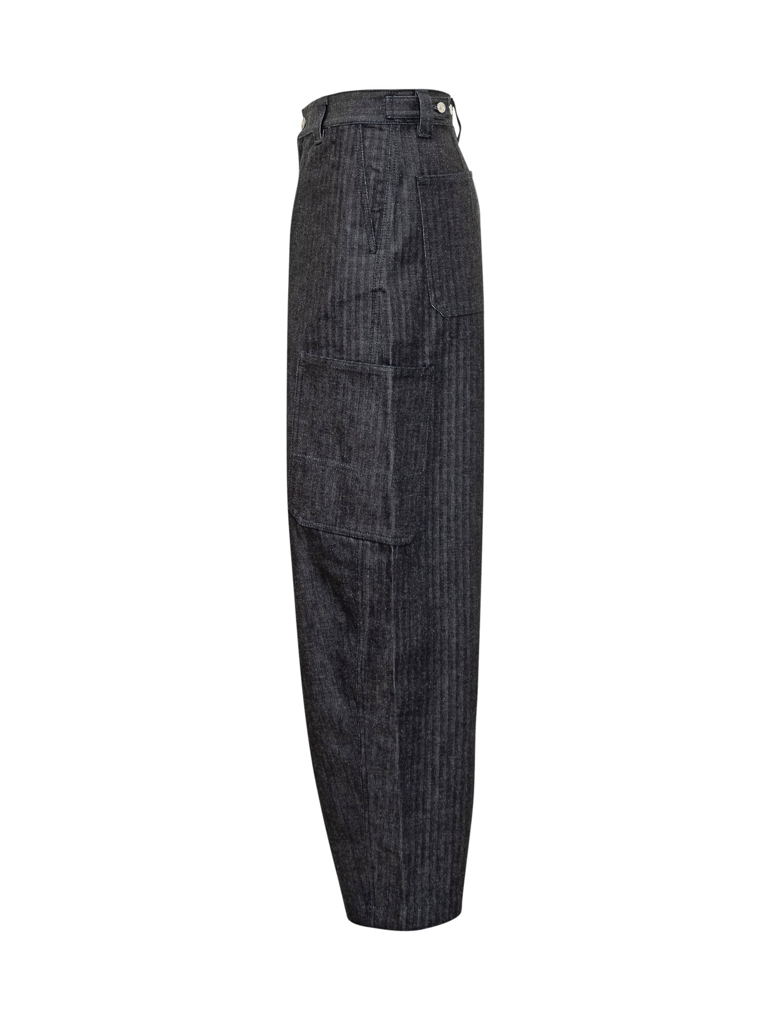 Givenchy cargo pants in striped grey denim. Wide-leg fit with side pockets and tailored details. Button and zip closure.