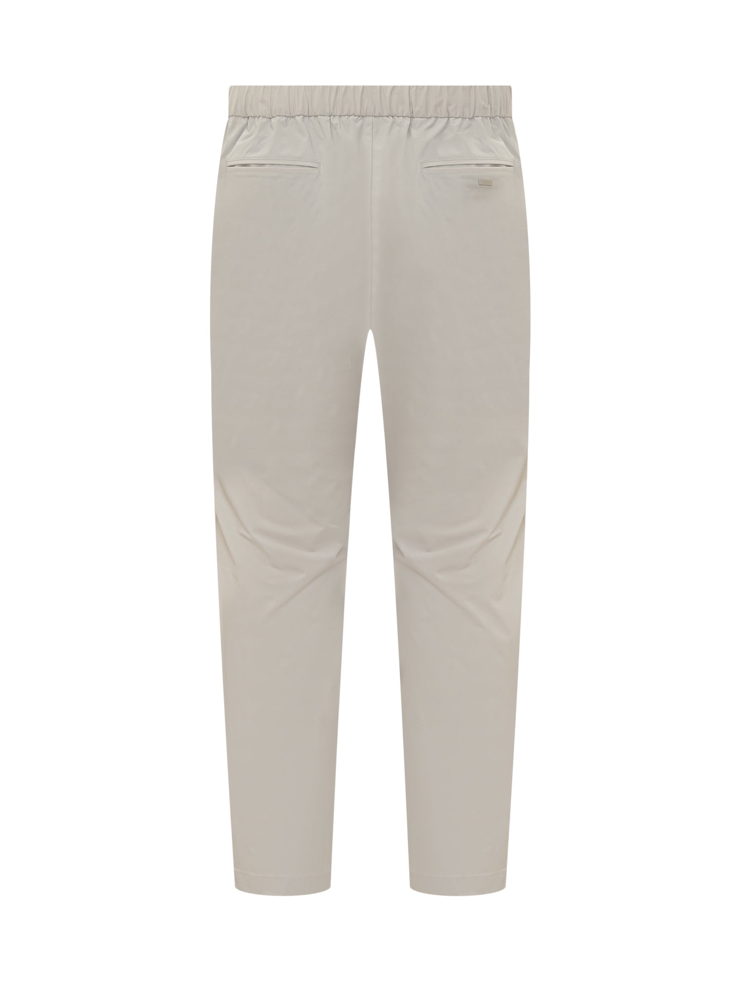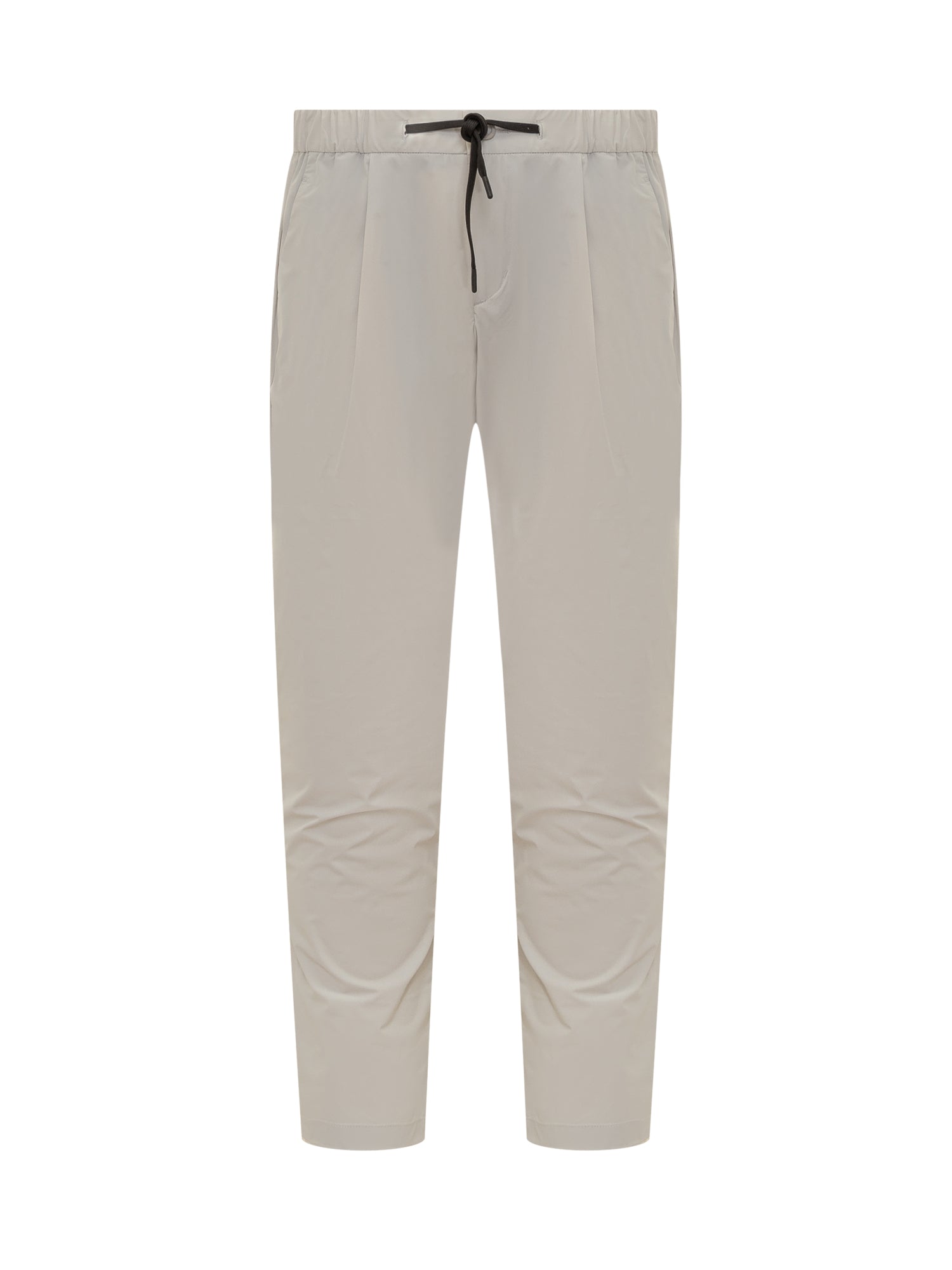 Carrot fit pants. Elasticized waistband with drawstring. Two slanted pockets on front. Two welt pockets on back. Logo patch on the back.