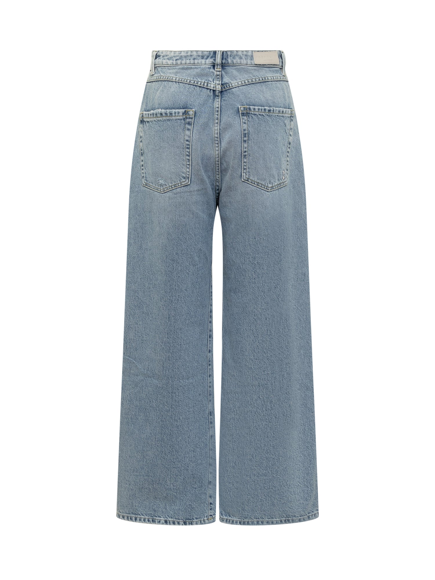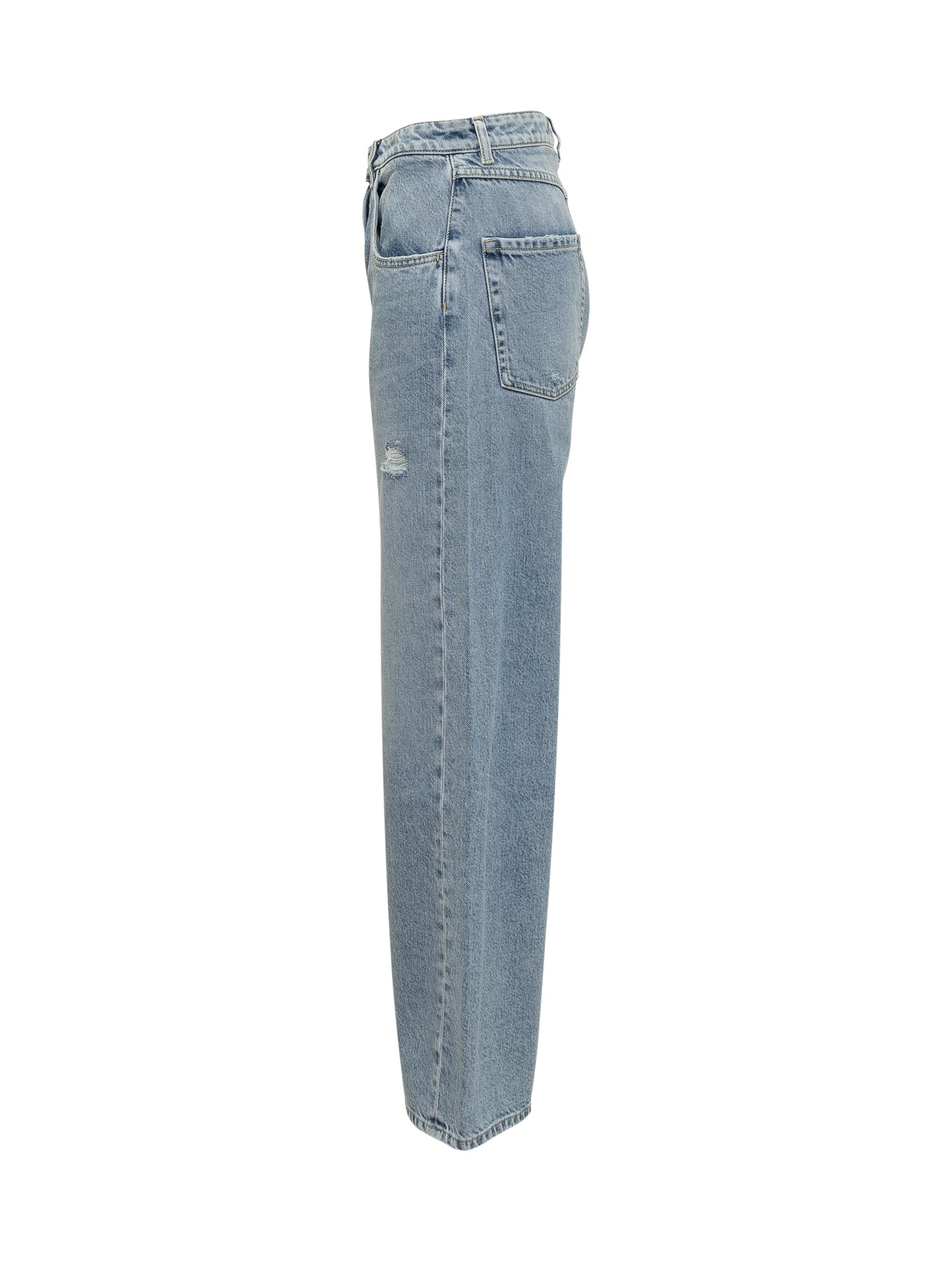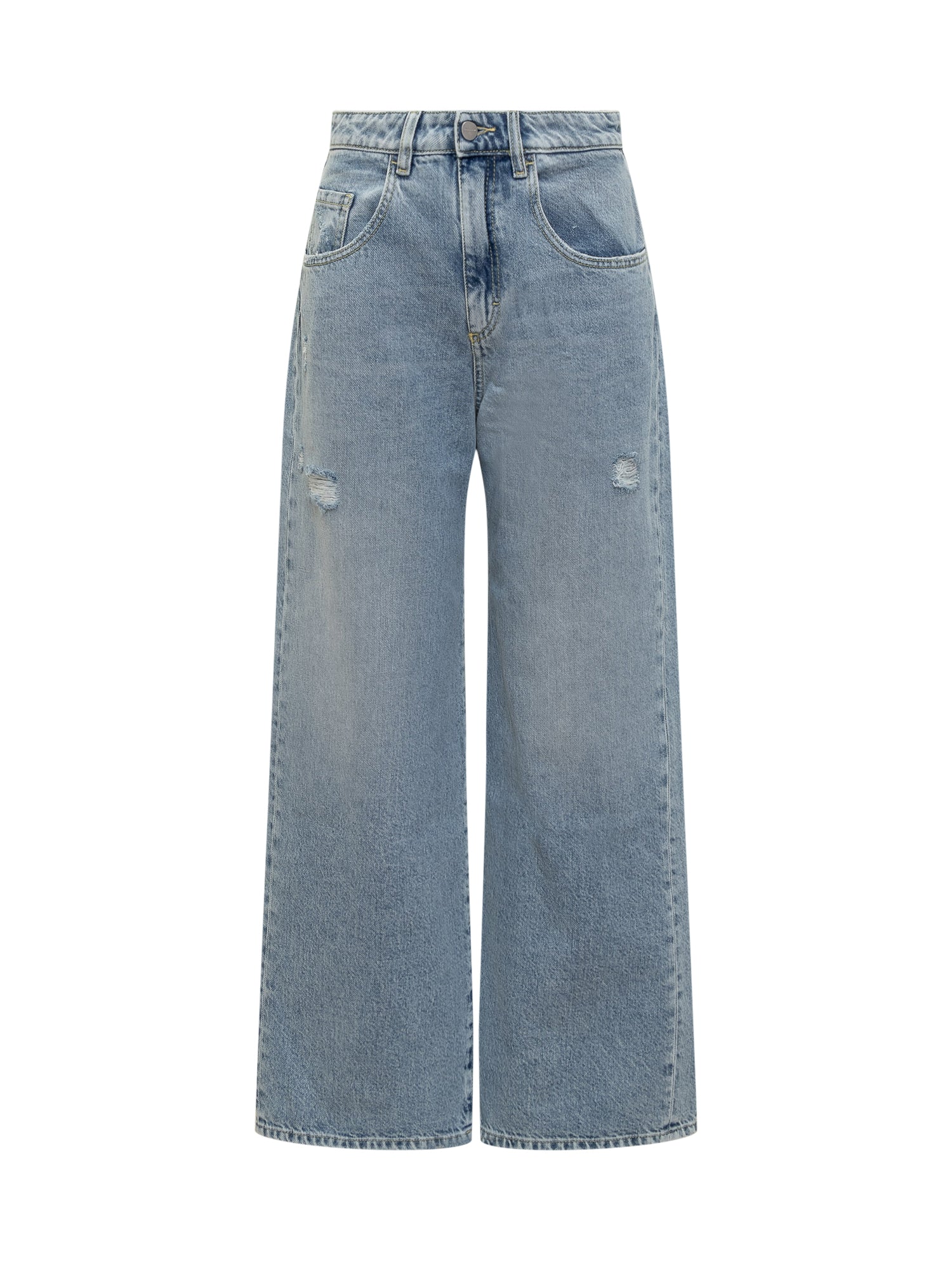 Wide leg long jeans. Button and zipper closure. Belt loops. Five pockets. Worn effect on front.