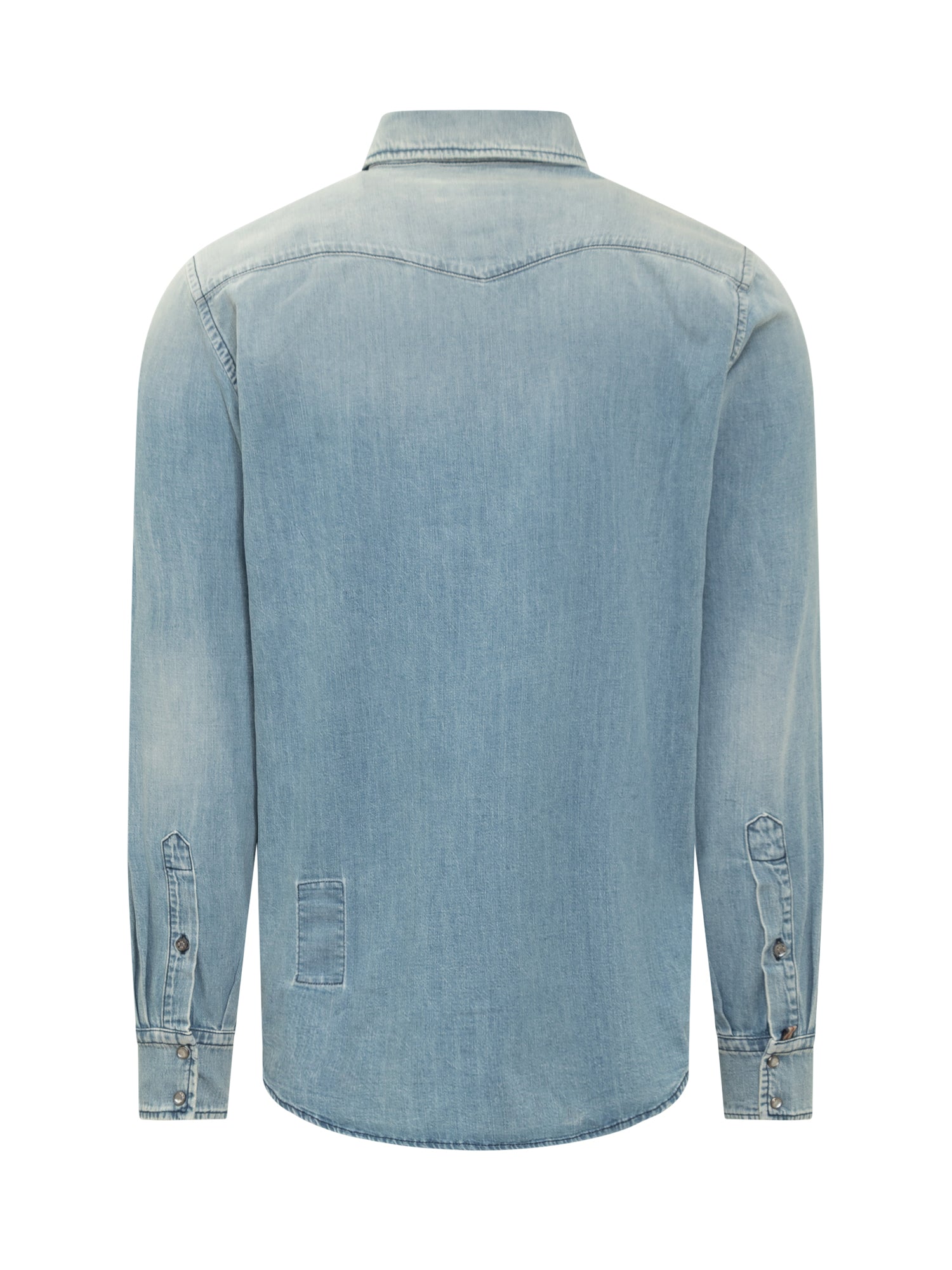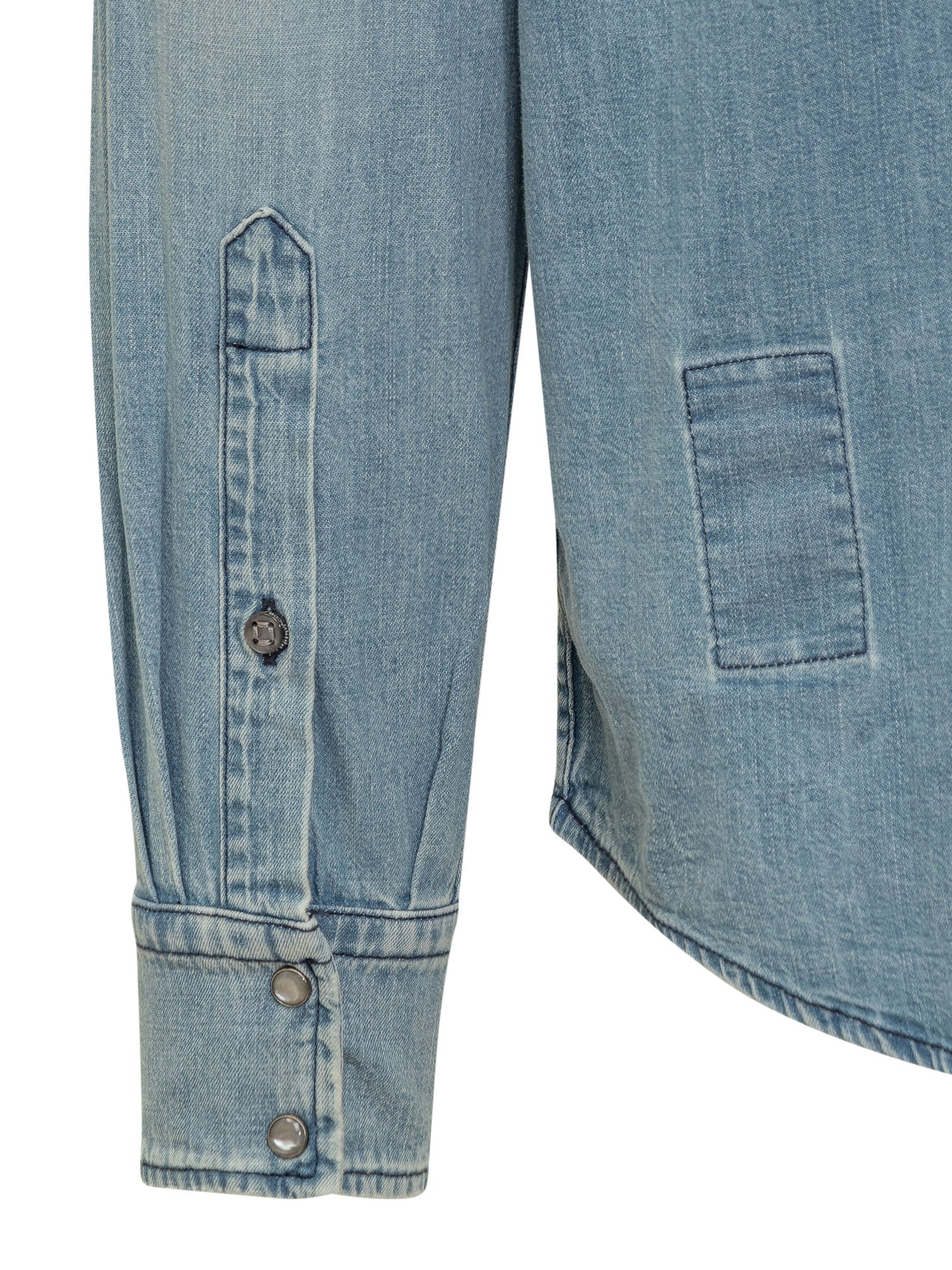 Long-sleeved denim shirt. Classic collar. Button closure. Cuffs with buttons. Two pockets on front. Embroidered logo on the front.